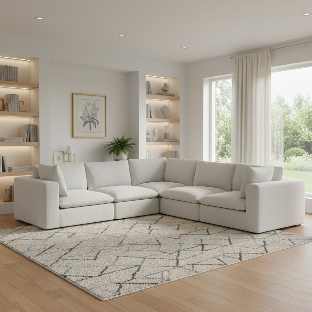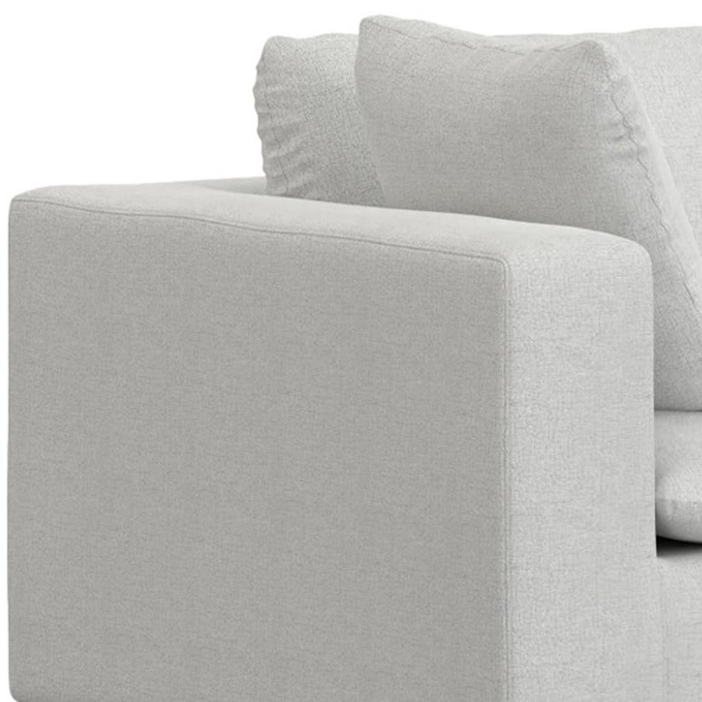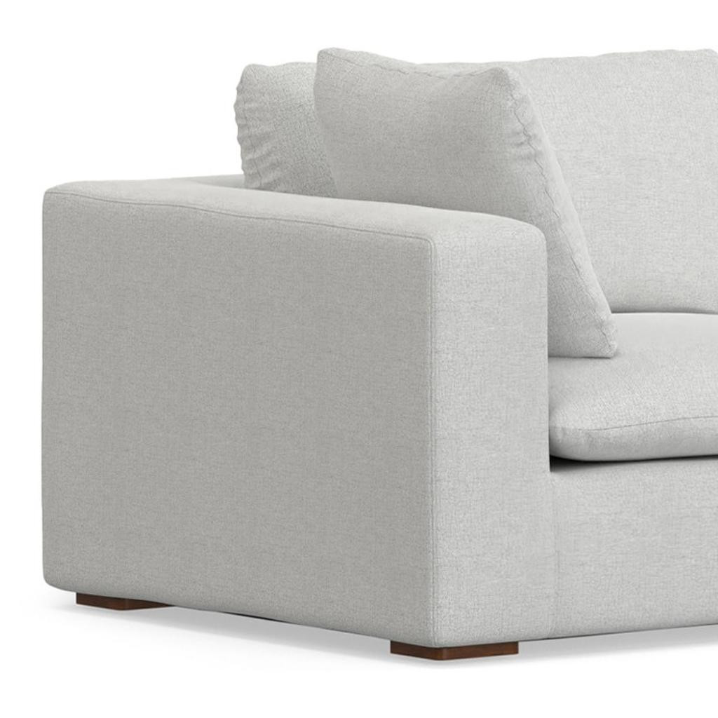 Add an air of fashion to your space with this fabulous 125-inch gray fabric modular sofa with brown legs. Solid colors give you lots of decorative options and are easy to work into your decor scheme. Web suspension construction gives this piece strong support and makes it comfortable to sit even for long periods of time. Removable back cushions make this sofa easy to manage. Fixed arms offer a comfy place to rest. A great showpiece for your room, this sofa is a must have. 32.00-inch h x 124.70-inch w x 124.60-inch d.