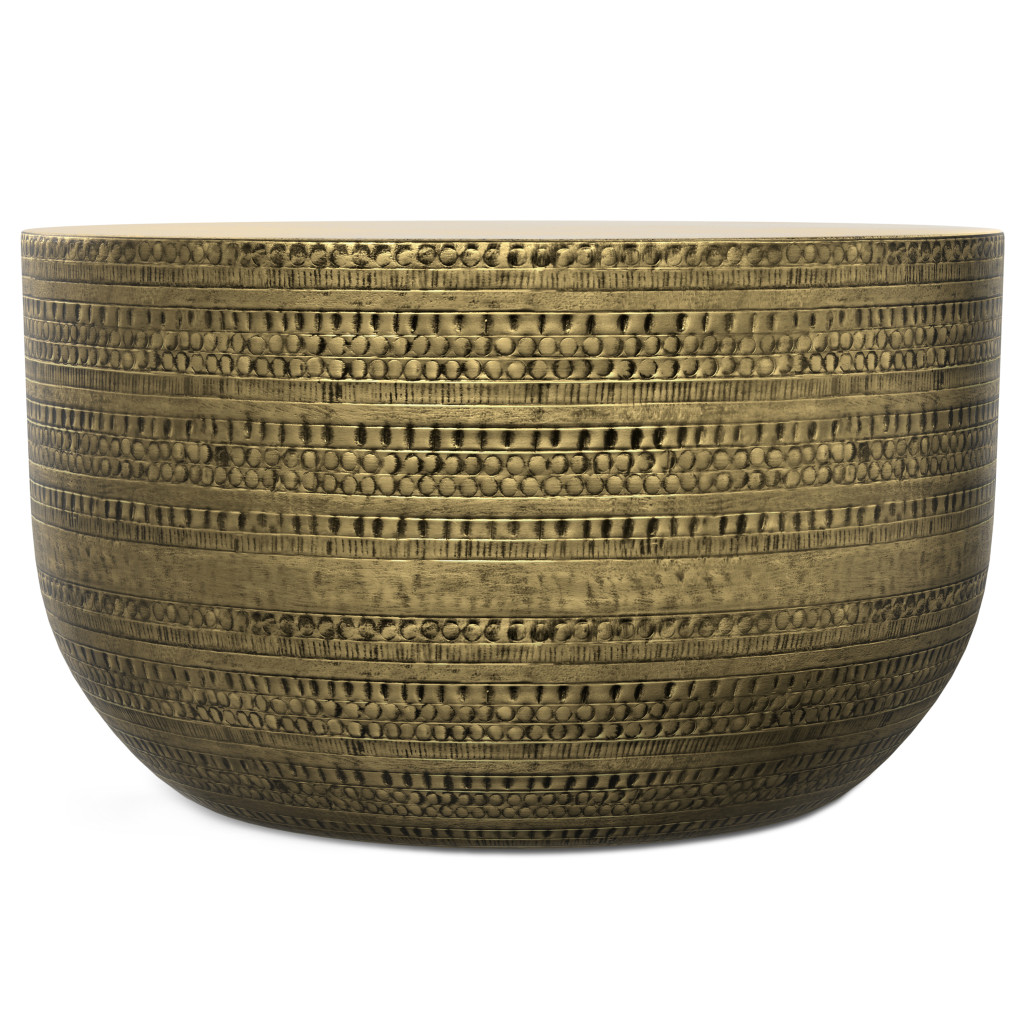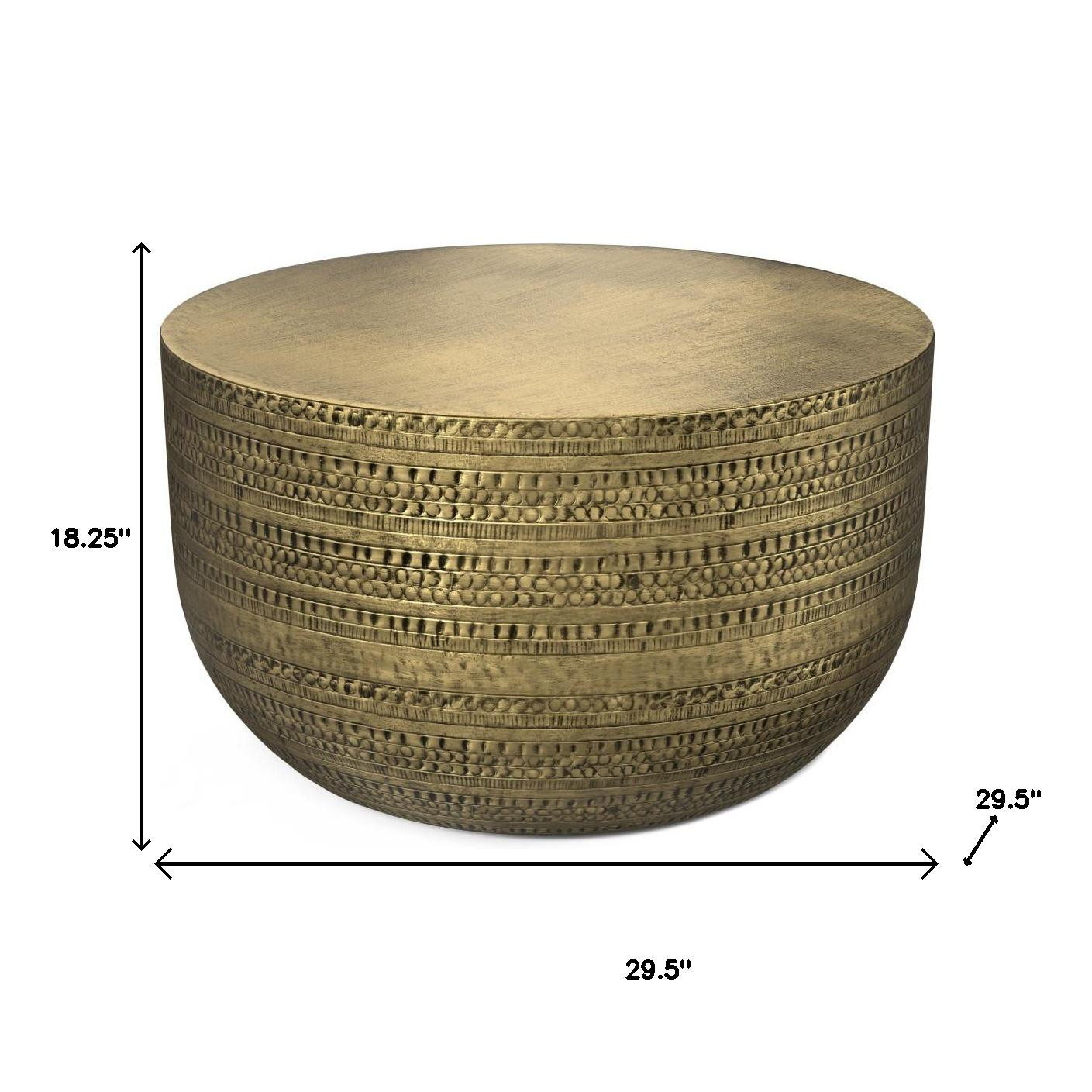 Distinctive in style the 18-inch antiqued gold metal round drum end table radiates a versatile charm. This table features quality construction from metal and an updated monotone color scheme with antiqued gold as the main color on both the top and the base. A great accent on either side of the sofa or bed, this adorable end or side table is just what you need. You can also use it as an entryway table to hold your keys. 18.25-inch h x 29.50-inch w x 29.50-inch d.