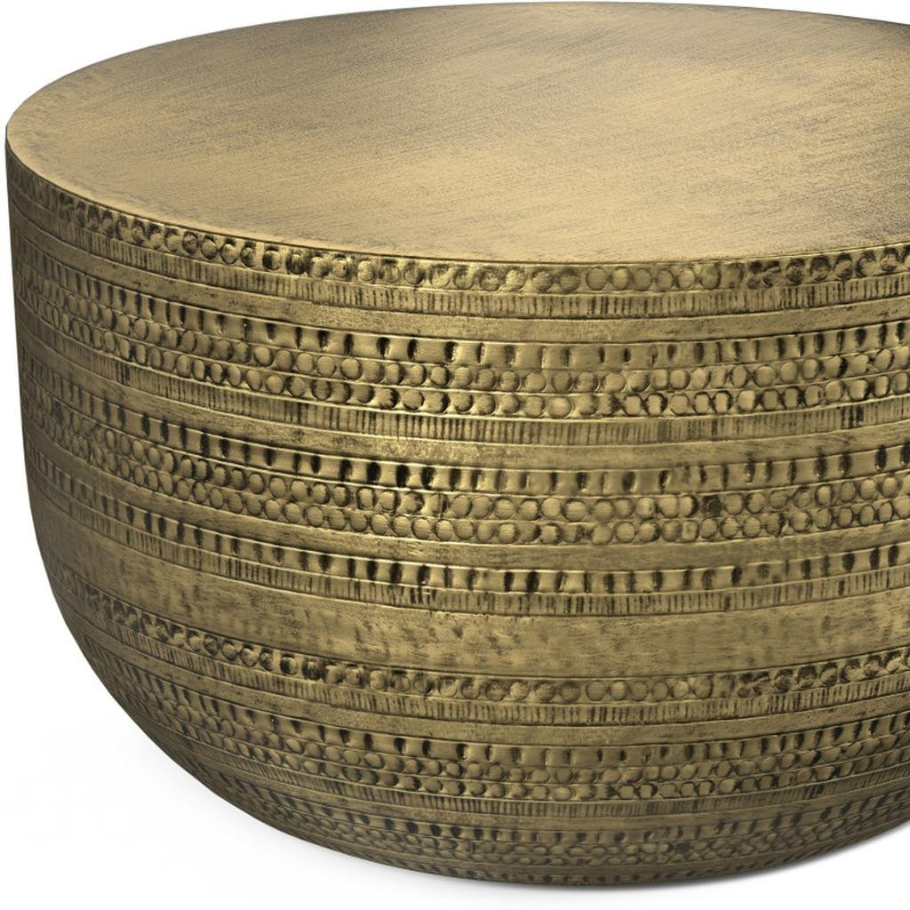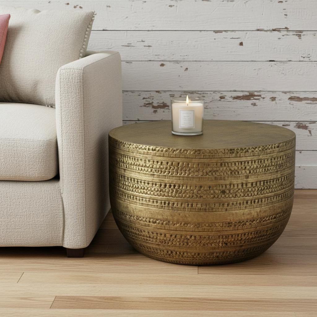 metal round drum end table, round drum end table, drum end table, antiqued gold metal round drum, gold metal round drum end |