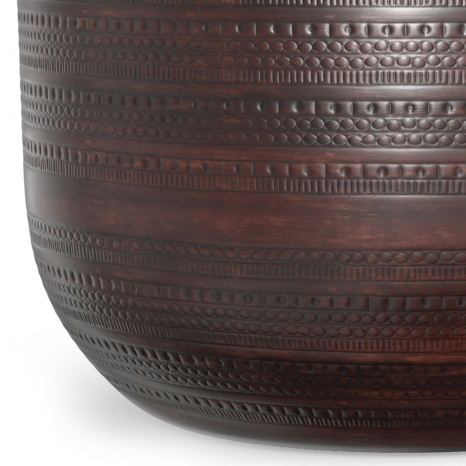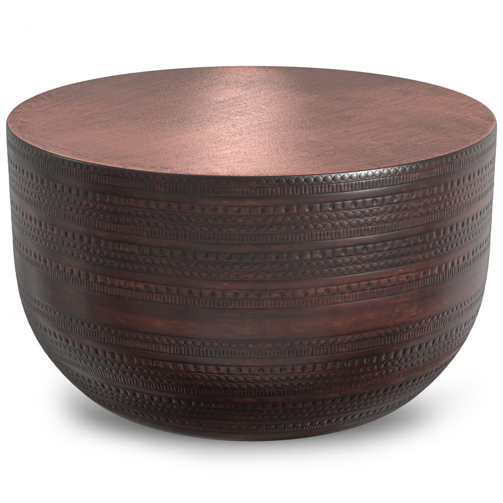 Distinctive in style the 18-inch bronze metal round drum end table radiates a versatile charm. Made of metal, the bronze coloration throughout gives this piece an updated and refreshing look. A great accent on either side of the sofa or bed, this adorable end or side table is just what you need. You can match it with other pieces to get the ideal look for your place. 18.25-inch h x 29.50-inch w x 29.50-inch d.