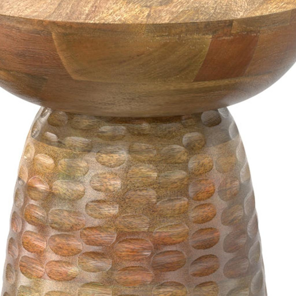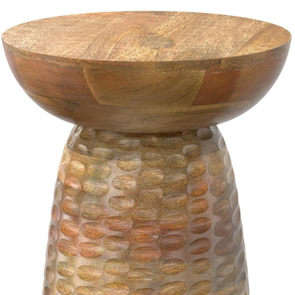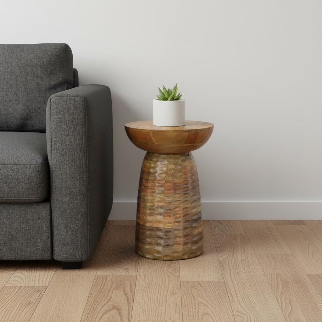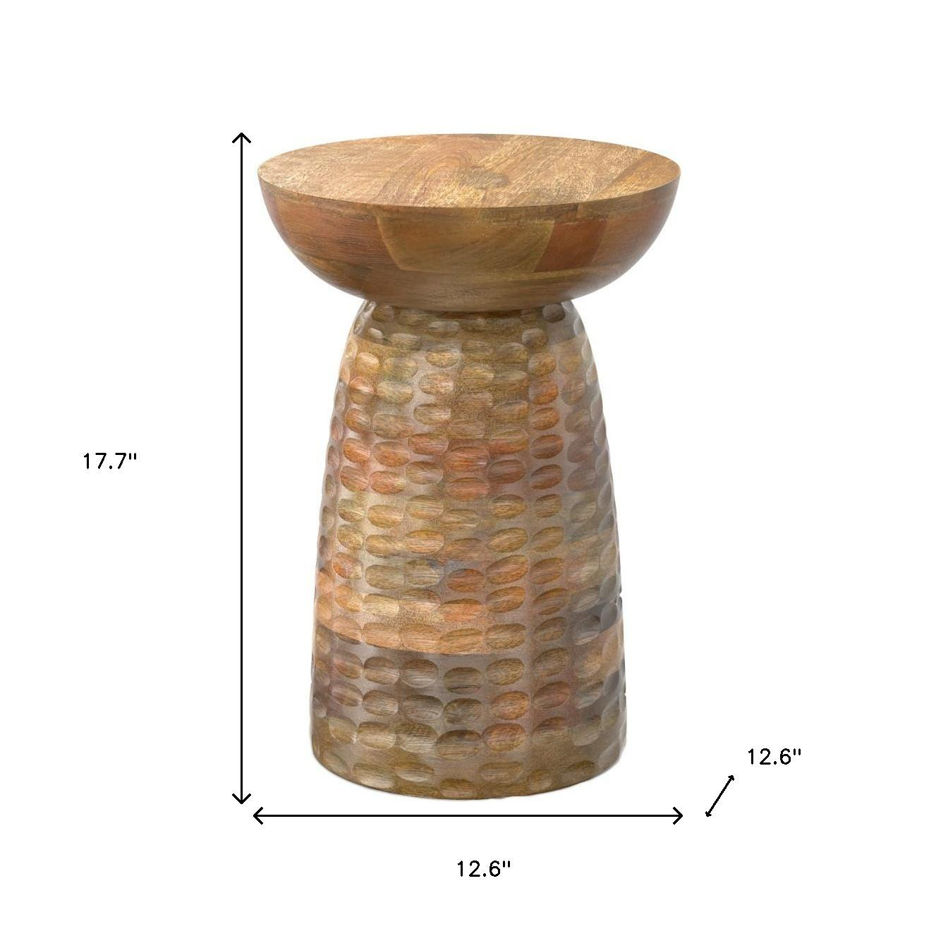 Show off your exquisite taste with this 18-inch natural solid wood round end table. This table features quality construction from solid wood and an updated monotone color scheme with natural as the main color on both the top and the base. An ideal location for placing your snacks and drinks, and a place to keep your lamp, frames, or other accessories. This versatile table is a great accent for most any room. 17.70-inch h x 12.60-inch w x 12.60-inch d.