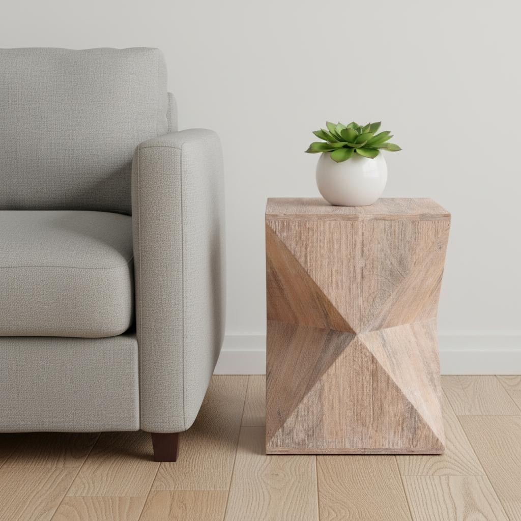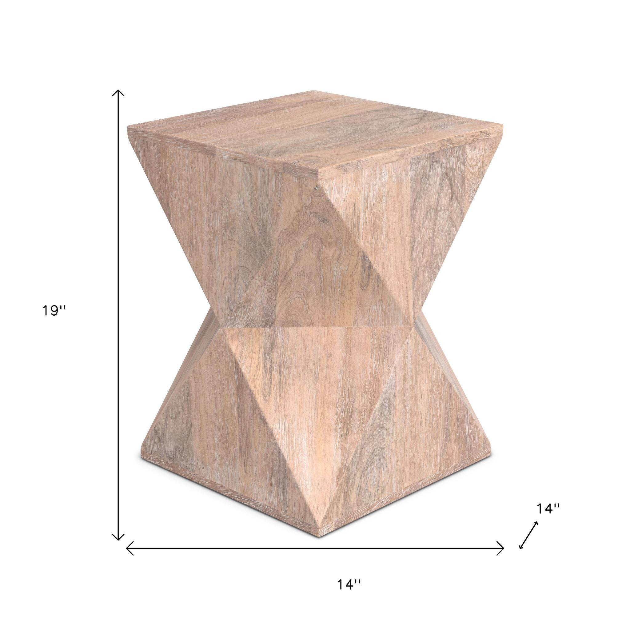 Distinctive in style the 19-inch natural solid wood square end table radiates a versatile charm. This table features quality construction from solid wood and an updated monotone color scheme with natural as the main color on both the top and the base. Side tables are a great way to flank your sofa, use as an accent next to your favorite chair, or can even be used bedside. You can match it with other pieces to get the ideal look for your place. 19.00-inch h x 14.00-inch w x 14.00-inch d.