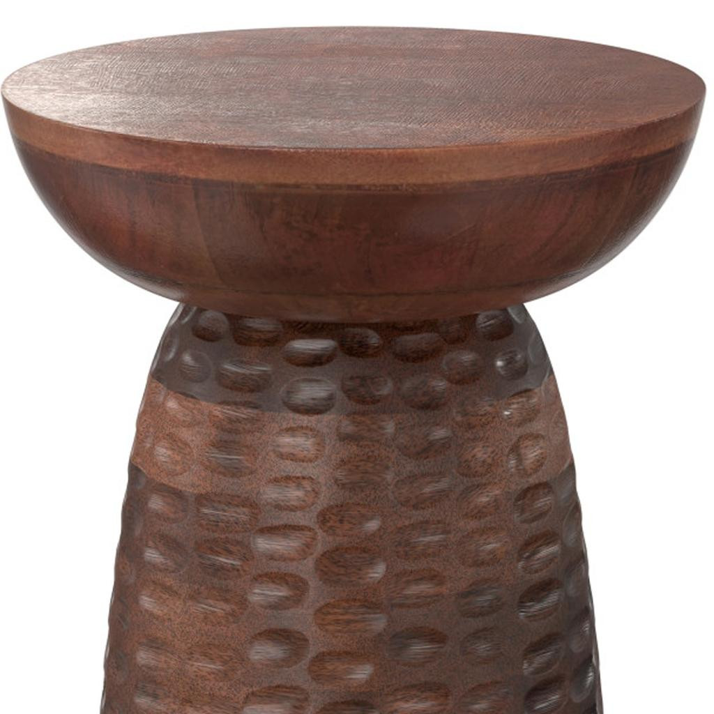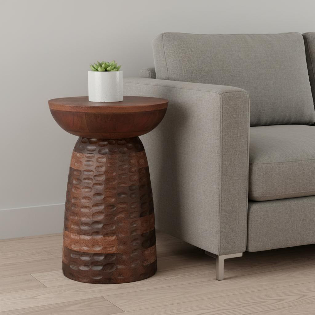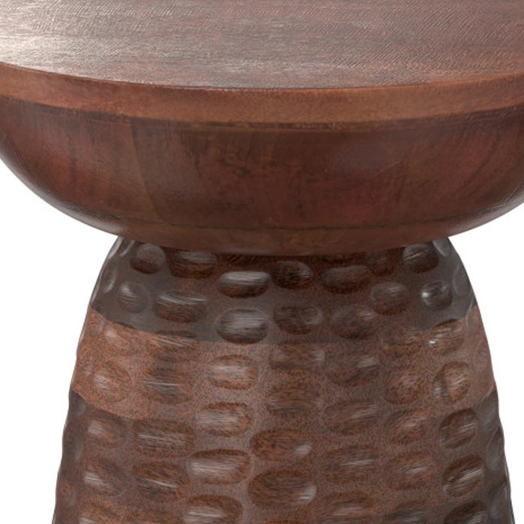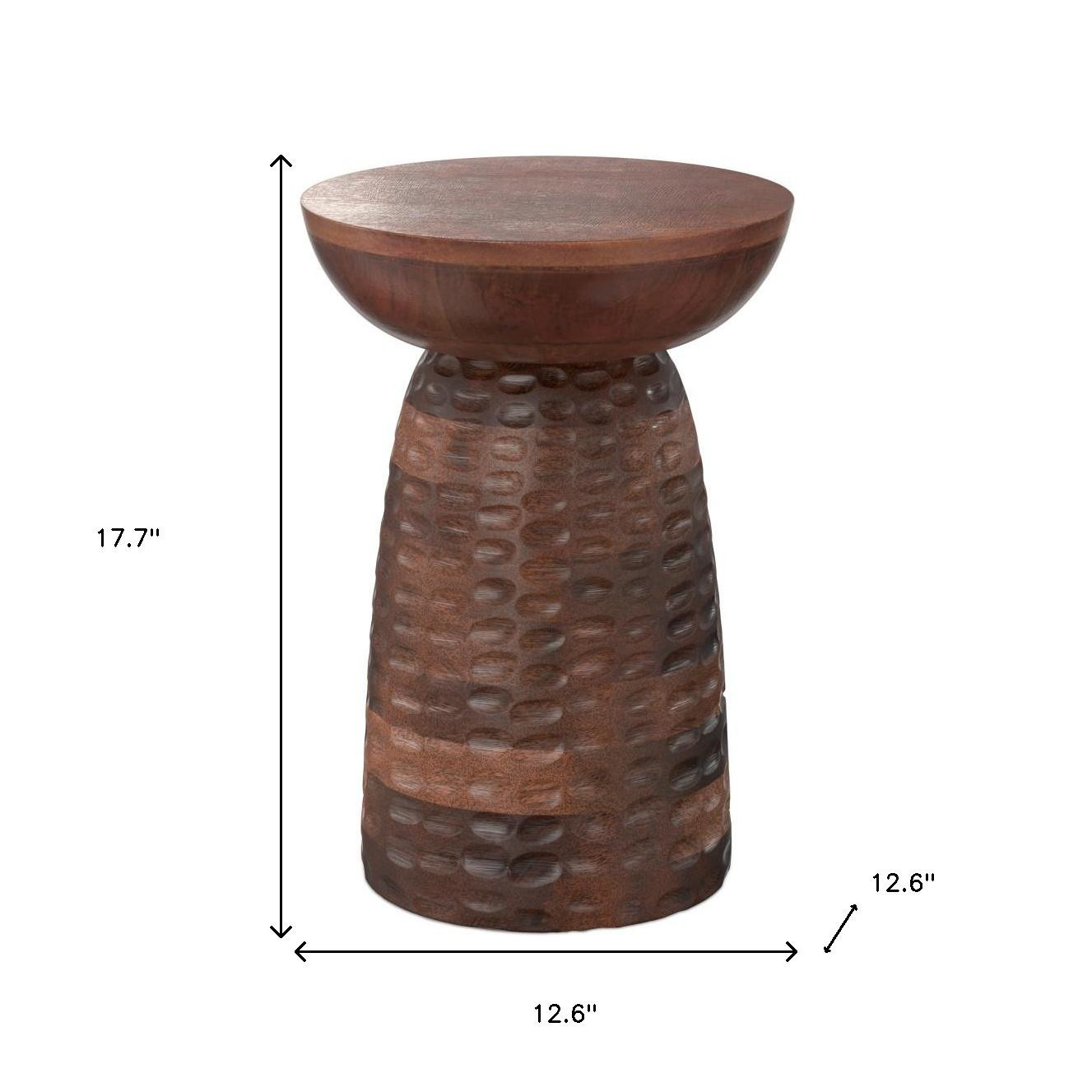Distinctive in style the 18-inch brown solid wood round end table radiates a versatile charm. Made of solid wood, the brown coloration throughout gives this piece an updated and refreshing look. Side tables are a great way to flank your sofa, use as an accent next to your favorite chair, or can even be used bedside. This versatile table is a great accent for most any room. 17.70-inch h x 12.60-inch w x 12.60-inch d.