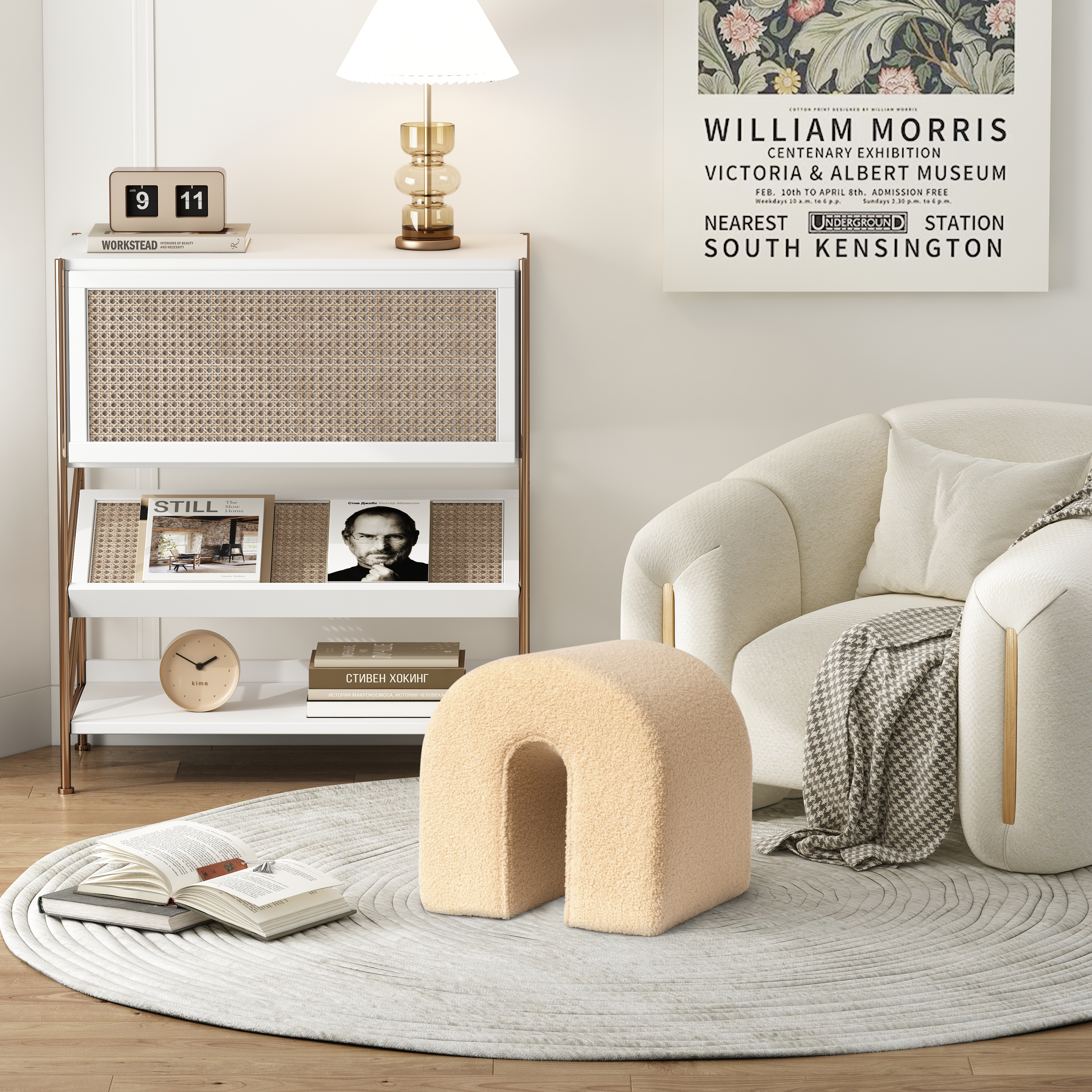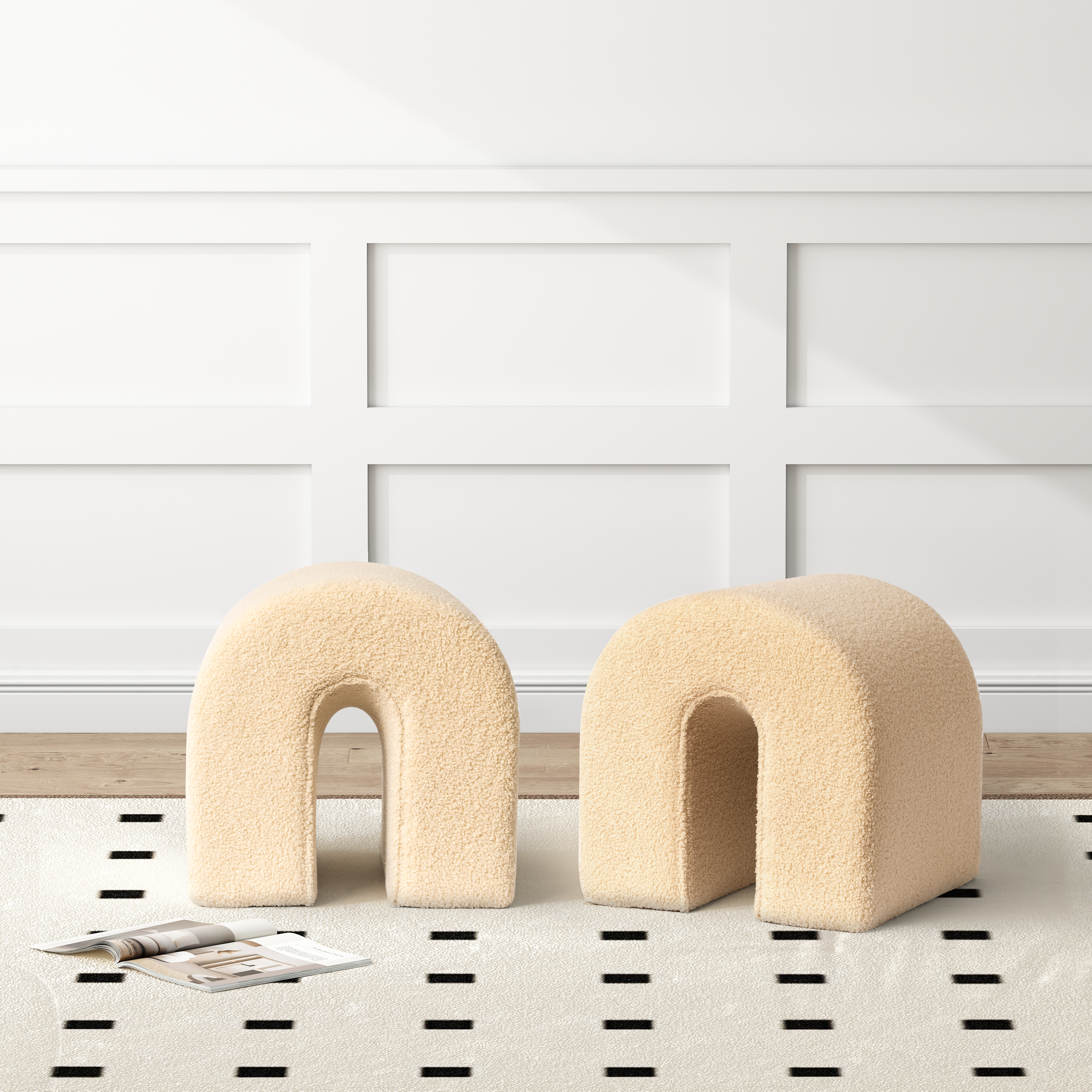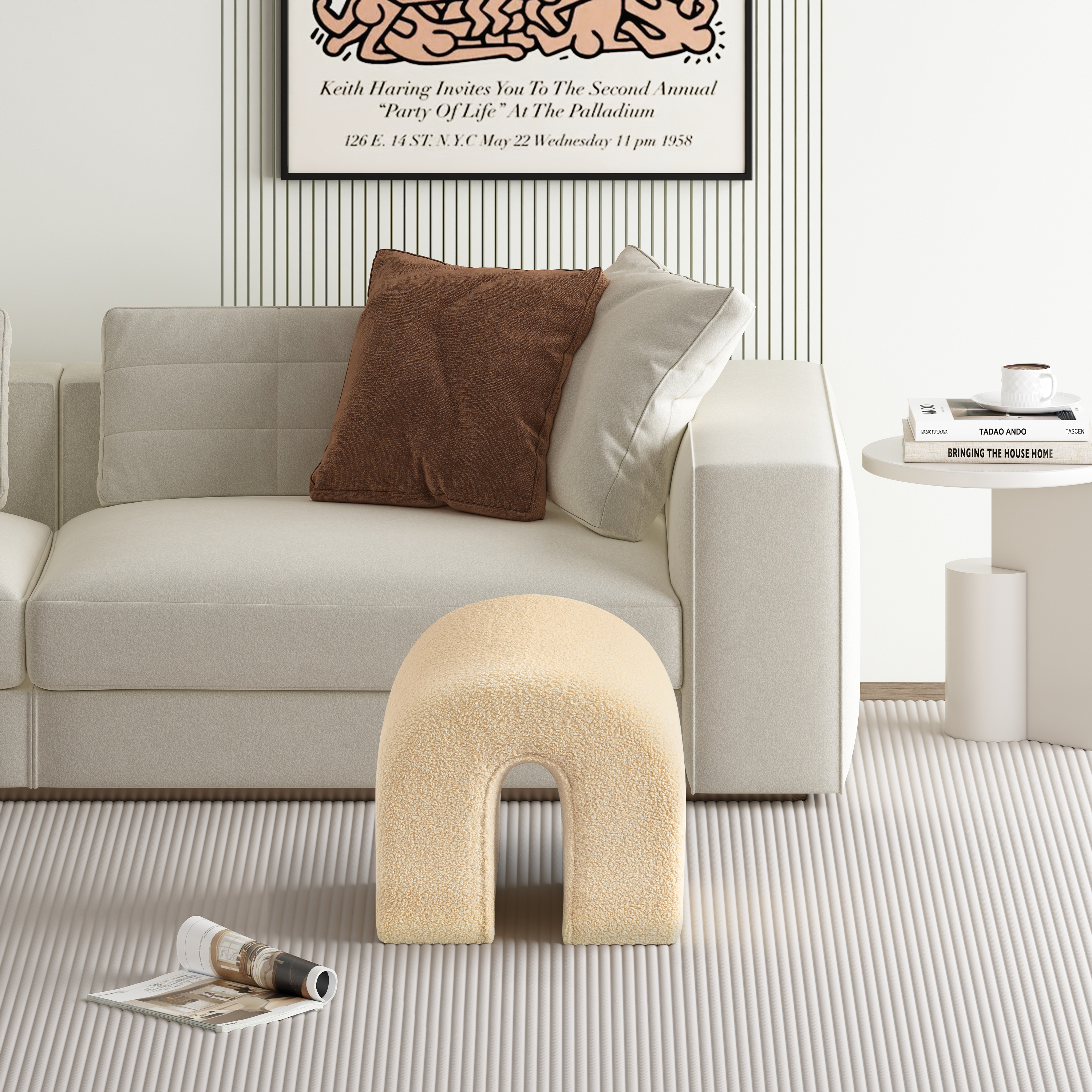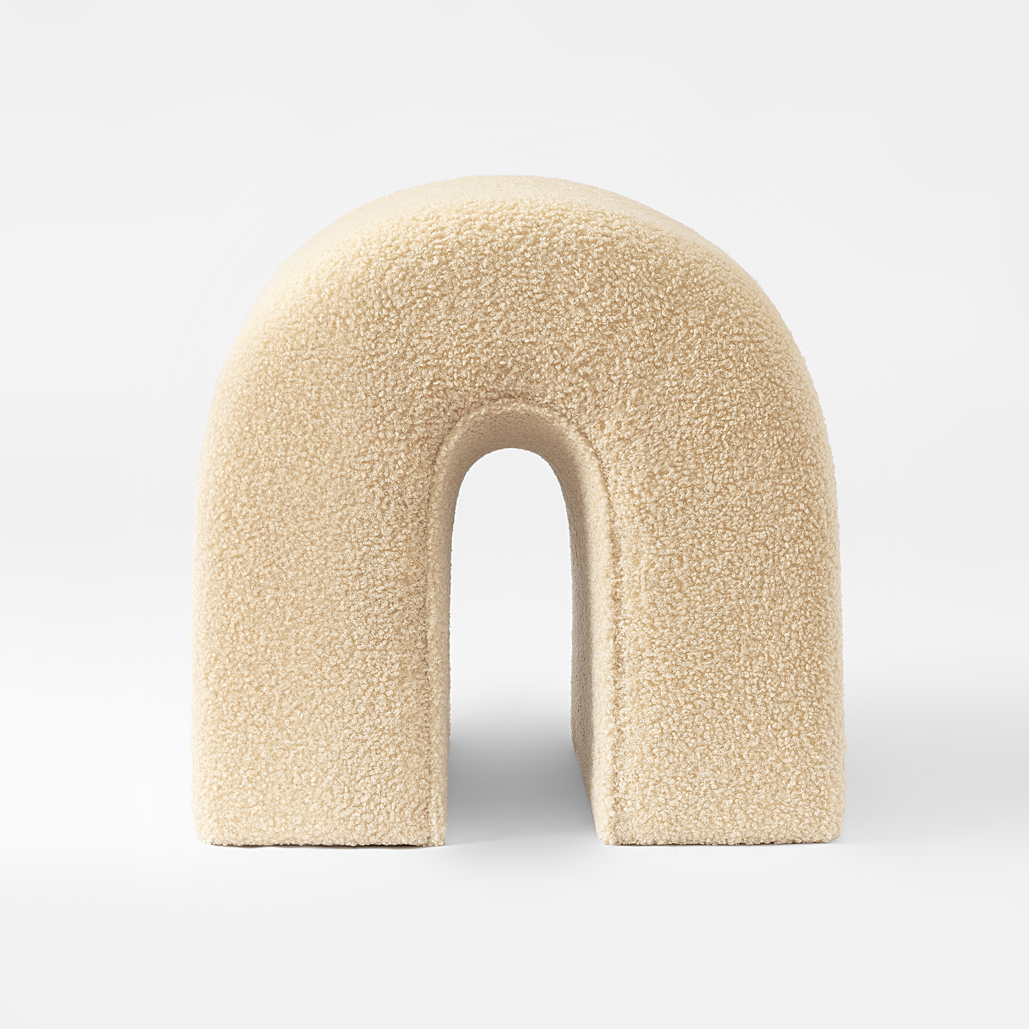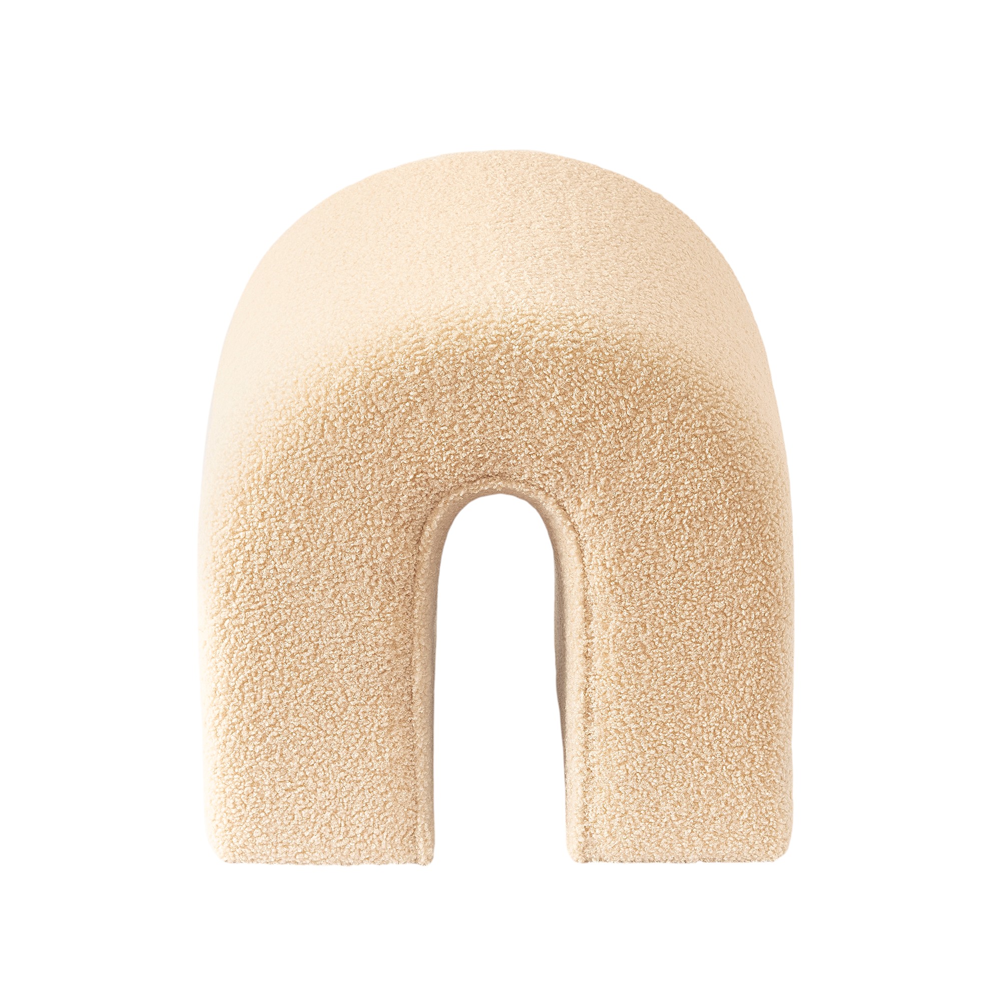 Practicality and fashion mix together with this handy 17-inch beige boucle oval footstool. This footstool is a treasure at the end of the day as an ideal place to rest your feet and legs and can also be used for extra seating when needed in a pinch. Featuring a fun and unique arched shape, this cozy accent will add a touch of modern and contemporary design to your space. The foam core is expertly upholstered in a solid color textural boucle that is like a teddy bear to the touch. Ottomans are multi-functional additions to your space that add fashion and practical value. 16.93-inch h x 16.93-inch w x 16.92-inch d.
