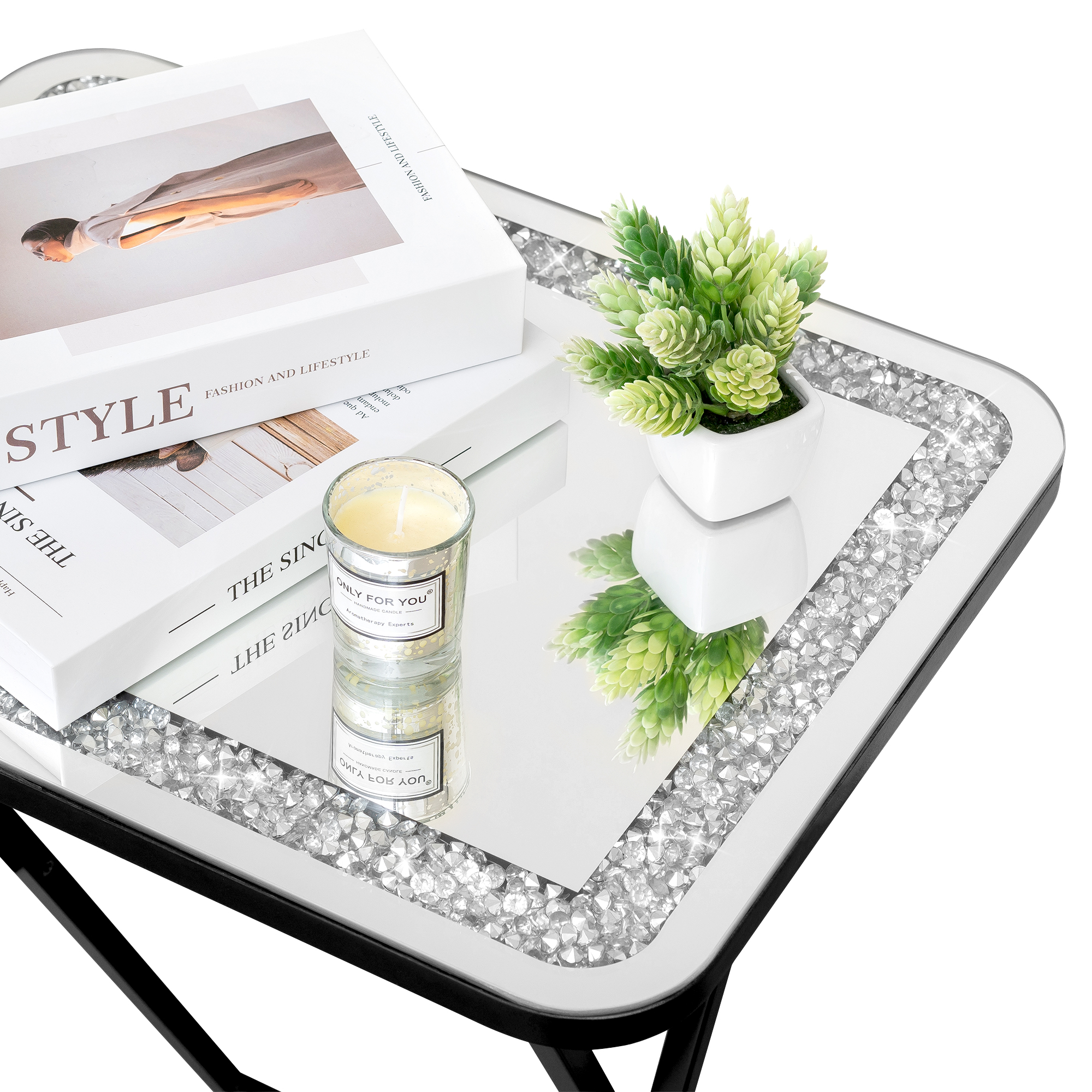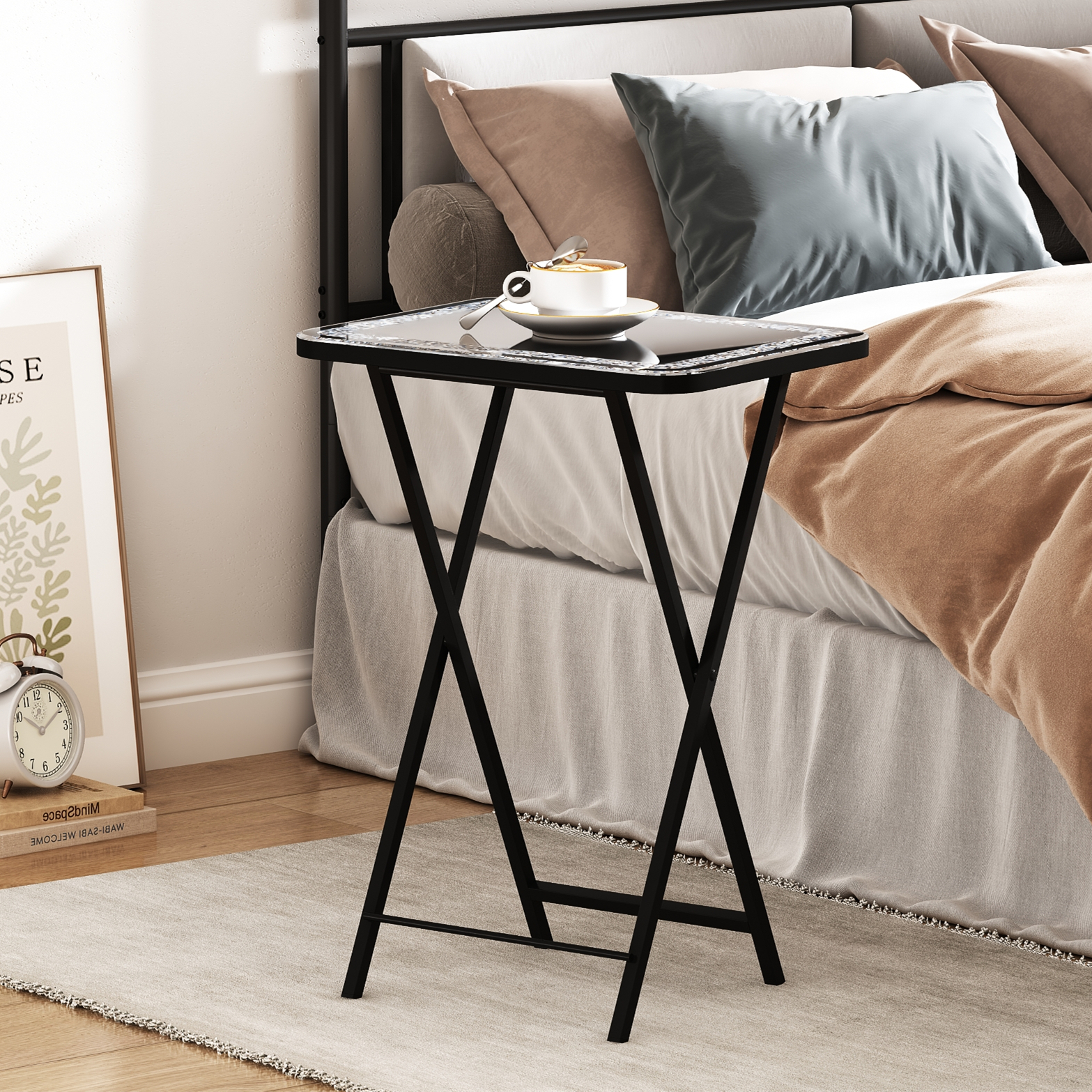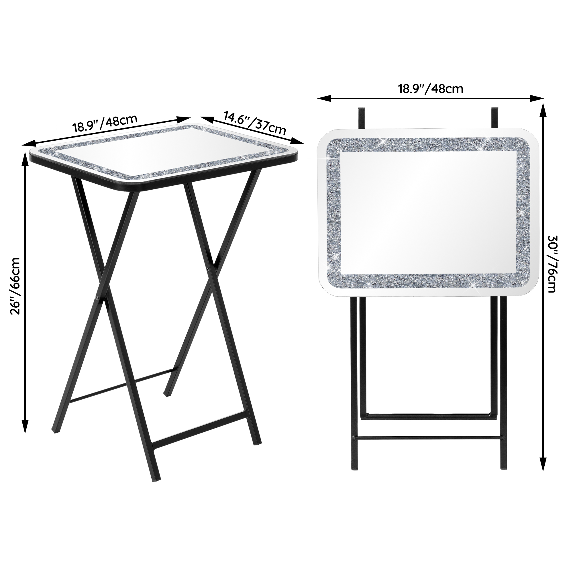 Elevate your home decor with the 20-inch silver and black mirrored glass faux crystal and metal folding tray table. This stunning tray table features a glam design that seamlessly blends elegance and functionality. The top showcases a luxurious combination of faux crystals and mirrored glass, reflecting light beautifully in any space. Its sleek black metal base provides sturdy support while maintaining a chic appearance. Designed for versatility, this folding table can be easily stored away when not in use, making it perfect for entertaining or daily purposes. Whether you need a stylish accent for your living room or a convenient surface for drinks and snacks, this tray table offers both beauty and practicality. 25.98-inch h x 18.90-inch w x 14.57-inch d.