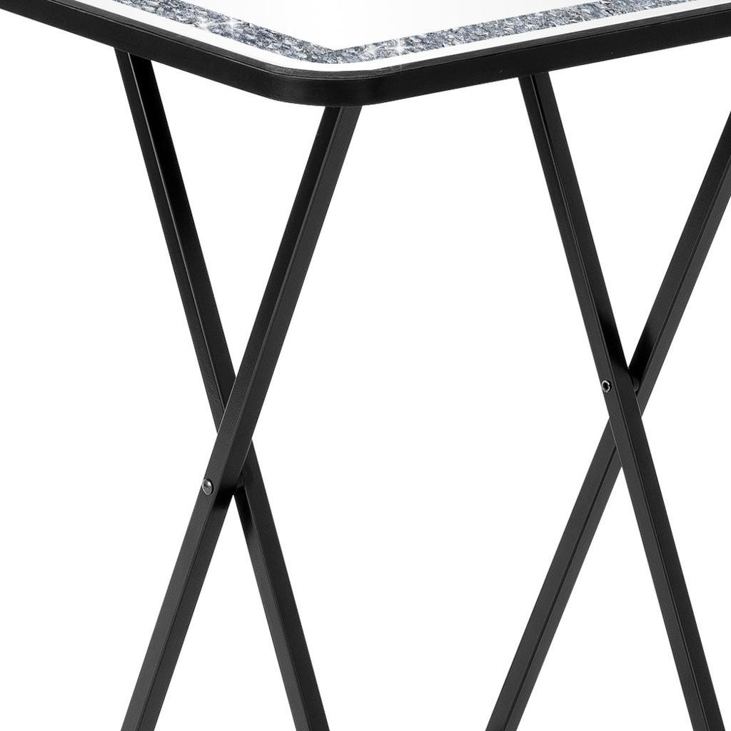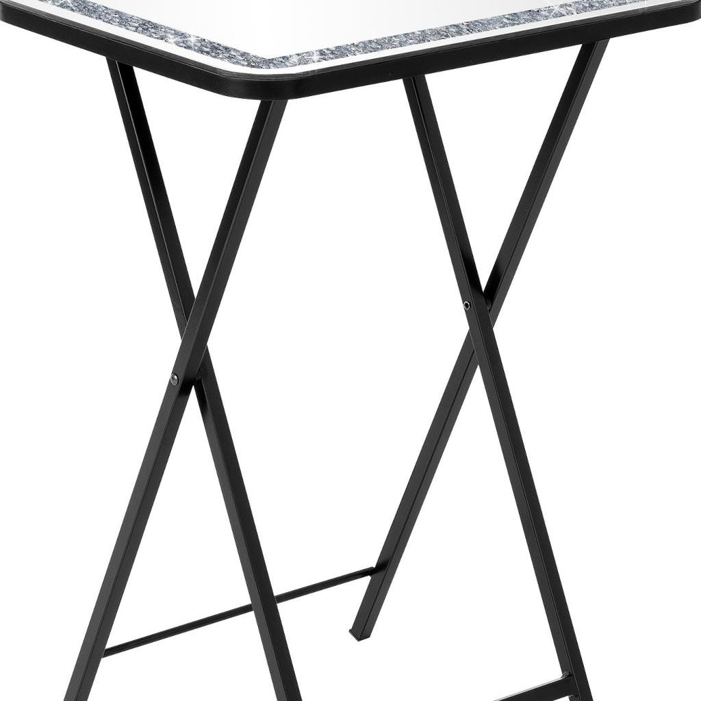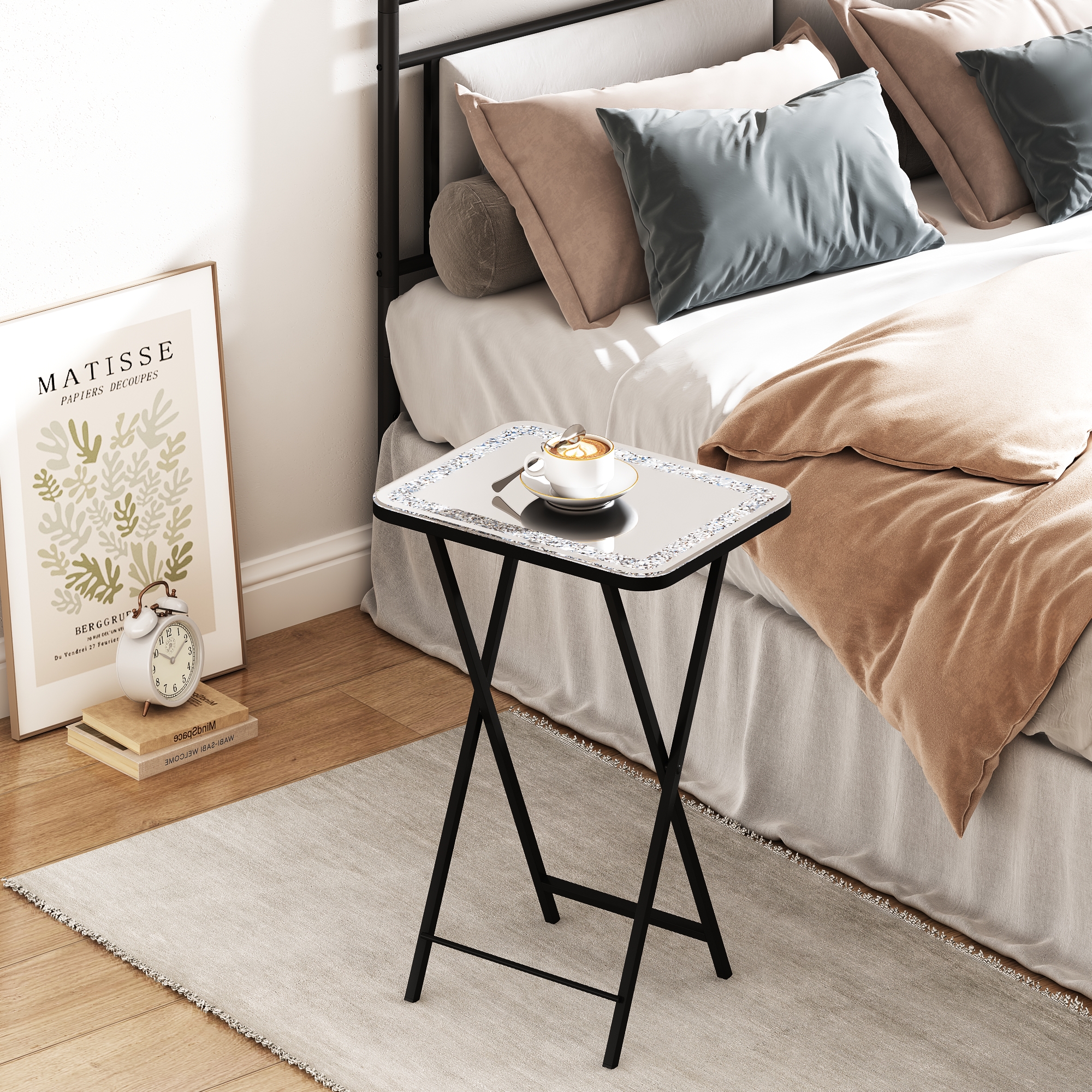 Elevate your home decor with the 20-inch silver and black mirrored glass faux crystal and metal folding tray table. This stunning tray table features a glam design that seamlessly blends elegance and functionality. The top showcases a luxurious combination of faux crystals and mirrored glass, reflecting light beautifully in any space. Its sleek black metal base provides sturdy support while maintaining a chic appearance. Designed for versatility, this folding table can be easily stored away when not in use, making it perfect for entertaining or daily purposes. Whether you need a stylish accent for your living room or a convenient surface for drinks and snacks, this tray table offers both beauty and practicality. 25.98-inch h x 18.90-inch w x 14.57-inch d.