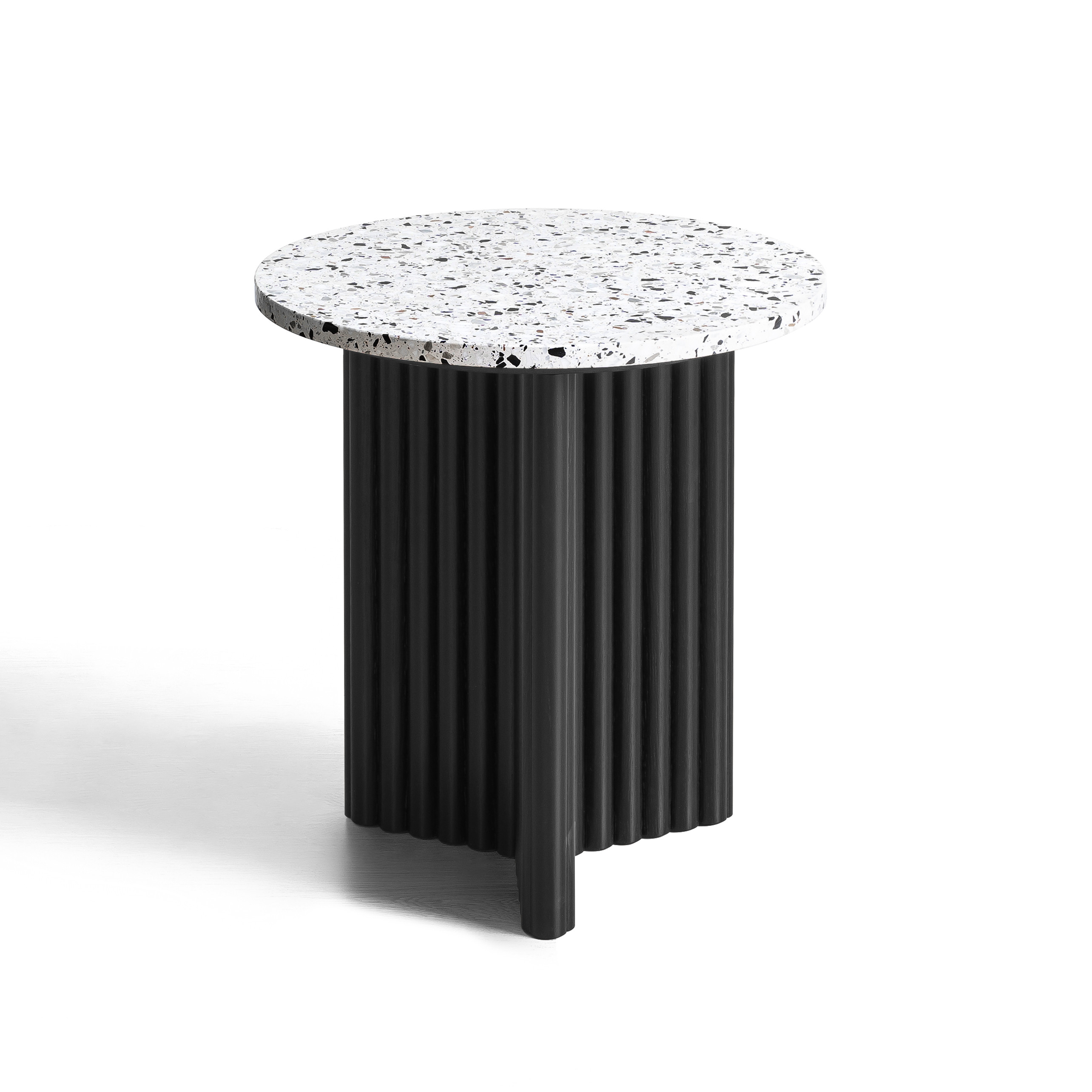 wood round pedestal end table, round pedestal end table, pedestal end table, faux terrazzo wood round pedestal, 23" white black faux terrazzo |