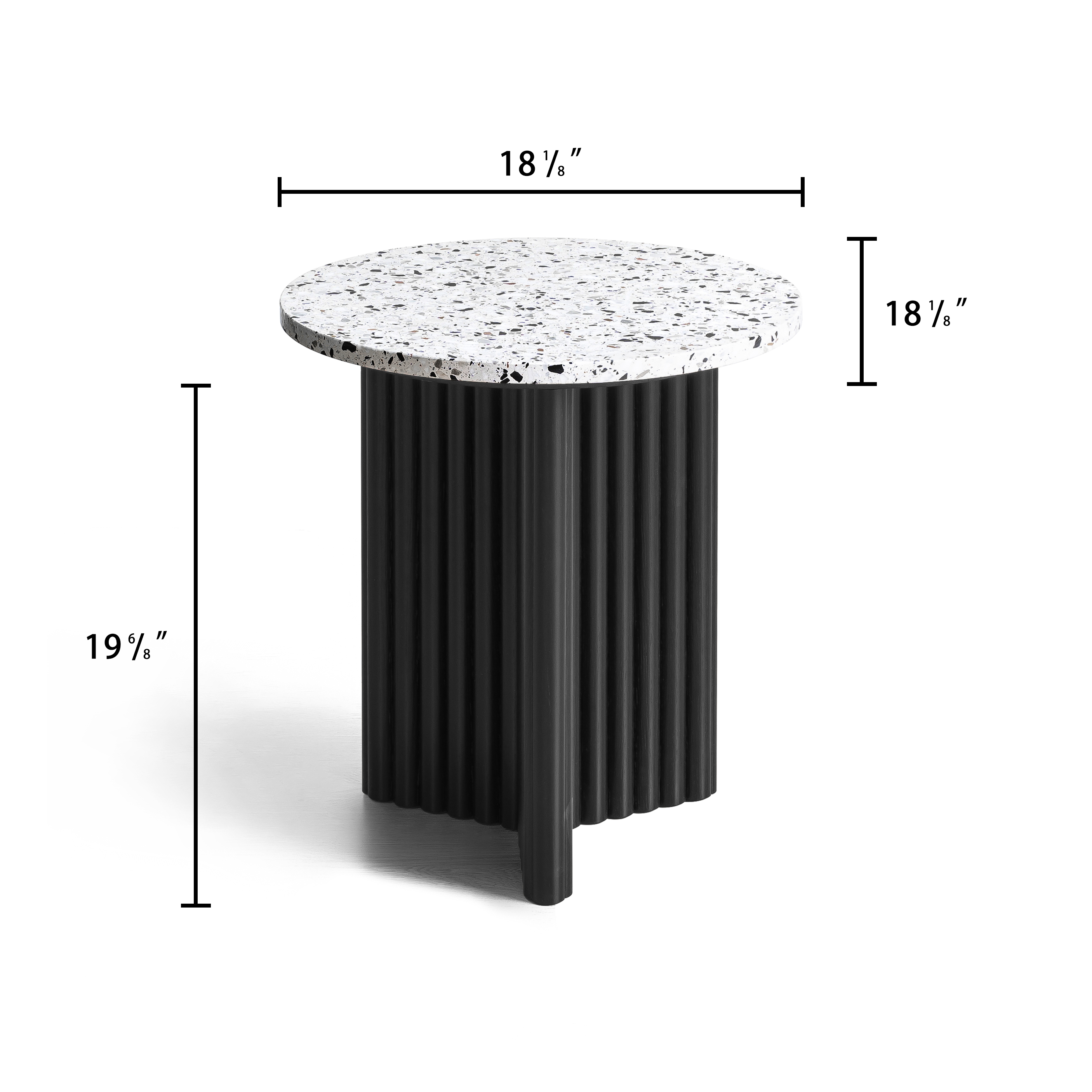 Distinctive in style the 23-inch white and black faux terrazzo and wood round pedestal end table radiates a versatile charm. The black coloration of the high quality manufactured wood geometric design pedestal base marries nicely with the white round faux terrazzo top. An ideal location for placing your snacks and drinks, and a place to keep your lamp, frames, or other accessories. You can also use it as an entryway table to hold your keys. 23.00-inch h x 22.00-inch w x 8.20-inch d.