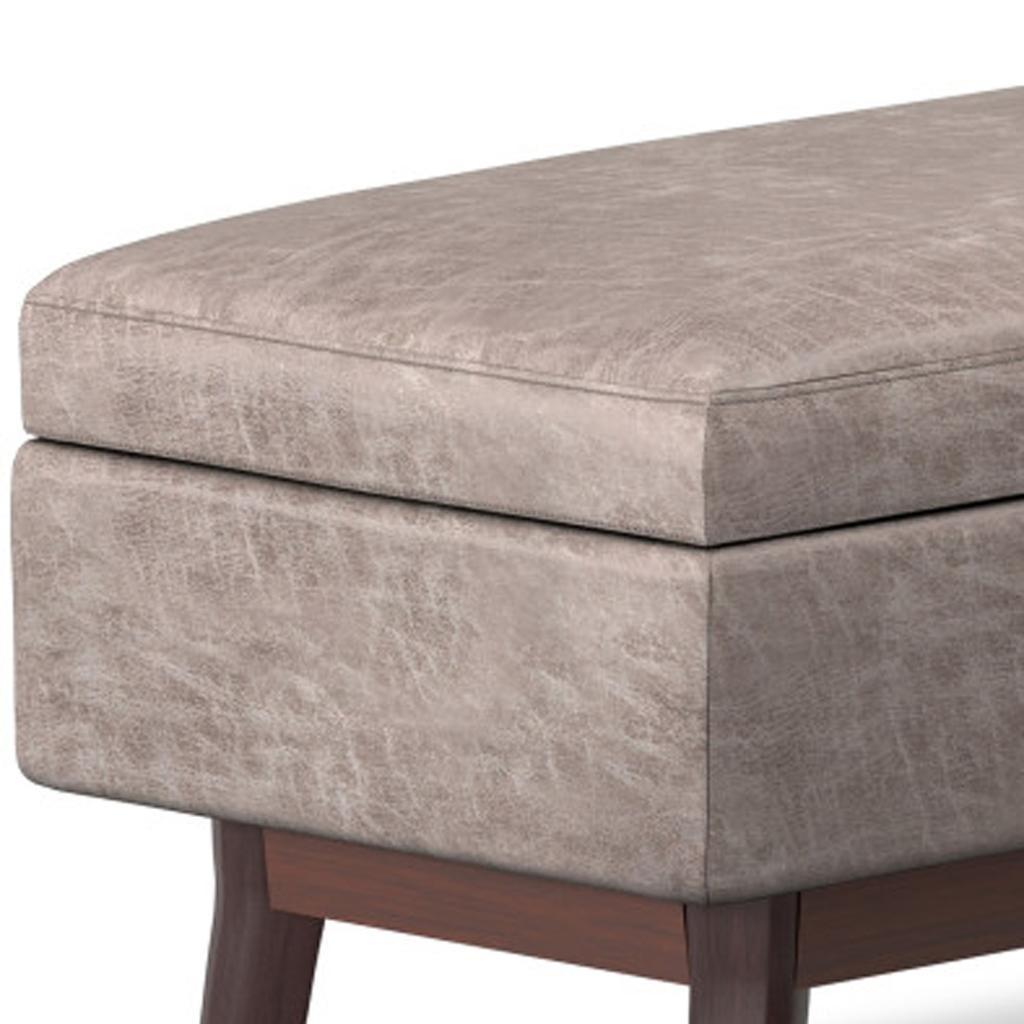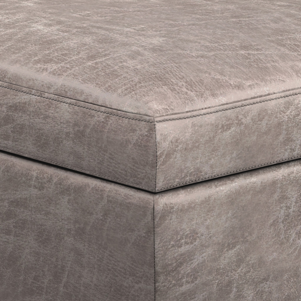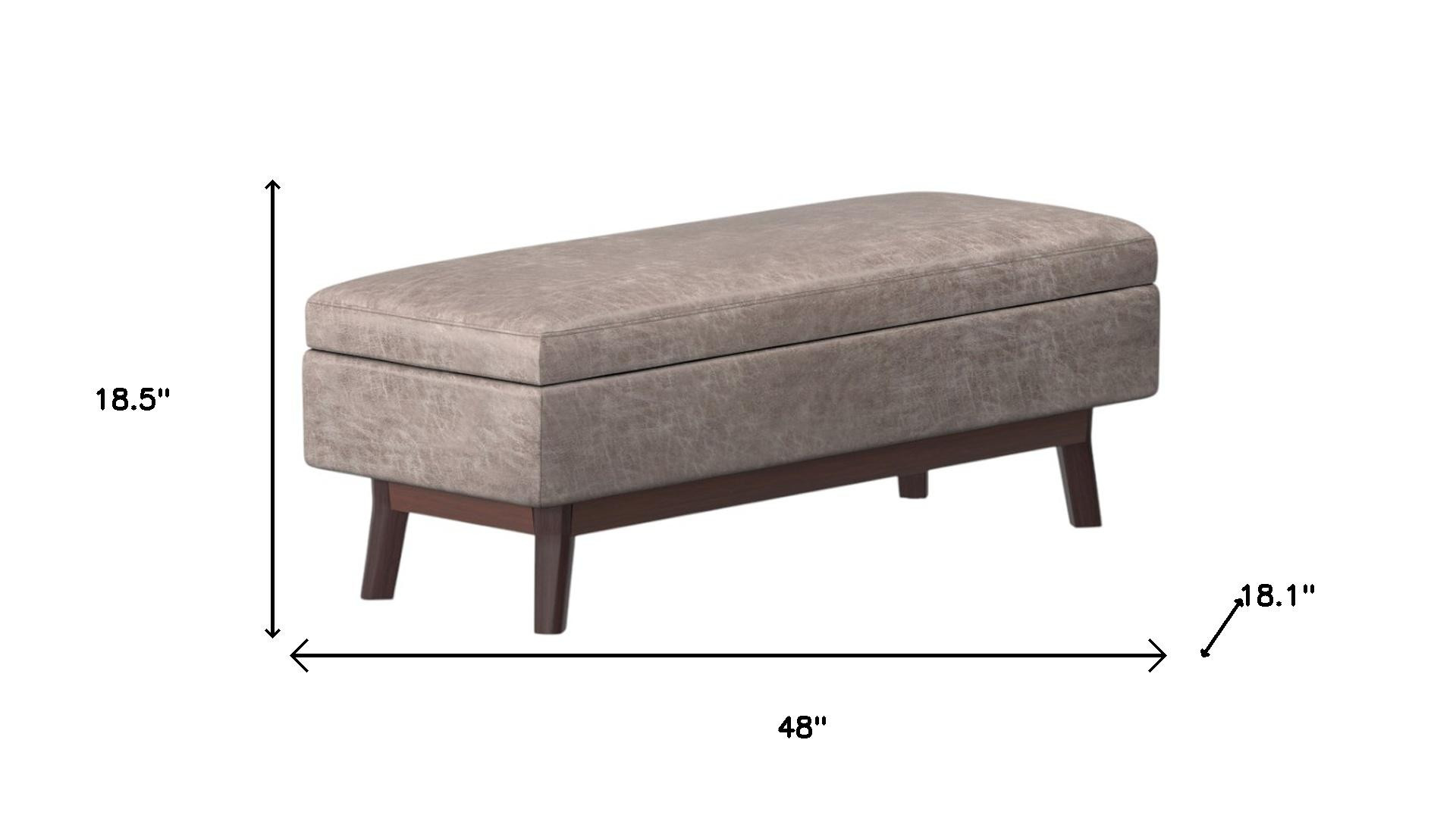 Get ready to relax with this 48-inch gray and brown leather cocktail ottoman with storage. This chic cocktail ottoman is larger in size and designed to serve as a make-shift coffee table during parties. The surface is wide and flat which is not only suitable for a footrest or seat but also ready to hold trays of appetizers, drinks, or desserts. The upholstery top of this ottoman is a nice contrast to the upholstery material. The purposefully distressed finish gives this versatile ottoman an authentically rustic feel. Expertly upholstered with padding in a soft solid color leather, this ottoman is as comfortable as it is good looking. Ottomans are multi-functional additions to your space that add fashion and practical value. 18.50-inch h x 48.00-inch w x 18.10-inch d.