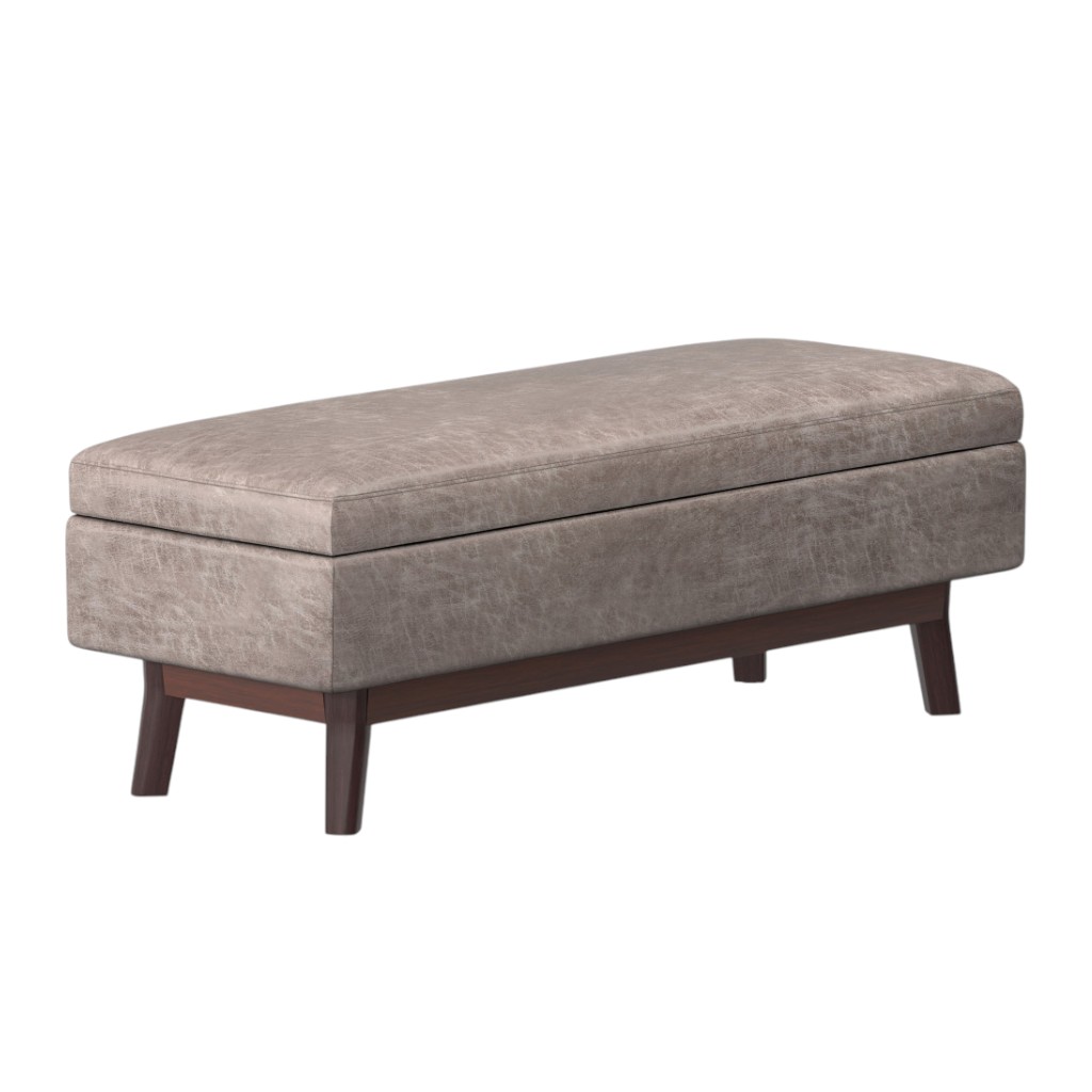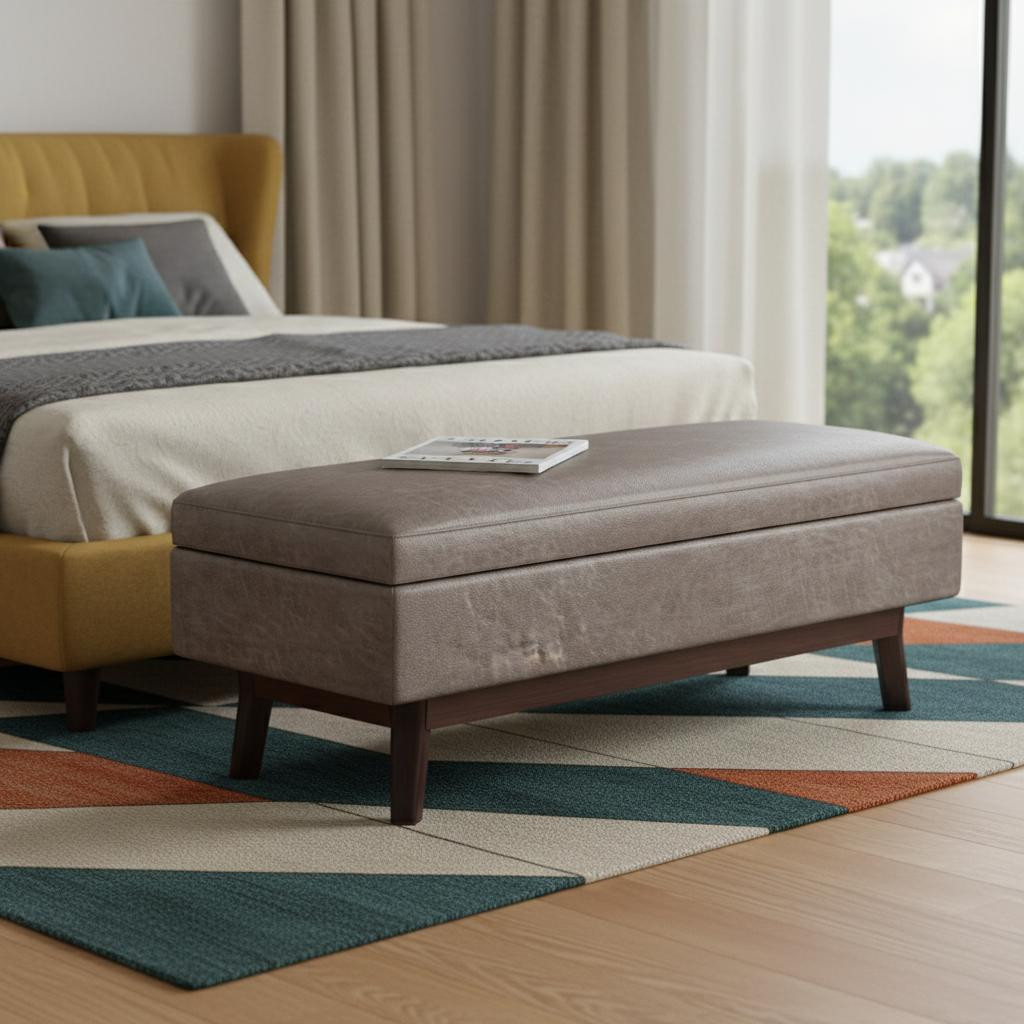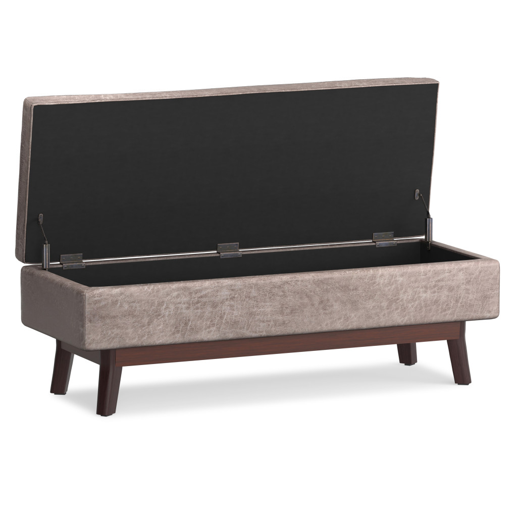 Get ready to relax with this 48-inch gray and brown leather cocktail ottoman with storage. This chic cocktail ottoman is larger in size and designed to serve as a make-shift coffee table during parties. The surface is wide and flat which is not only suitable for a footrest or seat but also ready to hold trays of appetizers, drinks, or desserts. The upholstery top of this ottoman is a nice contrast to the upholstery material. The purposefully distressed finish gives this versatile ottoman an authentically rustic feel. Expertly upholstered with padding in a soft solid color leather, this ottoman is as comfortable as it is good looking. Ottomans are multi-functional additions to your space that add fashion and practical value. 18.50-inch h x 48.00-inch w x 18.10-inch d.