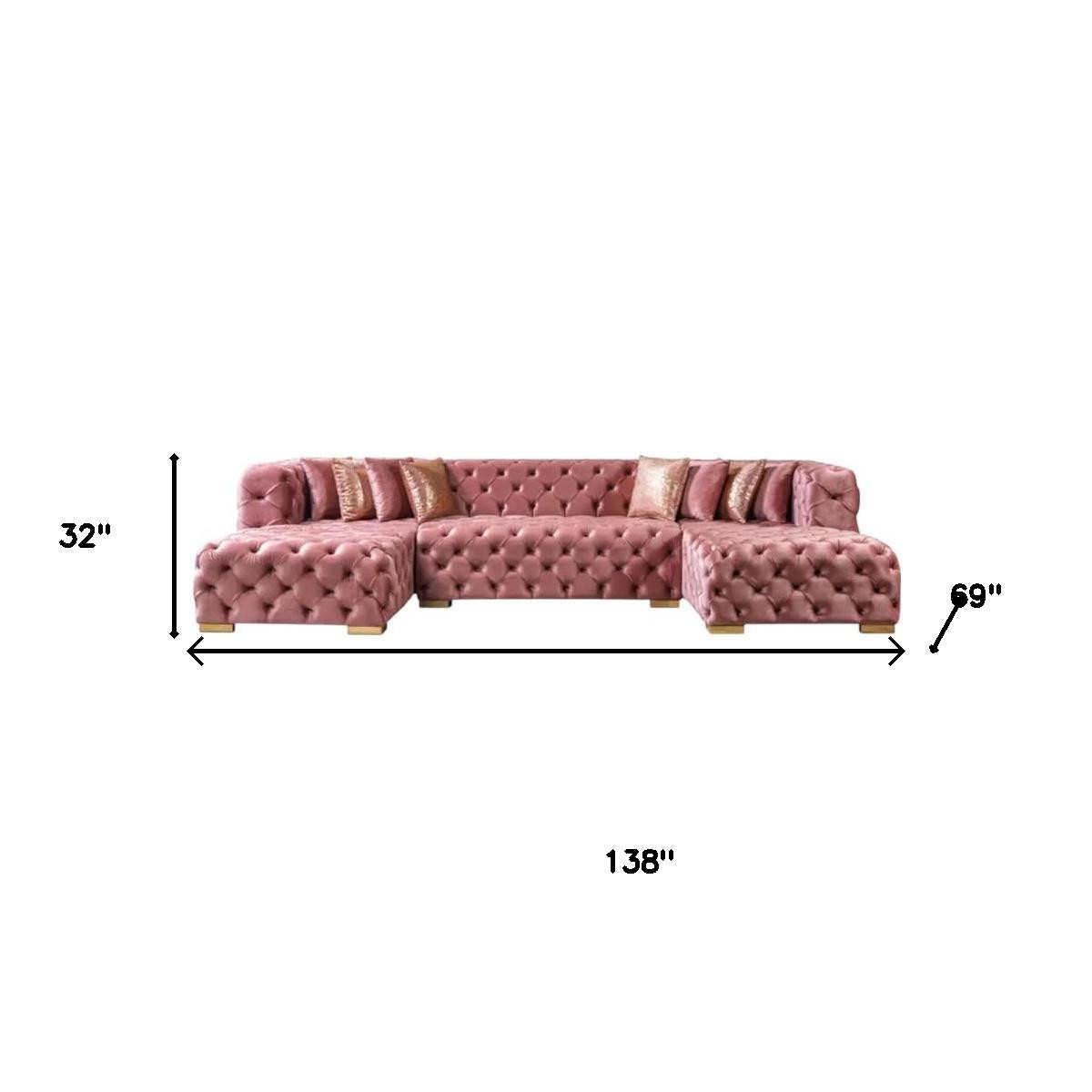 Add an air of fashion to your space with this fabulous button tufted pink velvet modular u shaped sofa and chaise sectional with eight toss pillows. Accented with modern gold square feet and button tufted stitching, this handcrafted sectional will bring high fashion and style to your space. Great for everyday lounging and for entertaining, sectionals are an ideal way to seat multiple people. 32.00-inch h x 138.00-inch w x 69.00-inch d.