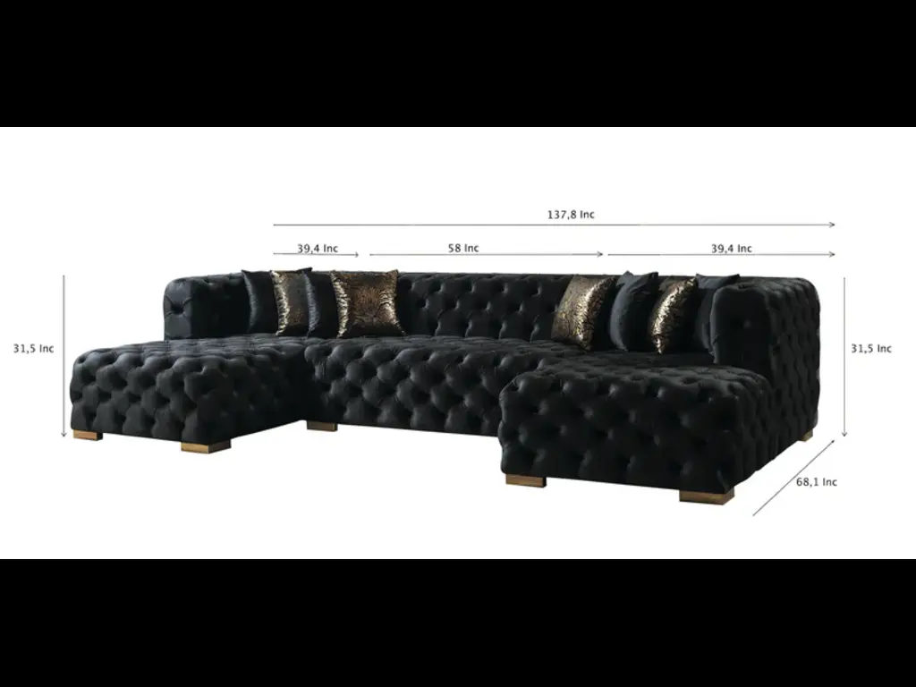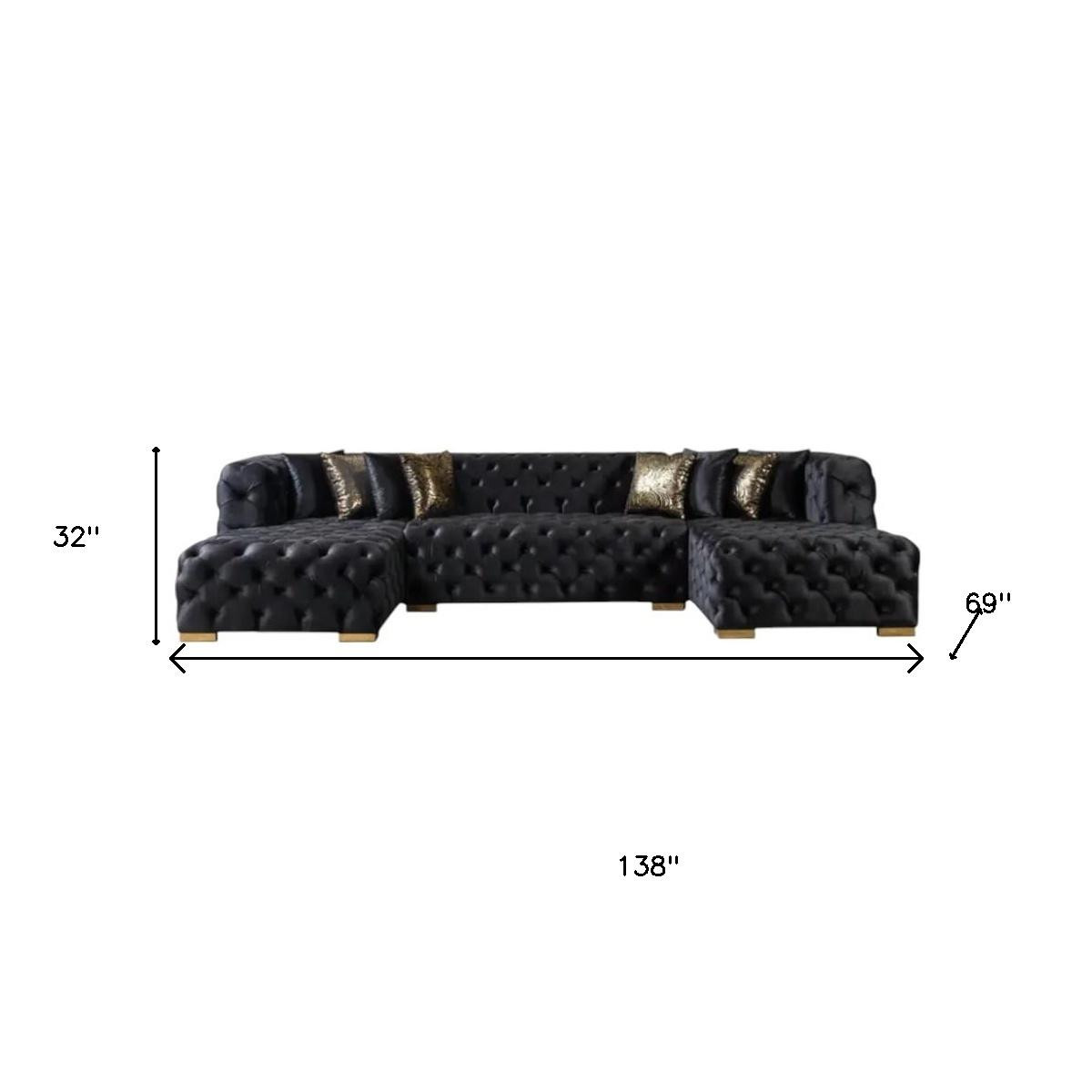 Transform your home's interior with this luxurious black velvet modular u shaped sofa and chaise sectional with eight toss pillows. Accented with a touch of metallic, including modern gold square feet, and button tufted stitching, this handcrafted sectional will bring high fashion and style to your space. Great for everyday lounging and for entertaining, sectionals are an ideal way to seat multiple people. 32.00-inch h x 138.00-inch w x 69.00-inch d.