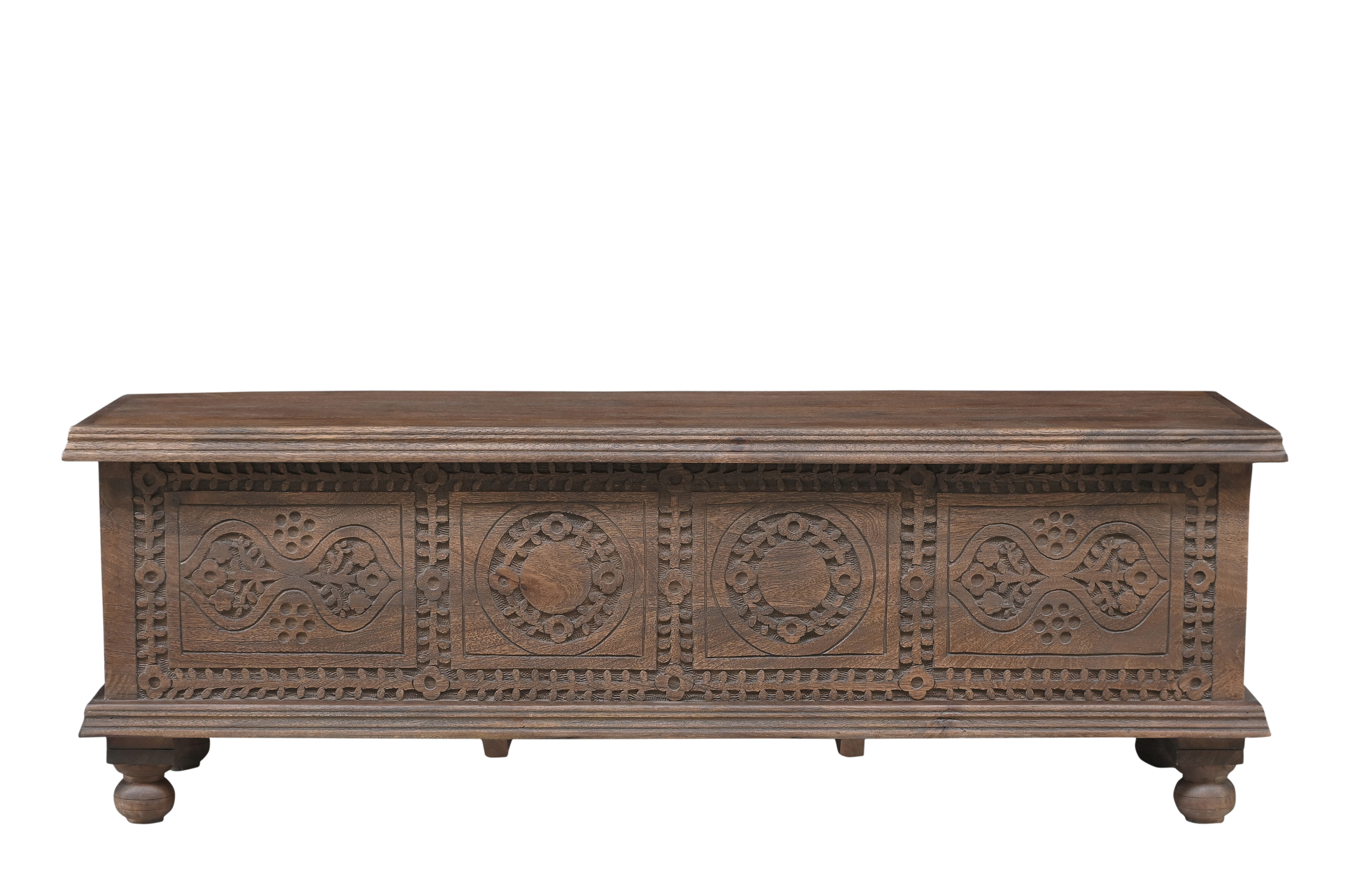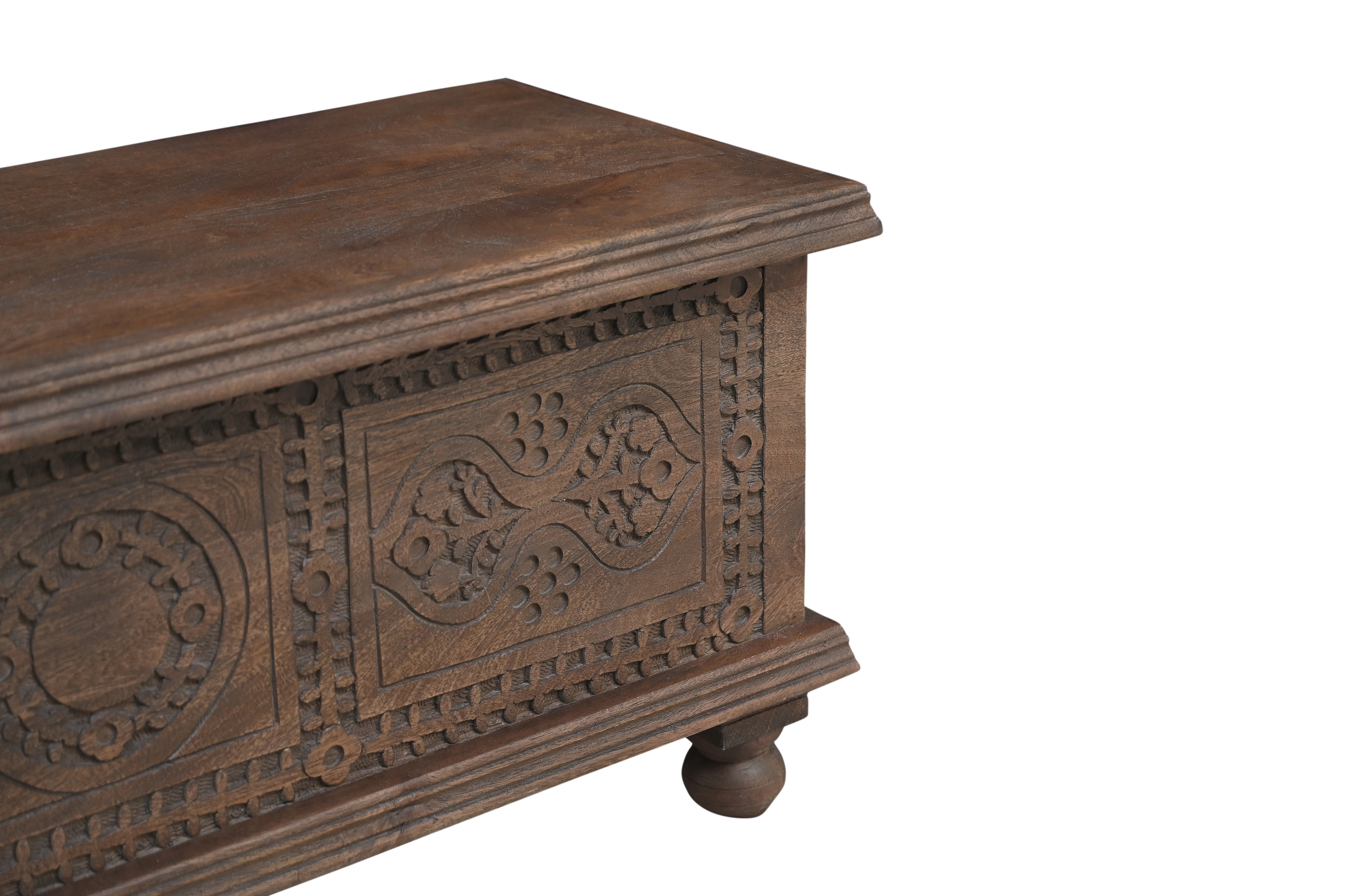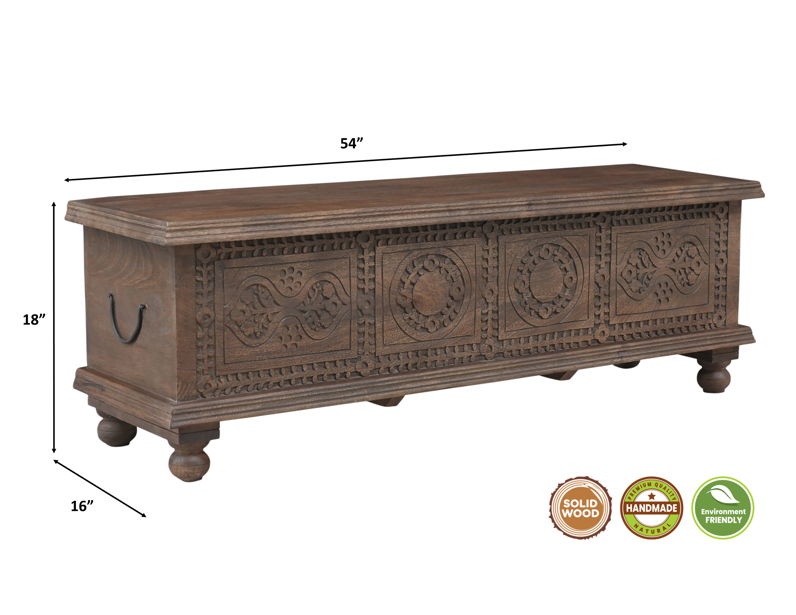 Optimize your space and add some charm to your room with the 54-inch brown solid wood medallion storage ottoman. This spacious storage piece is crafted and carved from solid mango wood with a pretty medallion design and a purposefully distressed finish. Designed to discretely add hidden storage to your room without sacrificing seating or foot rest space. This ottoman is made from high quality solid wood in a brown color throughout the base and top. Easy to blend into most any room, a ottoman is a way to add a good looking accent to your space that can also be practical and useful. 18-inch h x 54-inch w x 16-inch d.
