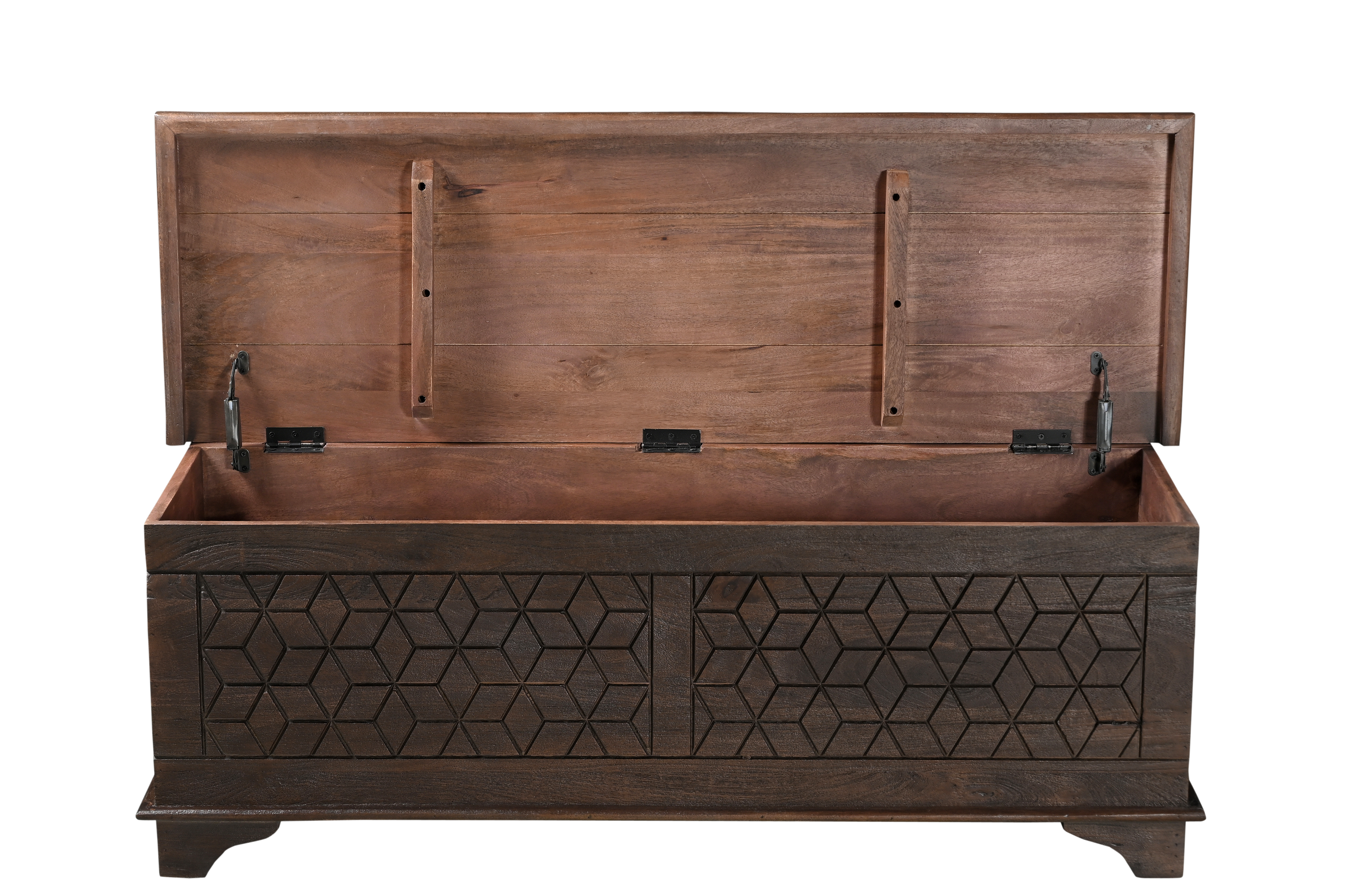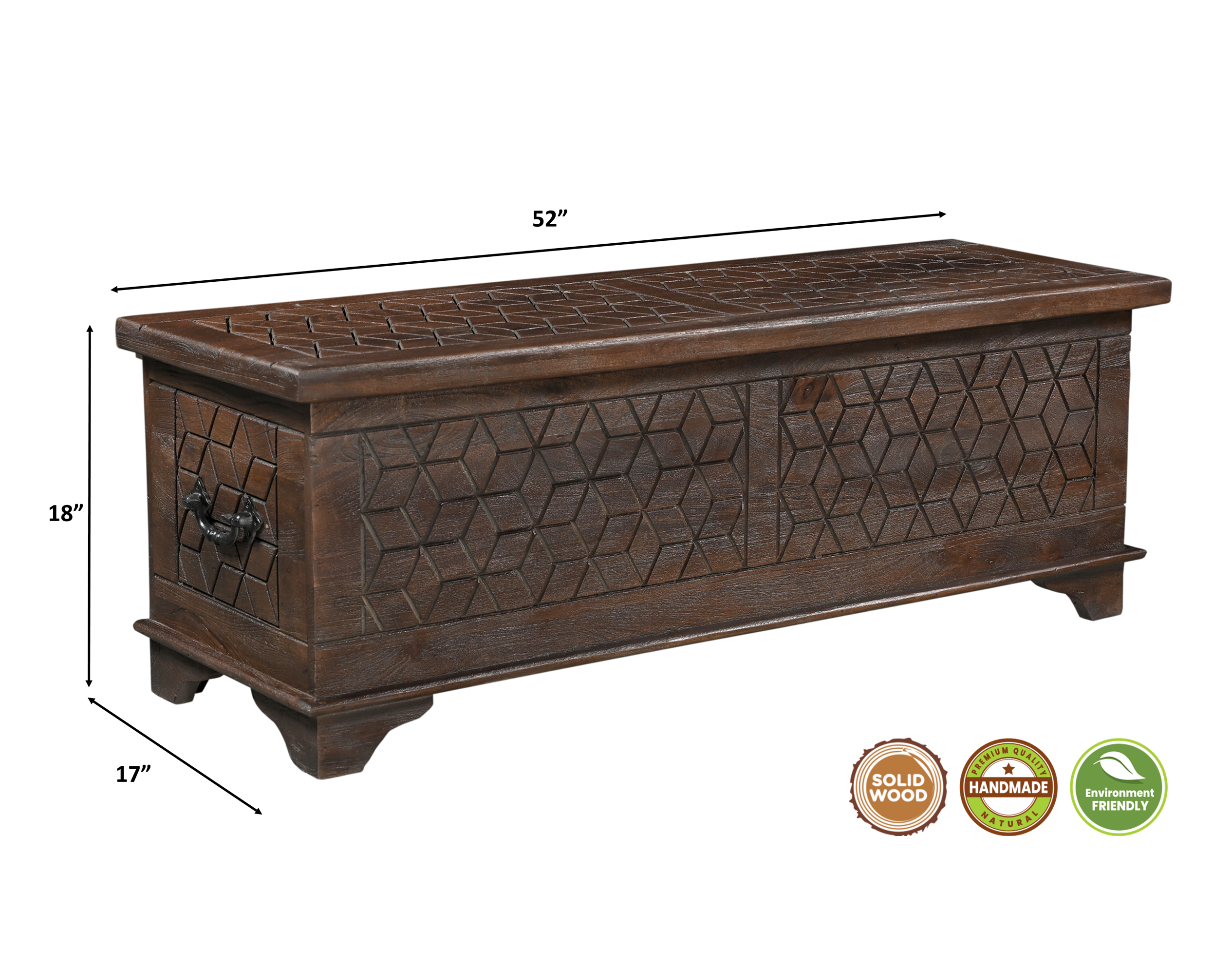 Get ready to relax with this 52-inch brown solid wood geometric storage ottoman. Designed to discretely add hidden storage to your room without sacrificing seating or foot rest space. This spacious storage piece is crafted and carved from solid mango wood with a pretty medallion design and a purposefully distressed finish. This ottoman is made from high quality solid wood in a brown color throughout the base and top. Easy to blend into most any room, a ottoman is a way to add a good looking accent to your space that can also be practical and useful. 18-inch h x 52-inch w x 17-inch d.
