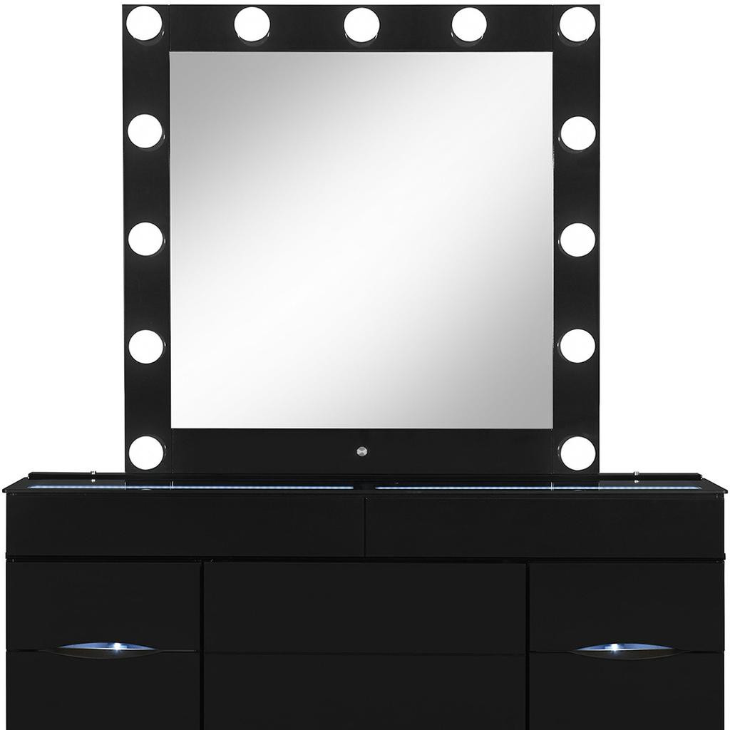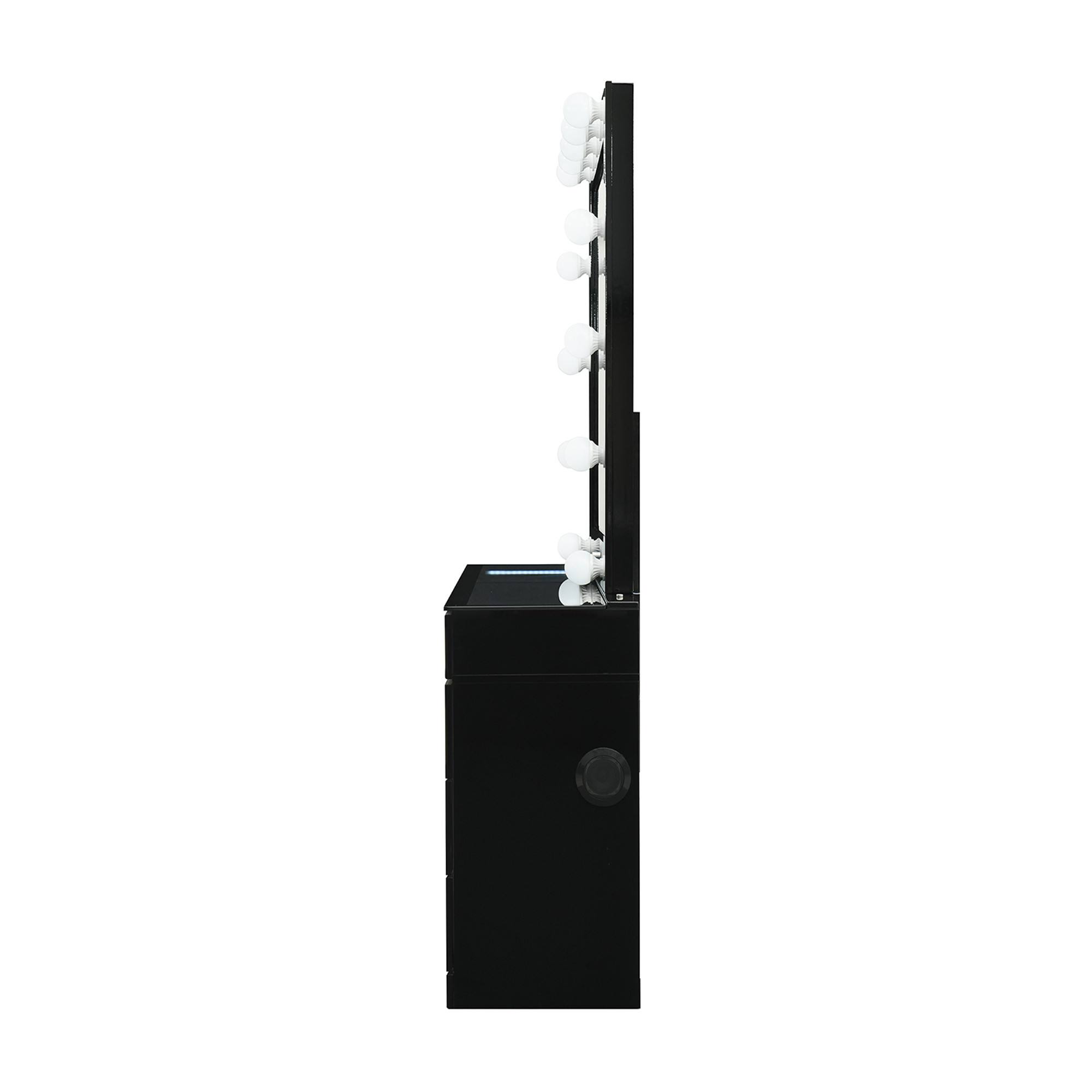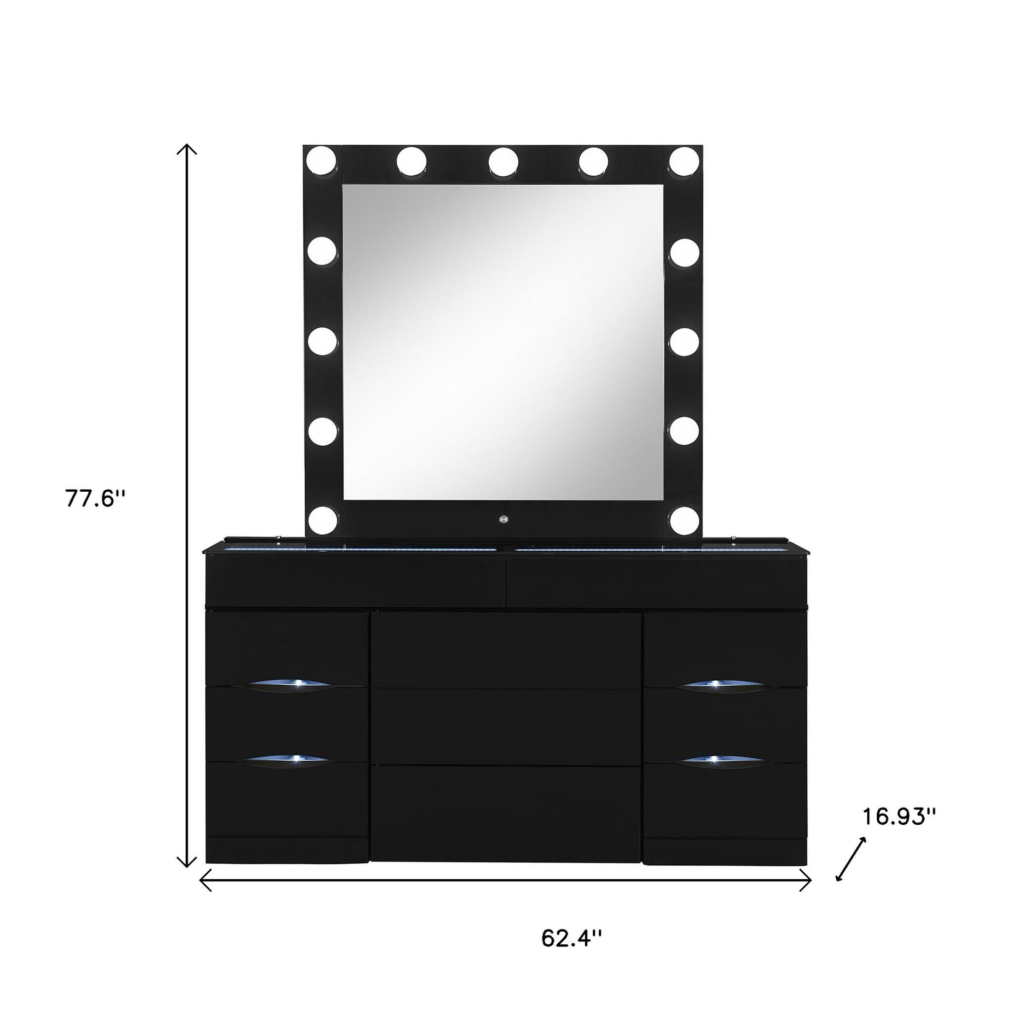 Transform your morning routine with our Hollywood glam yet functional 62-inch black six drawer vanity table with mirror, seating, and lights. Complete with a coordinating stool for you to sit on while you get ready, this vanity set is the ideal way to get ready. You can easily keep everything you need right at your fingertips with the included six pull out drawers. For even more concealed storage, the included stool features a lift top that opens to reveal additional space. Experience a new level of luxury and convenience with this versatile and glam vanity that will cater to your grooming needs, whether it's keeping organized, applying makeup, styling your hair, or achieving your best look every day. 77.60-inch h x 62.40-inch w x 16.93-inch d.