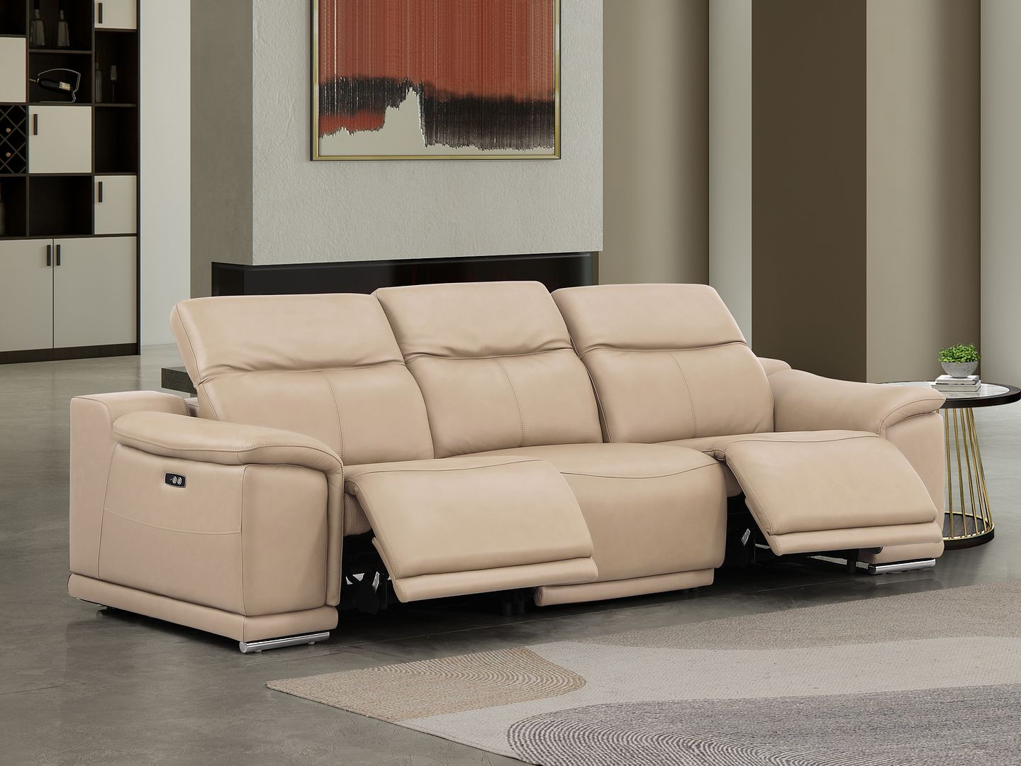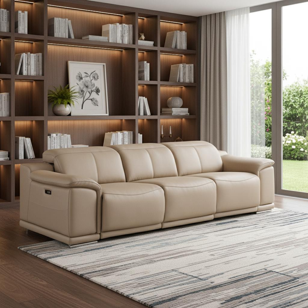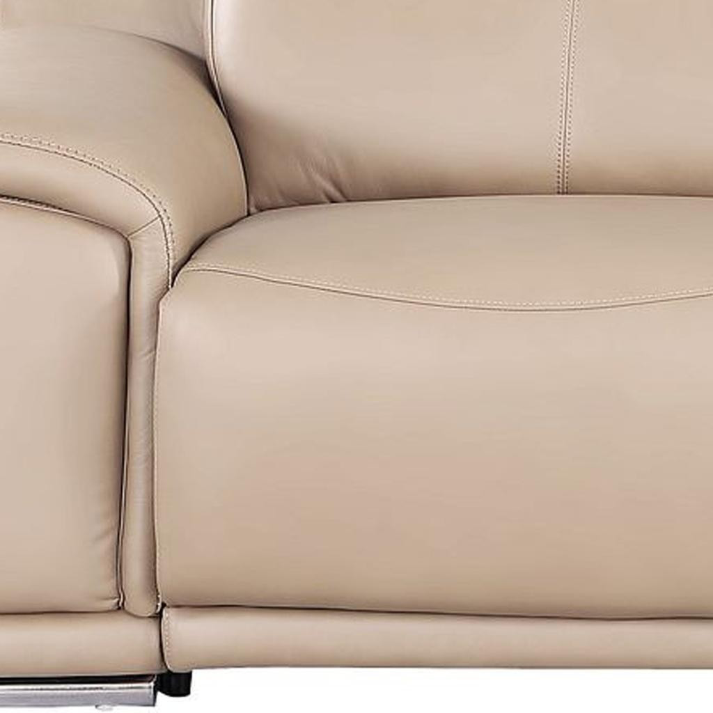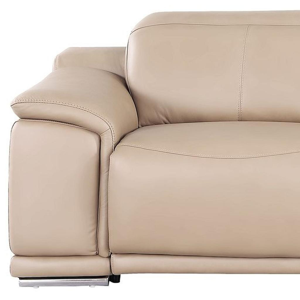 Made of the highest quality, supple leather, this 107-inch beige top grain leather reclining usb sofa will be the star of your space. The high grade premium leather used makes your lounging luxuriously comfortable and adds an elegant appeal to your space. Solid colors give you lots of decorative options and are easy to work into your decor scheme. Pocket spring construction gives this piece strong support and makes it comfortable to sit even for long periods of time. Round arms offer a comfy place to rest. Silver stainless steel legs effortlessly elevate the room and add a touch of contemporary design. Built to last, this sofa will be a great centerpiece for your room. 31.00-inch h x 107.00-inch w x 41.00-inch d.