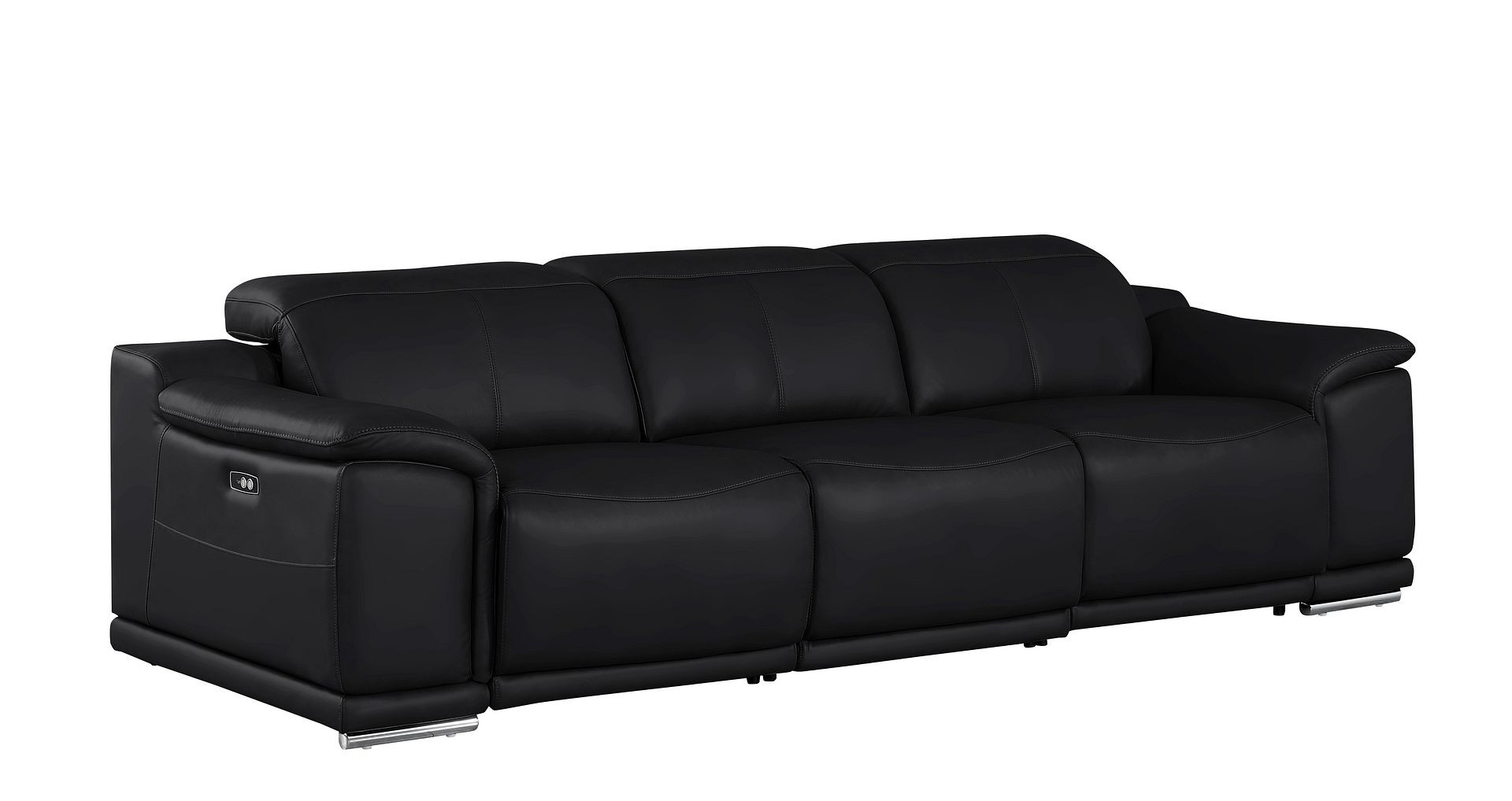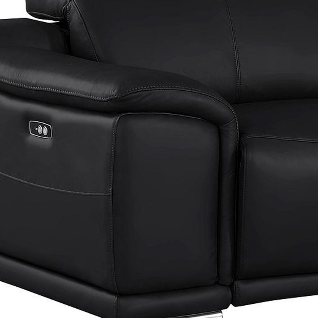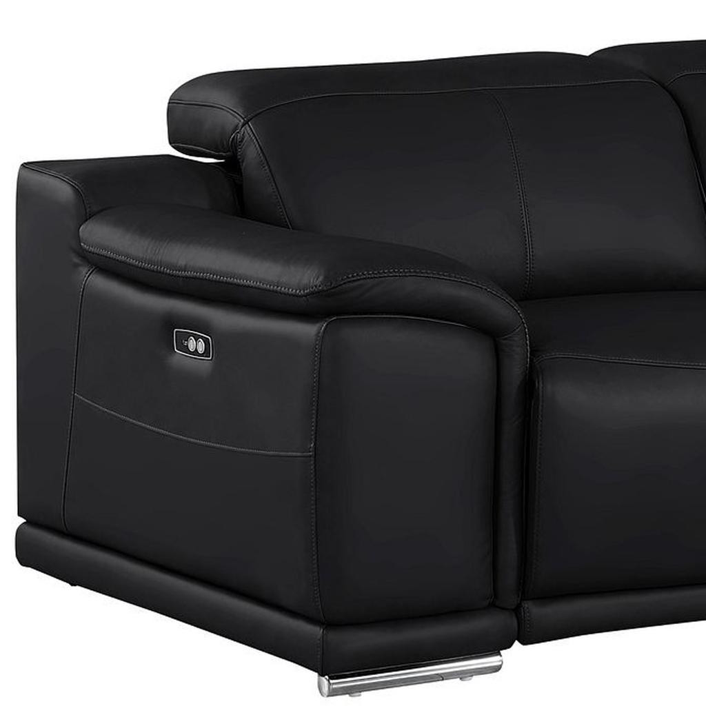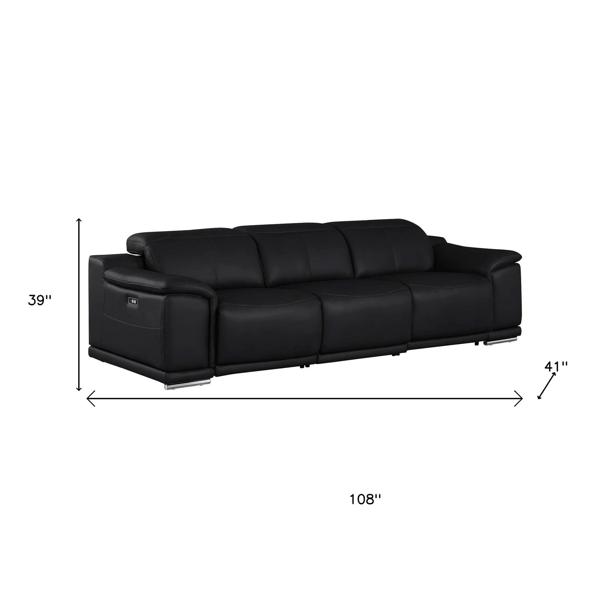 Made of the highest quality, supple leather, this 107-inch black top grain leather reclining usb sofa will be the star of your space. The high grade premium leather used makes your lounging luxuriously comfortable and adds an elegant appeal to your space. Solid colors give you lots of decorative options and are easy to work into your decor scheme. Pocket spring construction gives this piece strong support and makes it comfortable to sit even for long periods of time. Round arms offer a comfy place to rest. Silver stainless steel legs effortlessly elevate the room and add a touch of contemporary design. A great showpiece for your room, this sofa is a must have. 31.00-inch h x 107.00-inch w x 41.00-inch d.