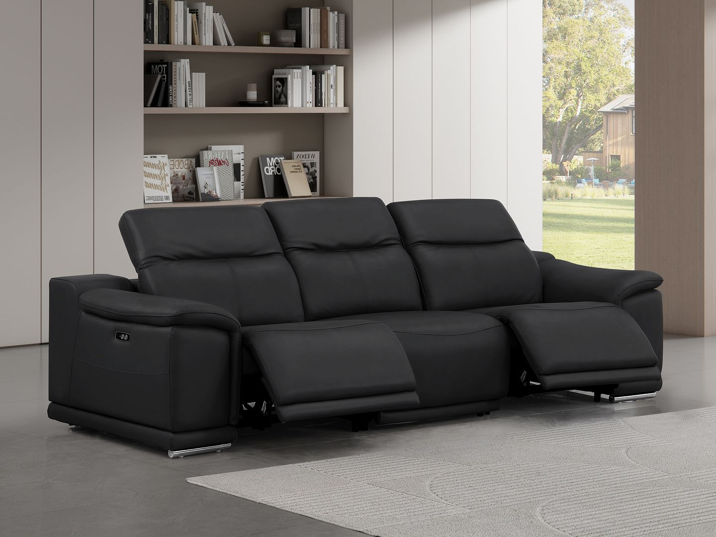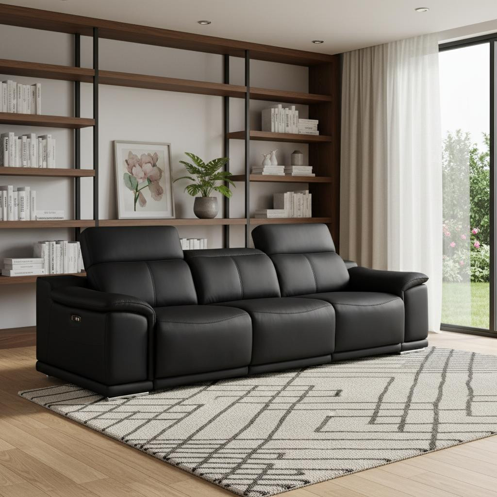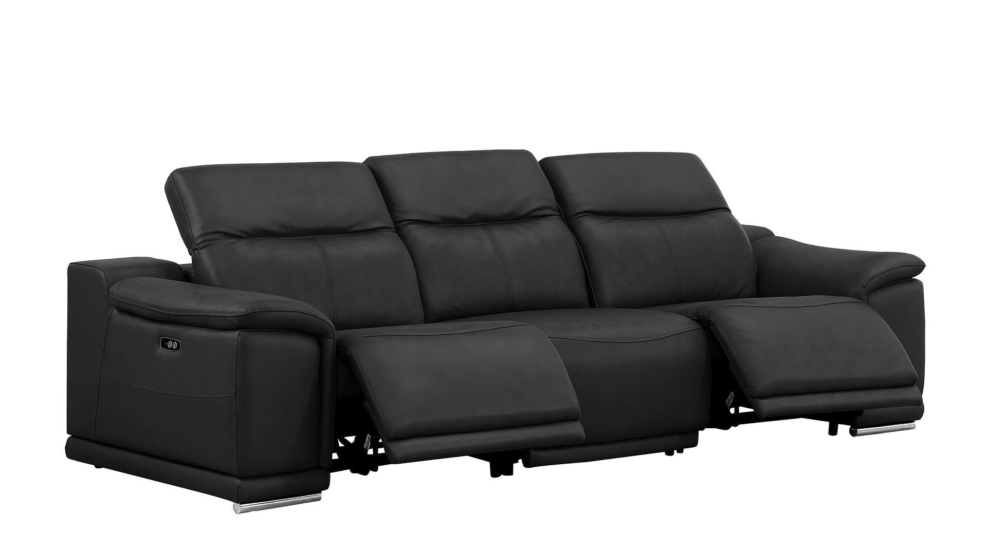 Made of the highest quality, supple leather, this 107-inch black top grain leather reclining usb sofa will be the star of your space. The high grade premium leather used makes your lounging luxuriously comfortable and adds an elegant appeal to your space. Solid colors give you lots of decorative options and are easy to work into your decor scheme. Pocket spring construction gives this piece strong support and makes it comfortable to sit even for long periods of time. Round arms offer a comfy place to rest. Silver stainless steel legs effortlessly elevate the room and add a touch of contemporary design. A great showpiece for your room, this sofa is a must have. 31.00-inch h x 107.00-inch w x 41.00-inch d.