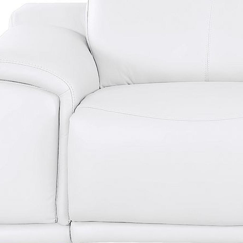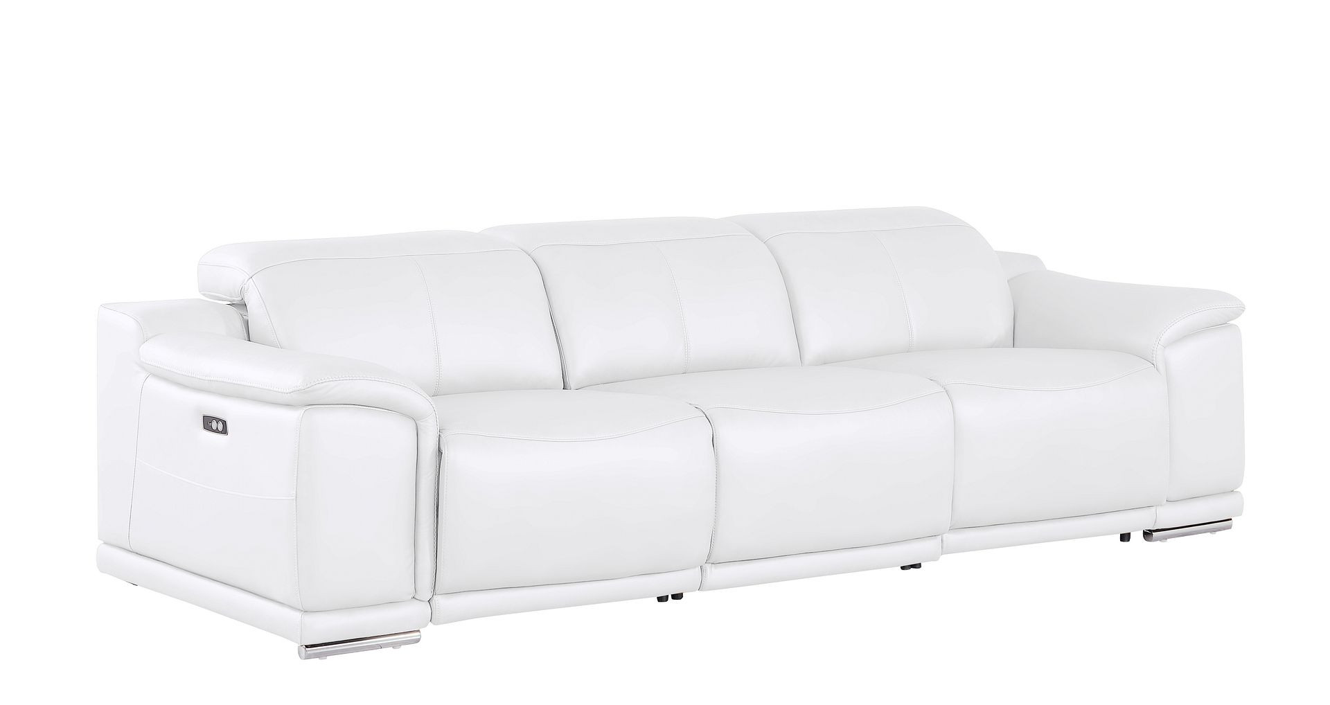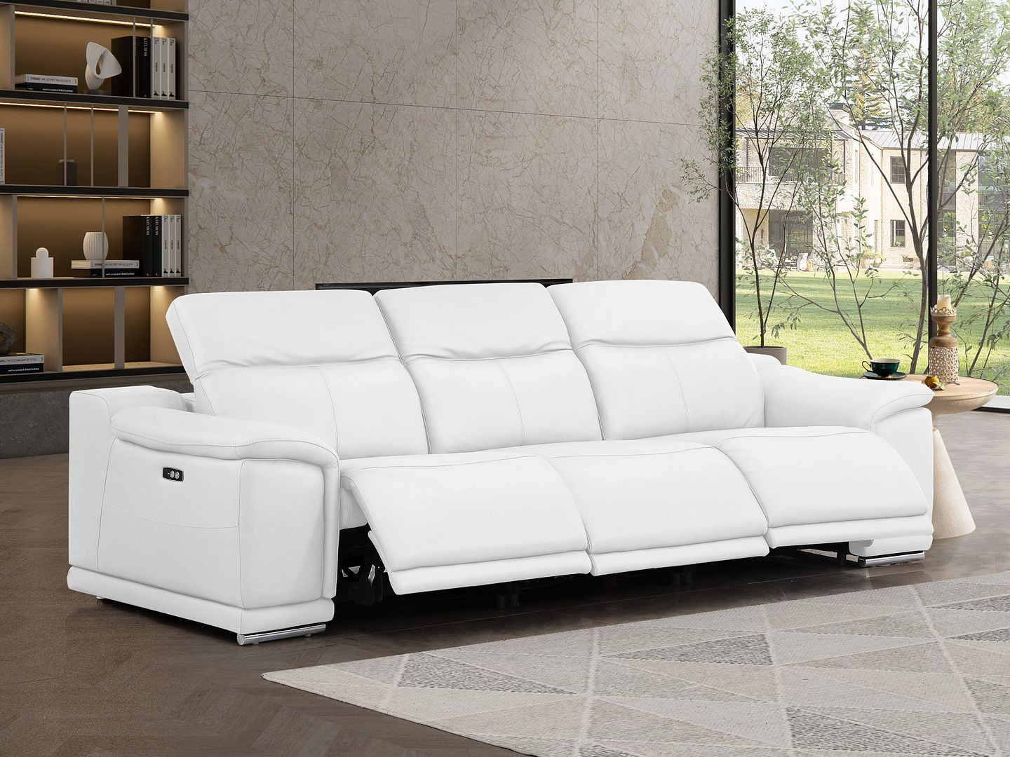 Superior construction from fabulously soft and high grade leather gives this 107-inch white top grain leather reclining usb sofa a leg up on the competition. The premium leather used makes your lounging luxuriously comfortable and adds an elegant appeal to your space. Solid colors give you lots of decorative options and are easy to work into your decor scheme. Pocket spring construction gives this piece strong support and makes it comfortable to sit even for long periods of time. Round arms offer a comfy place to rest. Silver stainless steel legs effortlessly elevate the room and add a touch of contemporary design. A great showpiece for your room, this sofa is a must have. 31.00-inch h x 107.00-inch w x 41.00-inch d.