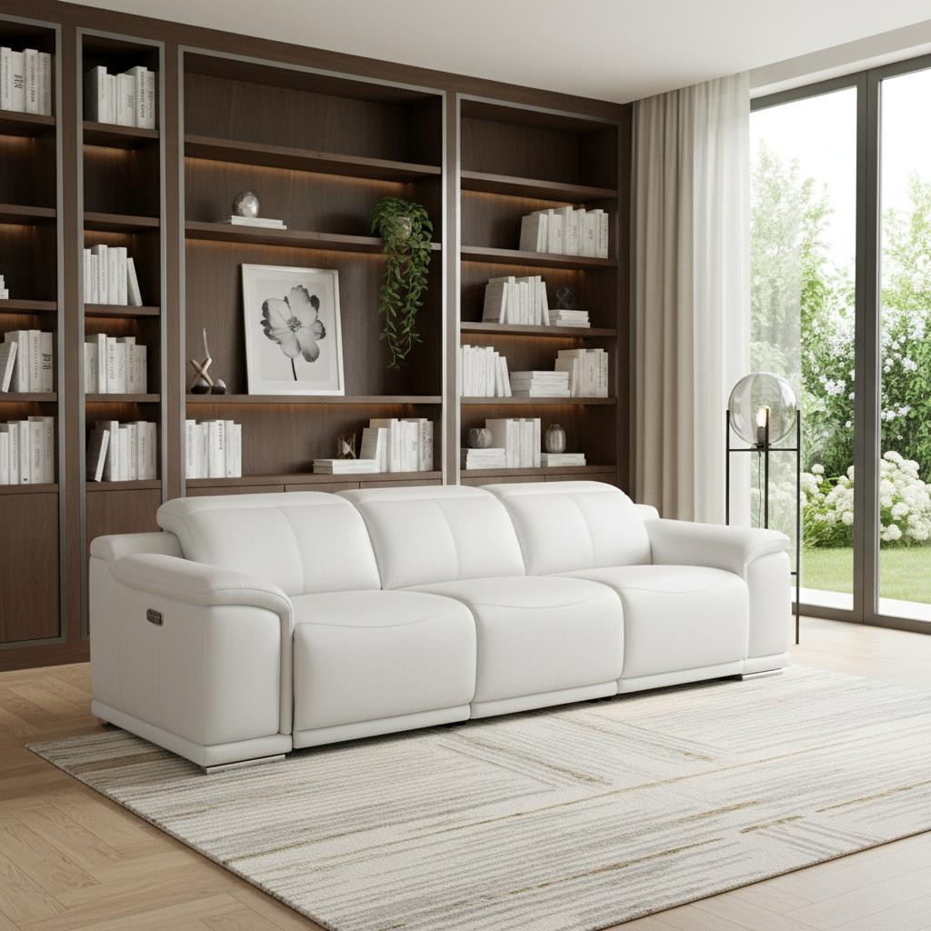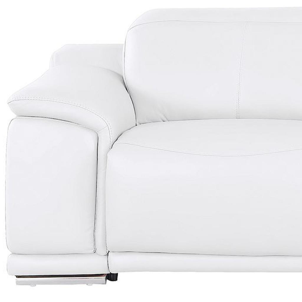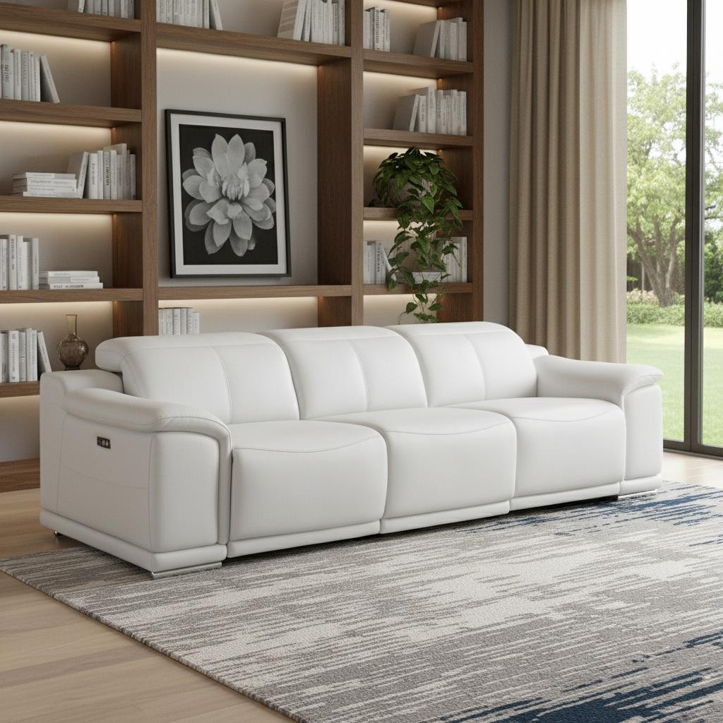 Superior construction from fabulously soft and high grade leather gives this 107-inch white top grain leather reclining usb sofa a leg up on the competition. The premium leather used makes your lounging luxuriously comfortable and adds an elegant appeal to your space. Solid colors give you lots of decorative options and are easy to work into your decor scheme. Pocket spring construction gives this piece strong support and makes it comfortable to sit even for long periods of time. Round arms offer a comfy place to rest. Silver stainless steel legs effortlessly elevate the room and add a touch of contemporary design. A great showpiece for your room, this sofa is a must have. 31.00-inch h x 107.00-inch w x 41.00-inch d.