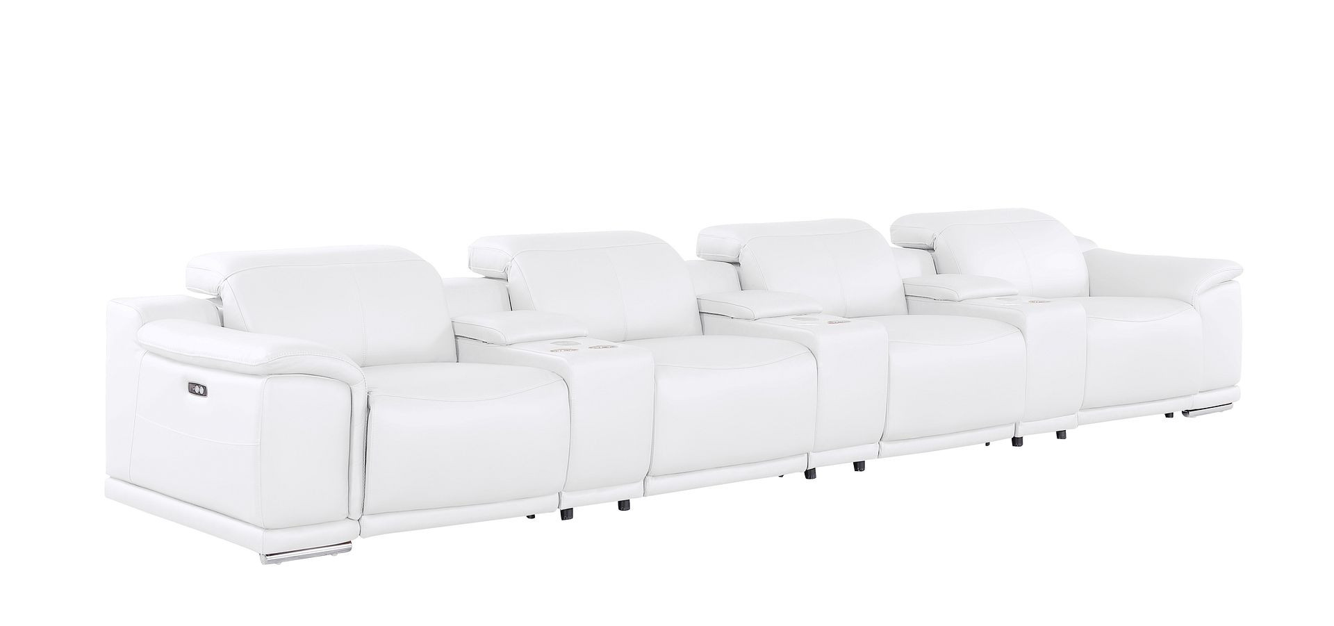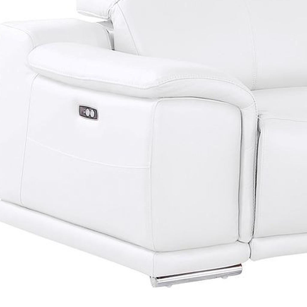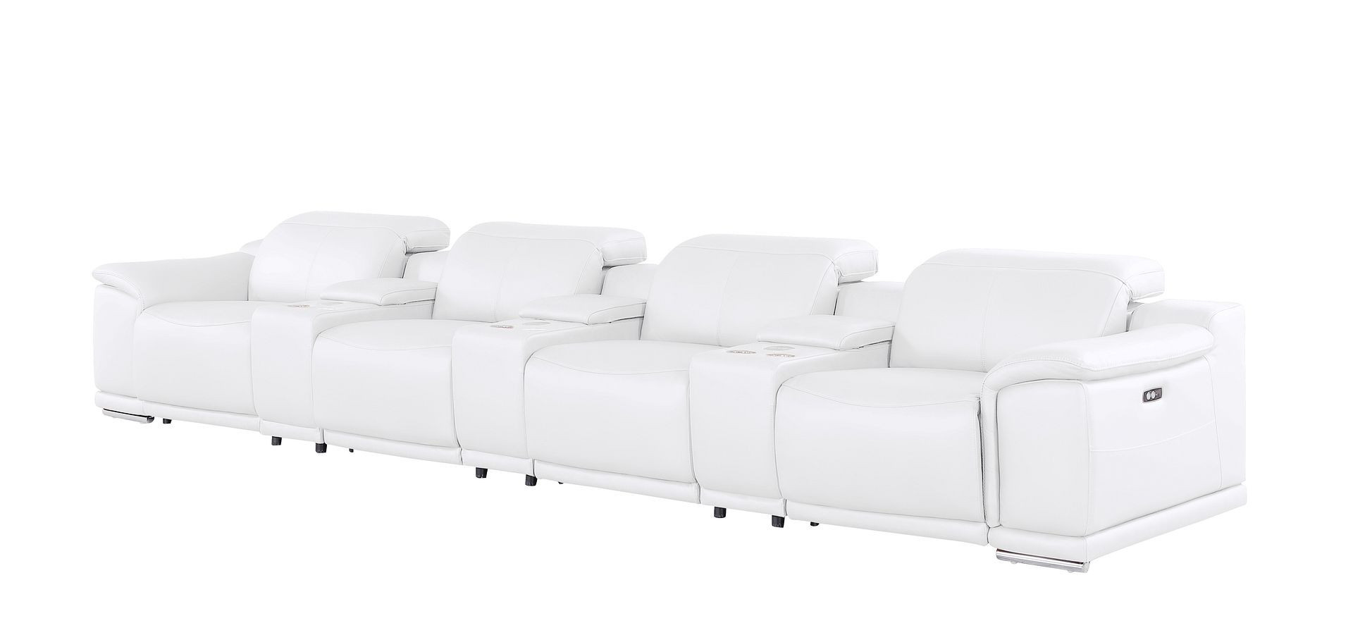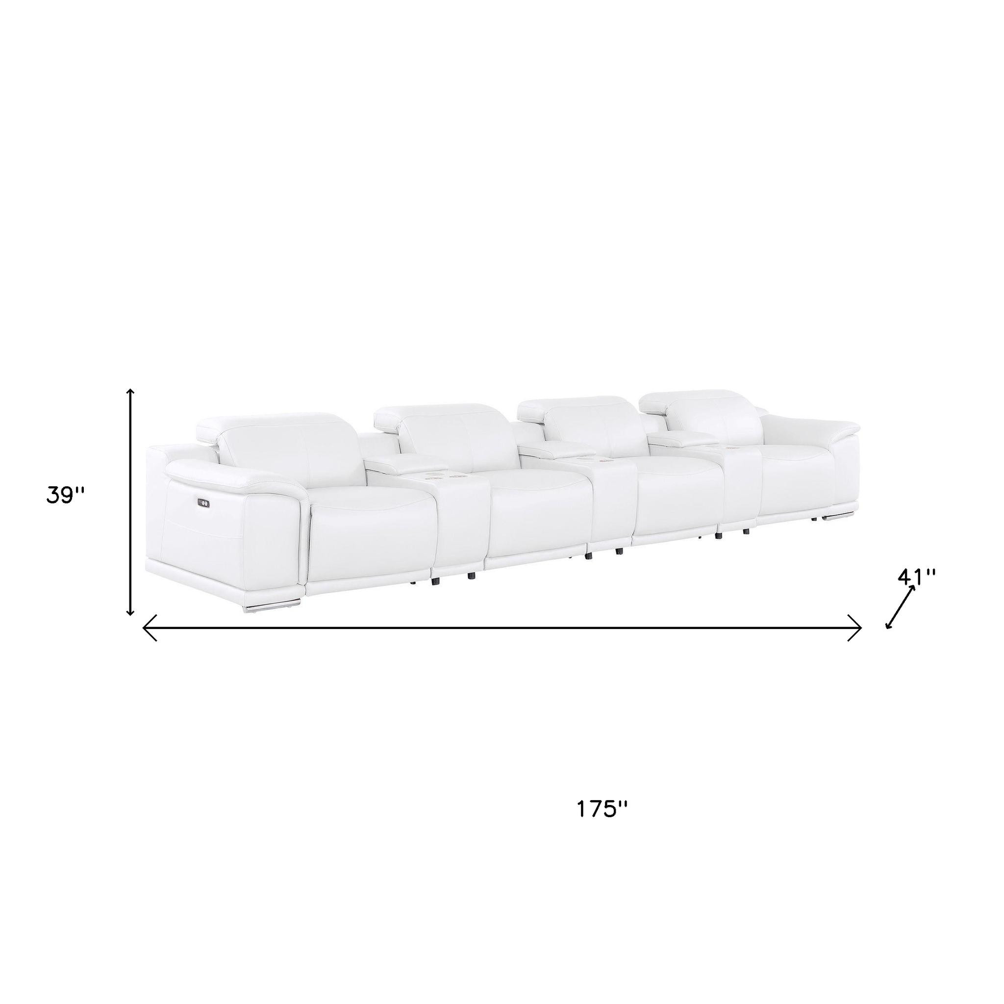 Made of the highest quality, supple leather, this 175-inch white top grain leather reclining usb sofa and storage will be the star of your space. The high grade premium leather used makes your lounging luxuriously comfortable and adds an elegant appeal to your space. Solid colors give you lots of decorative options and are easy to work into your decor scheme. Pocket spring construction gives this piece strong support and makes it comfortable to sit even for long periods of time. Round arms offer a comfy place to rest. Silver stainless steel legs effortlessly elevate the room and add a touch of contemporary design. A great showpiece for your room, this sofa is a must have. 31.00-inch h x 175.00-inch w x 41.00-inch d.