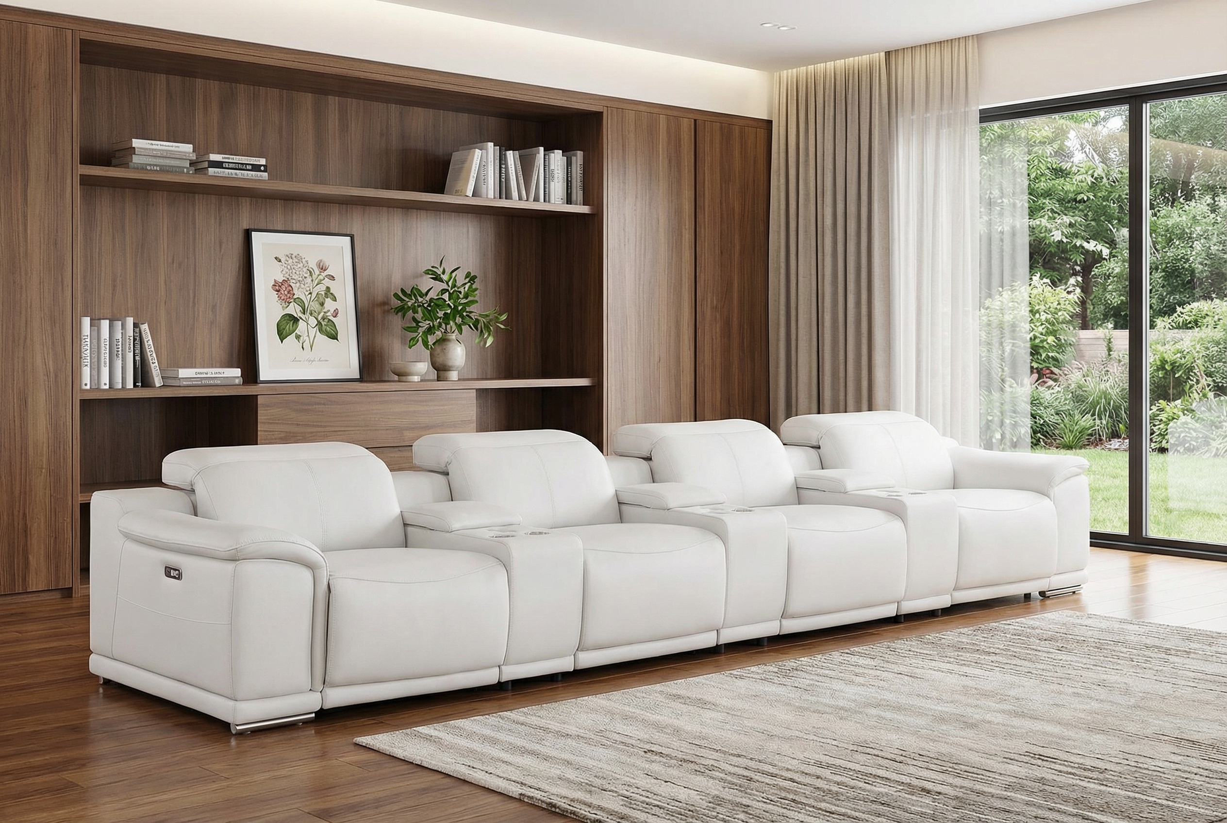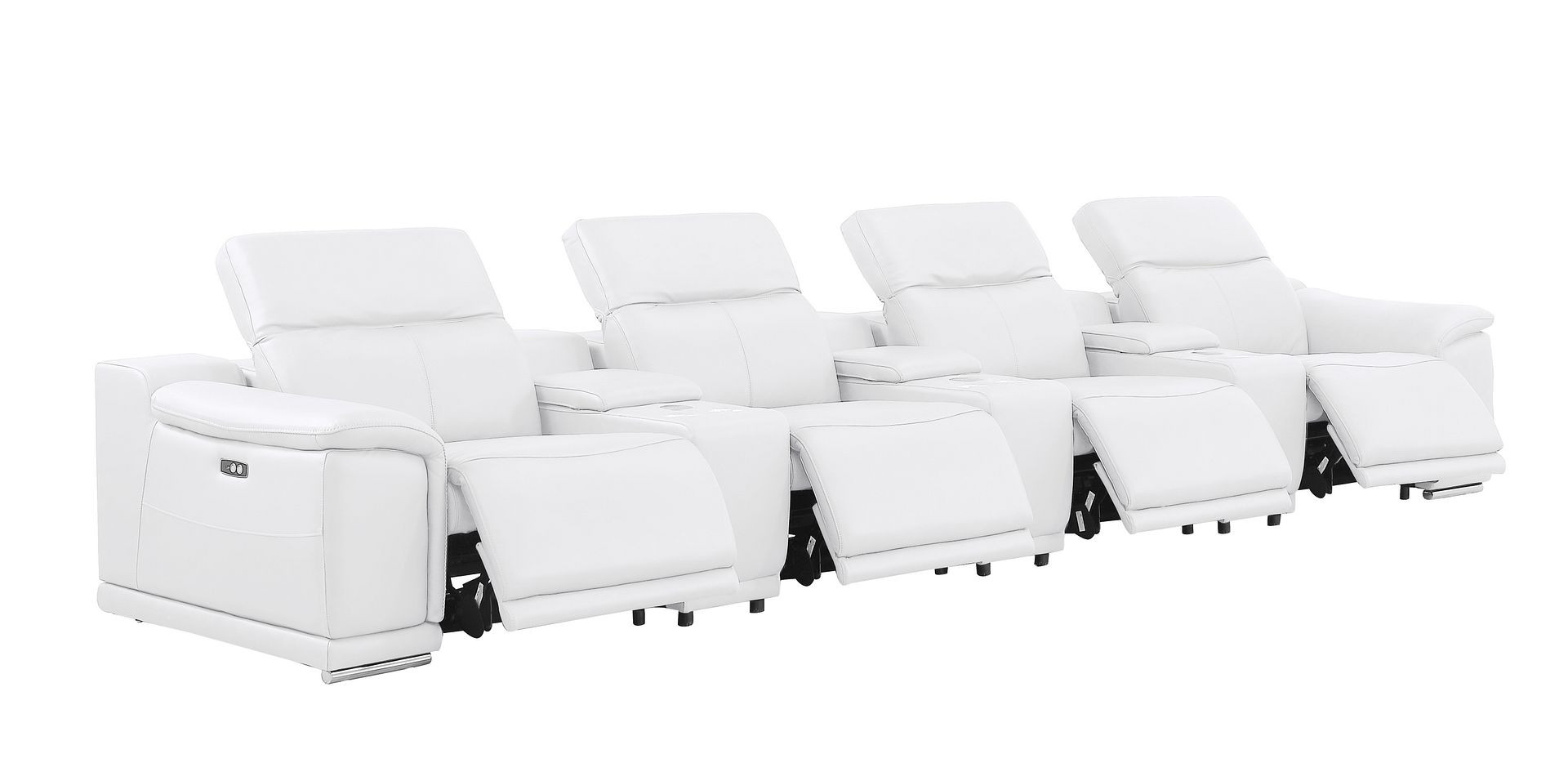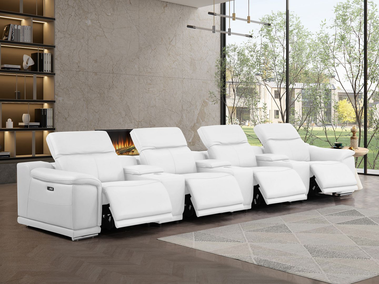Made of the highest quality, supple leather, this 175-inch white top grain leather reclining usb sofa and storage will be the star of your space. The high grade premium leather used makes your lounging luxuriously comfortable and adds an elegant appeal to your space. Solid colors give you lots of decorative options and are easy to work into your decor scheme. Pocket spring construction gives this piece strong support and makes it comfortable to sit even for long periods of time. Round arms offer a comfy place to rest. Silver stainless steel legs effortlessly elevate the room and add a touch of contemporary design. A great showpiece for your room, this sofa is a must have. 31.00-inch h x 175.00-inch w x 41.00-inch d.