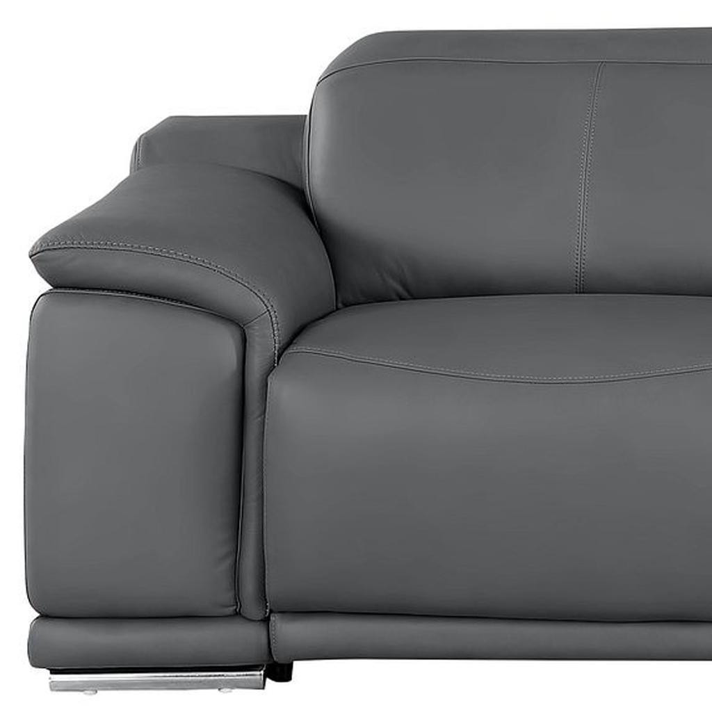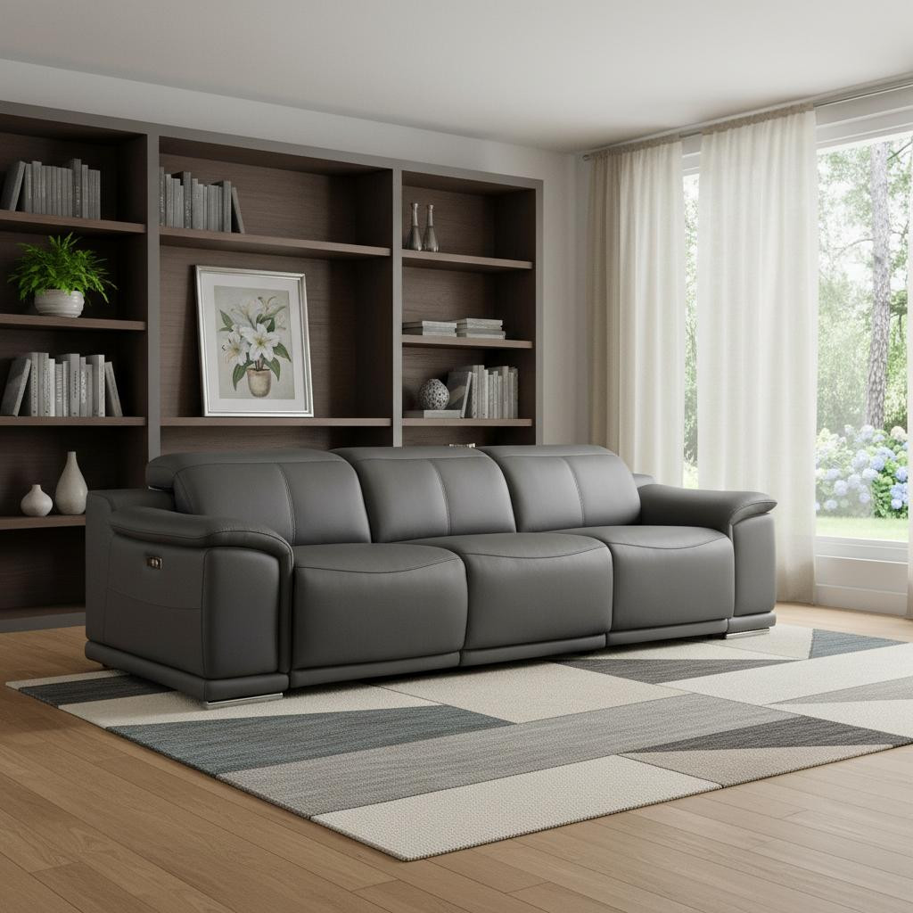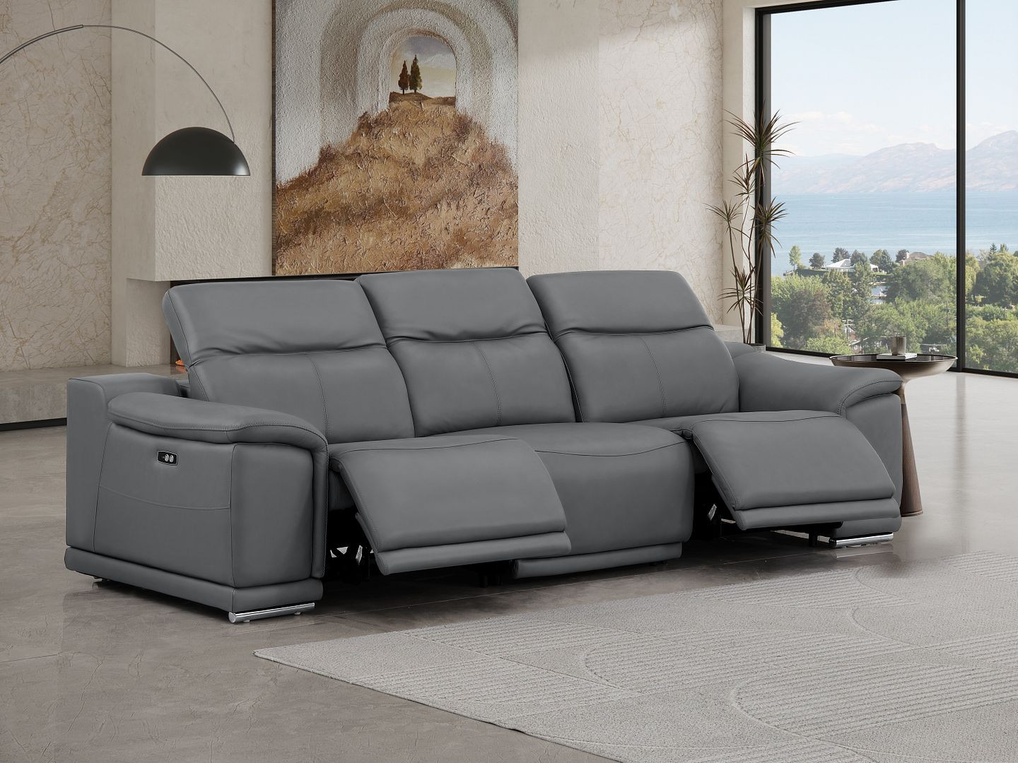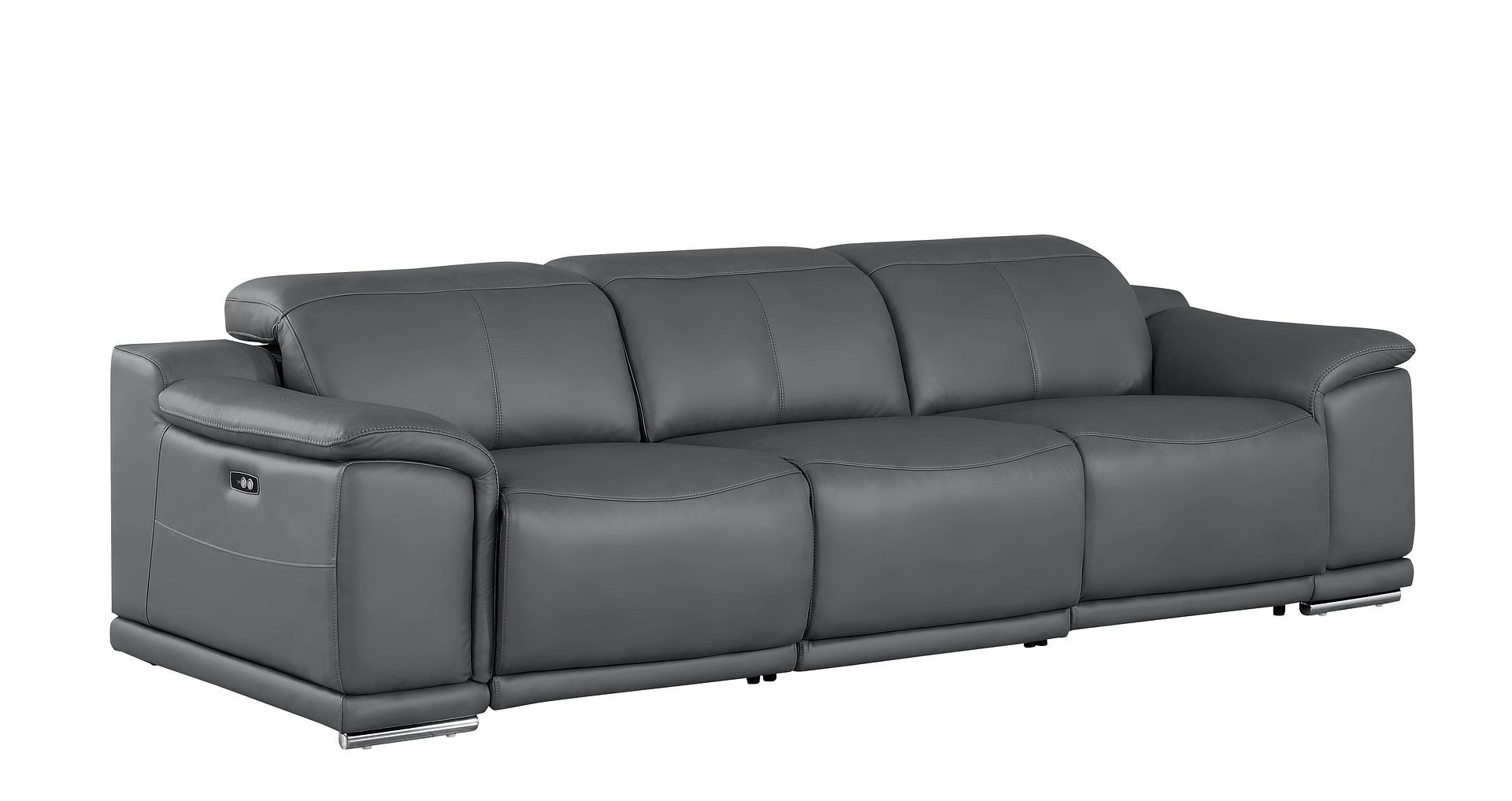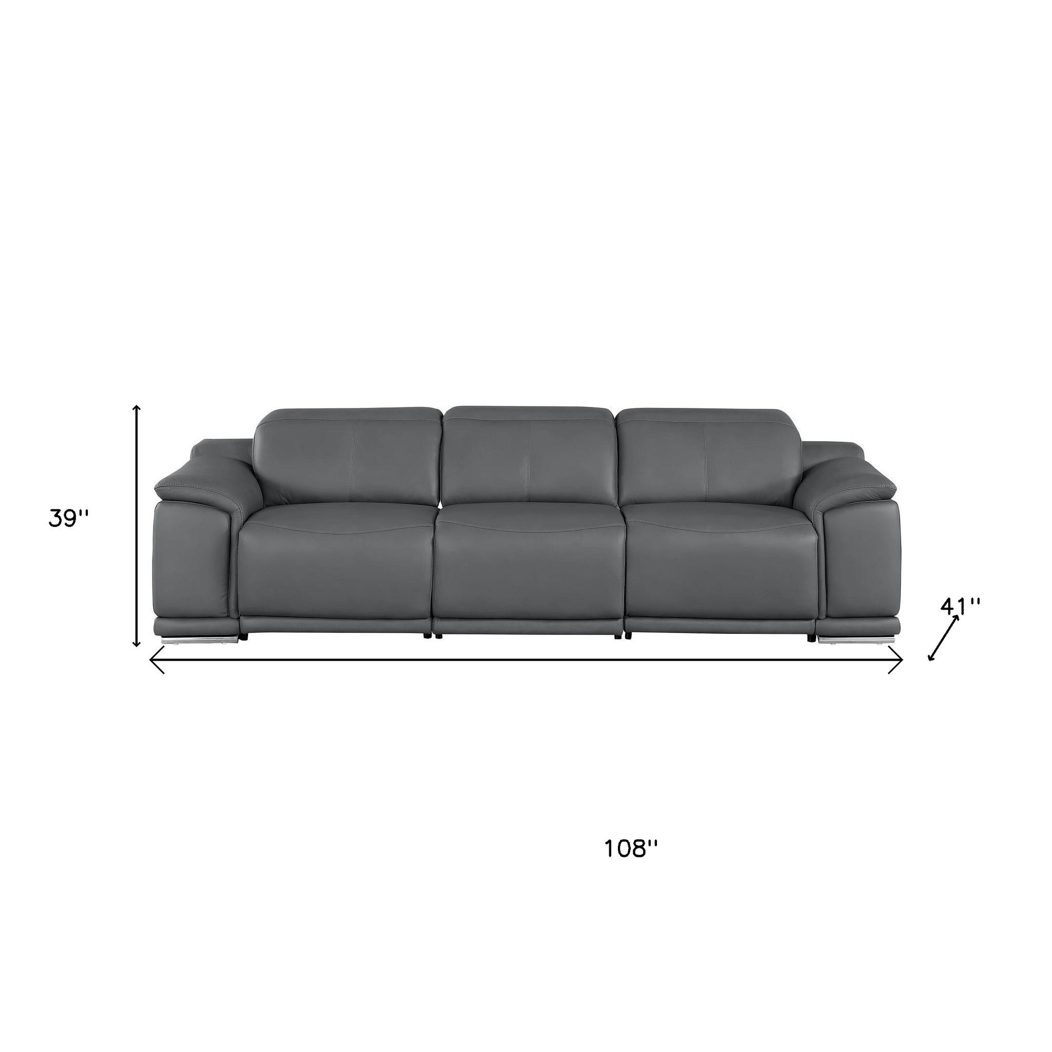An interior designer's dream, this buttery soft high grade leather 107-inch dark gray top grain leather reclining usb sofa will bring just the right touch to your space. The premium leather used makes your lounging luxuriously comfortable and adds an elegant appeal to your space. Solid colors give you lots of decorative options and are easy to work into your decor scheme. Pocket spring construction gives this piece strong support and makes it comfortable to sit even for long periods of time. Round arms offer a comfy place to rest. Silver stainless steel legs effortlessly elevate the room and add a touch of contemporary design. Built to last, this sofa will be a great centerpiece for your room. 31.00-inch h x 107.00-inch w x 41.00-inch d.