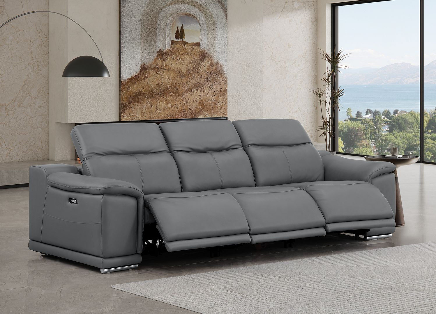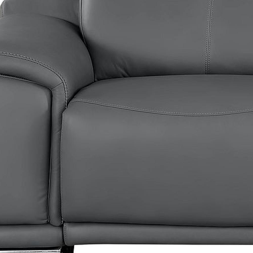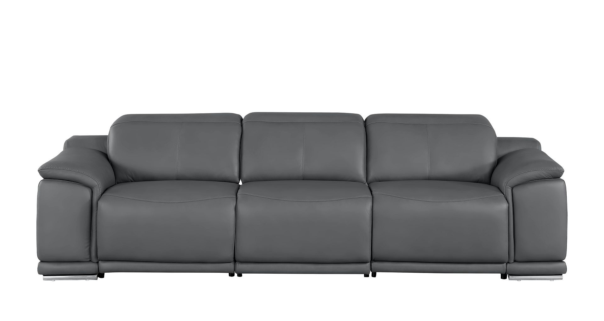 An interior designer's dream, this buttery soft high grade leather 107-inch dark gray top grain leather reclining usb sofa will bring just the right touch to your space. The premium leather used makes your lounging luxuriously comfortable and adds an elegant appeal to your space. Solid colors give you lots of decorative options and are easy to work into your decor scheme. Pocket spring construction gives this piece strong support and makes it comfortable to sit even for long periods of time. Round arms offer a comfy place to rest. Silver stainless steel legs effortlessly elevate the room and add a touch of contemporary design. Built to last, this sofa will be a great centerpiece for your room. 31.00-inch h x 107.00-inch w x 41.00-inch d.