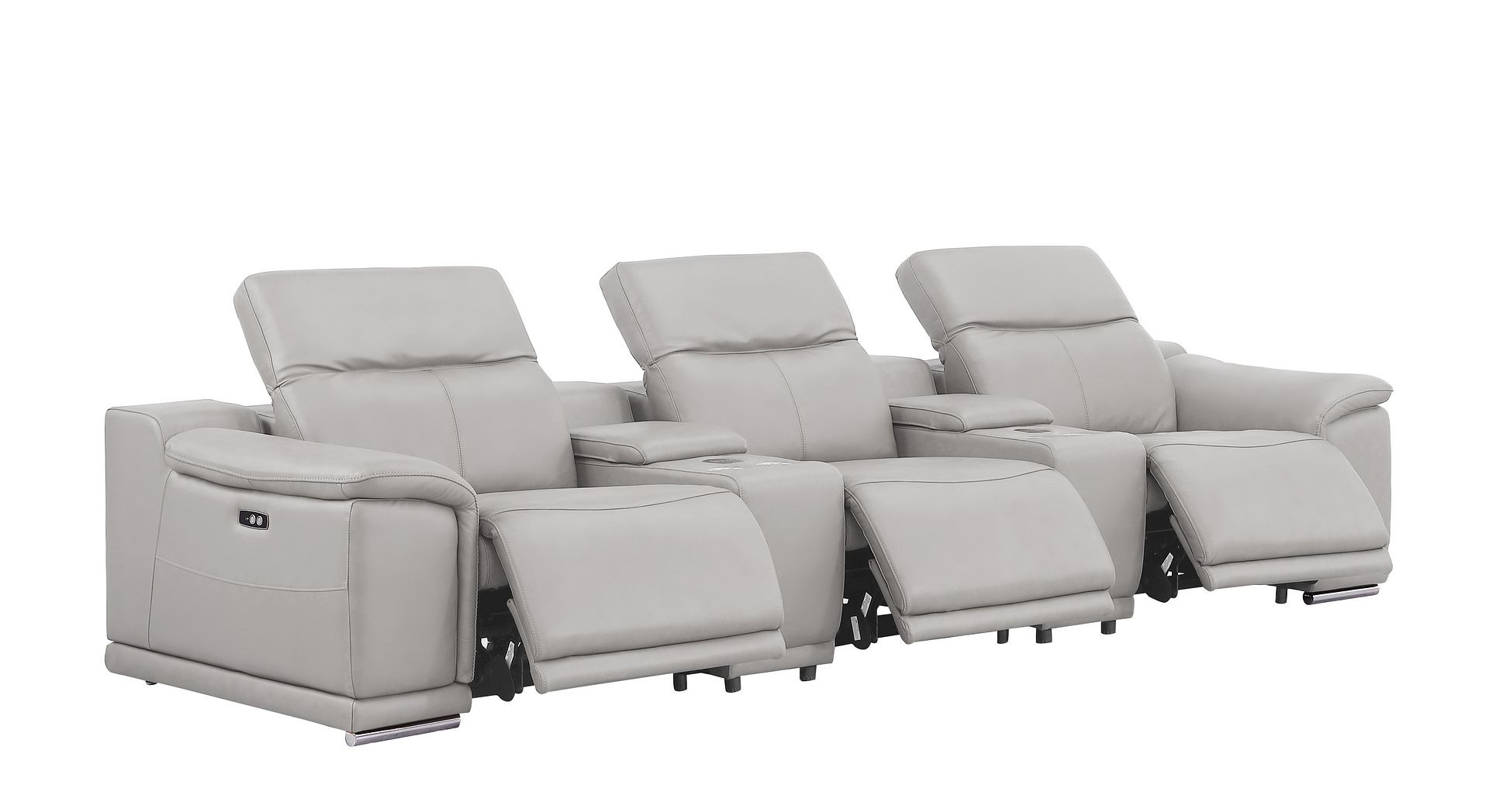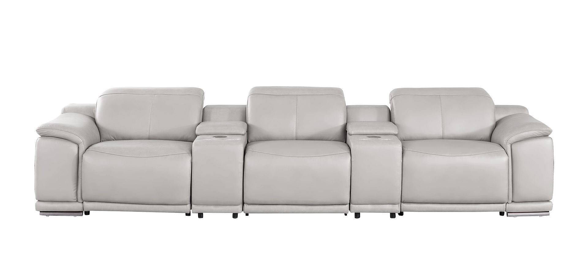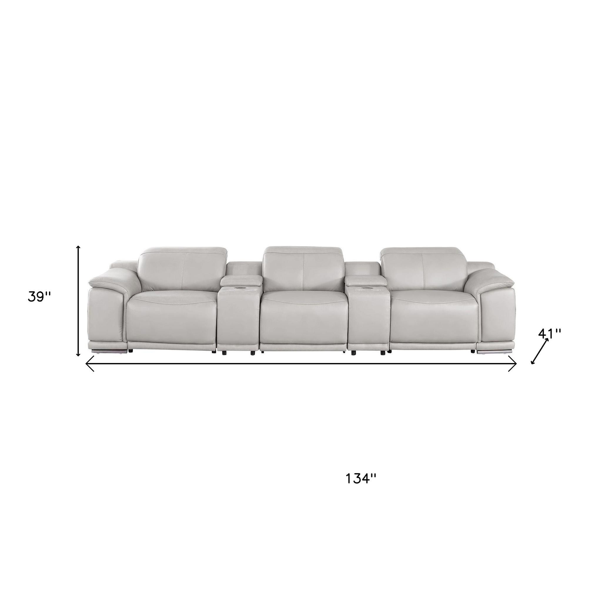 Made of the highest quality, supple leather, this 134-inch light gray top grain leather reclining usb sofa and storage will be the star of your space. The high grade premium leather used makes your lounging luxuriously comfortable and adds an elegant appeal to your space. Solid colors give you lots of decorative options and are easy to work into your decor scheme. Pocket spring construction gives this piece strong support and makes it comfortable to sit even for long periods of time. Round arms offer a comfy place to rest. Silver stainless steel legs effortlessly elevate the room and add a touch of contemporary design. A great showpiece for your room, this sofa is a must have. 31.00-inch h x 134.00-inch w x 41.00-inch d.