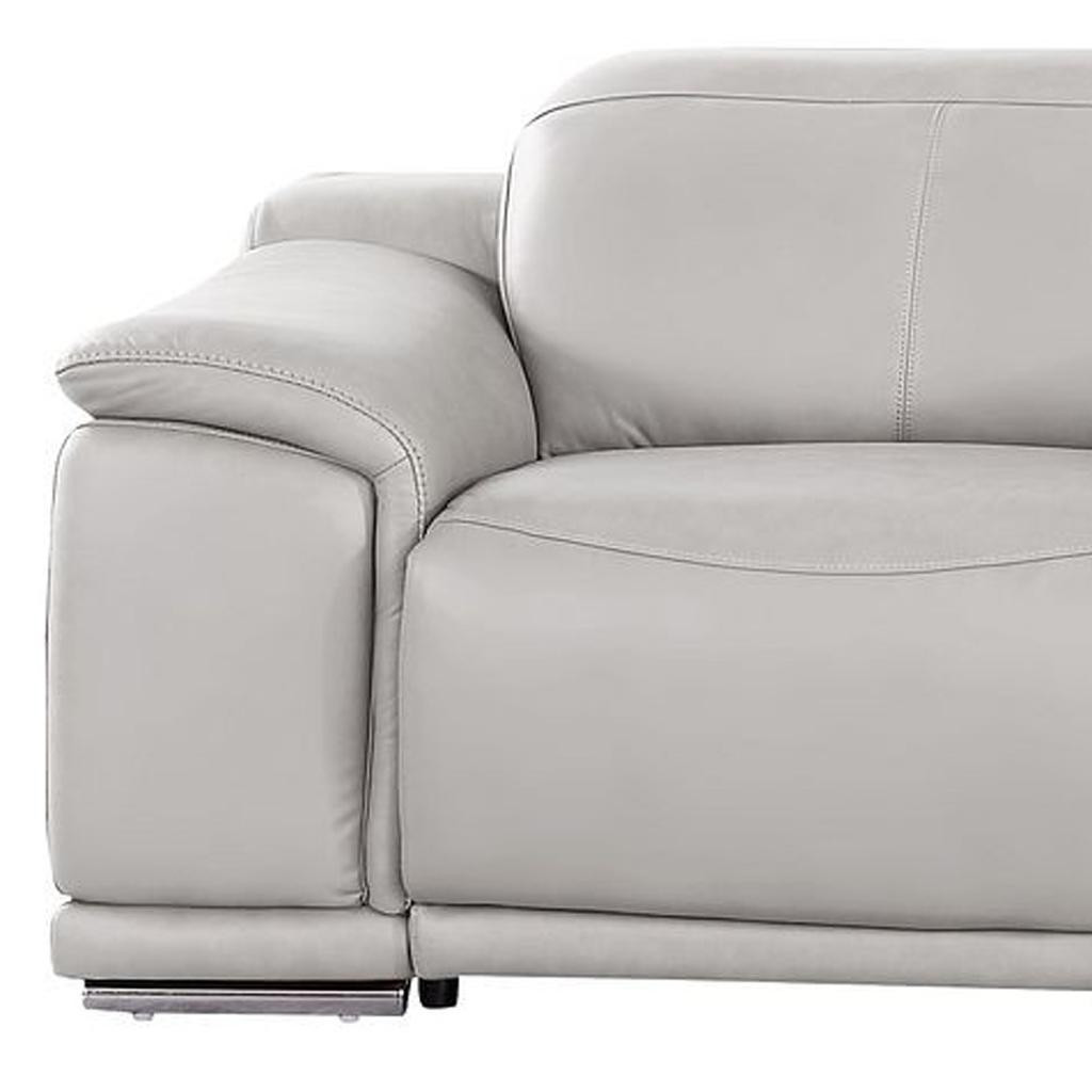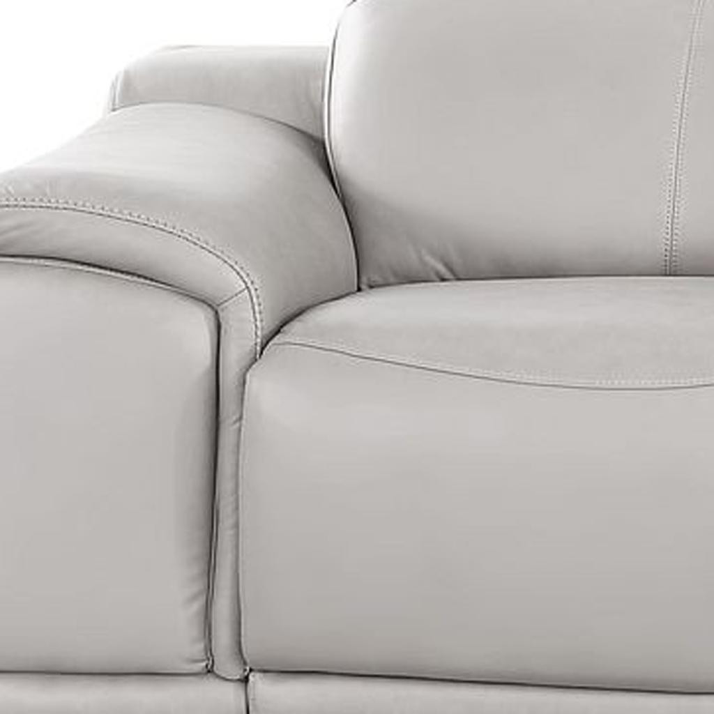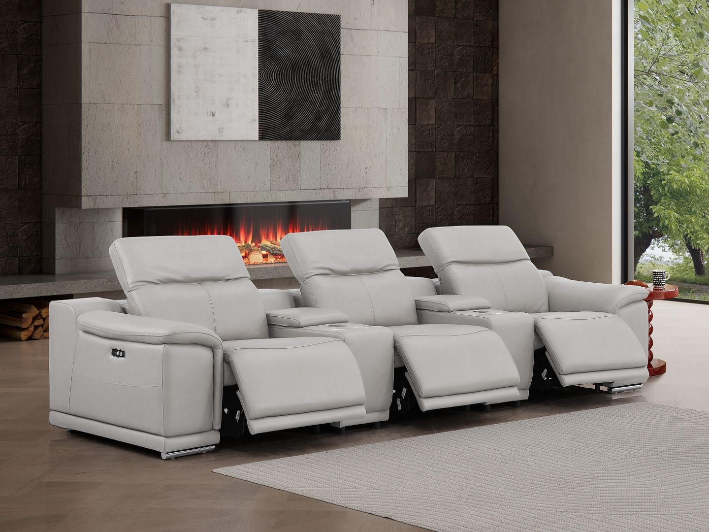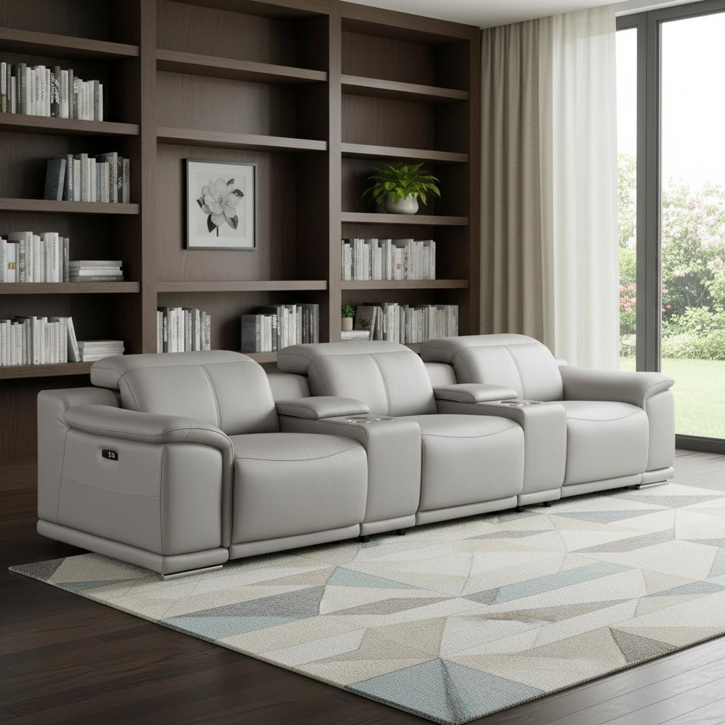 Made of the highest quality, supple leather, this 134-inch light gray top grain leather reclining usb sofa and storage will be the star of your space. The high grade premium leather used makes your lounging luxuriously comfortable and adds an elegant appeal to your space. Solid colors give you lots of decorative options and are easy to work into your decor scheme. Pocket spring construction gives this piece strong support and makes it comfortable to sit even for long periods of time. Round arms offer a comfy place to rest. Silver stainless steel legs effortlessly elevate the room and add a touch of contemporary design. A great showpiece for your room, this sofa is a must have. 31.00-inch h x 134.00-inch w x 41.00-inch d.