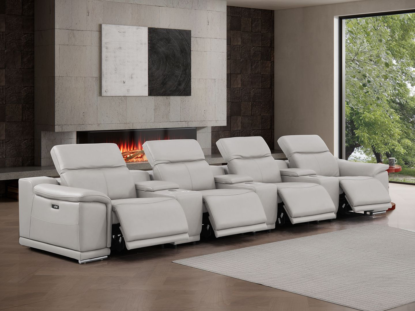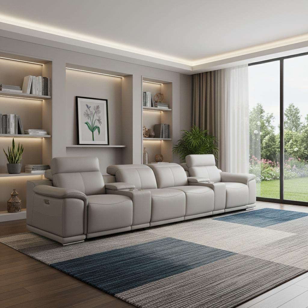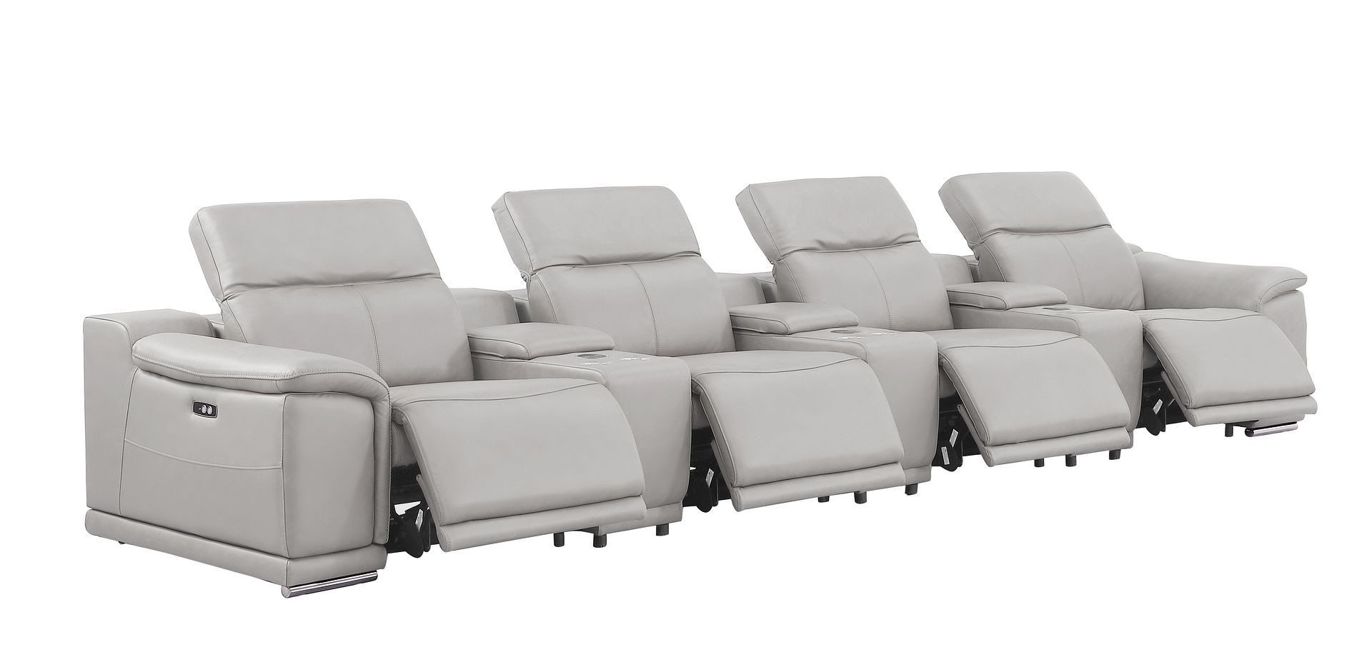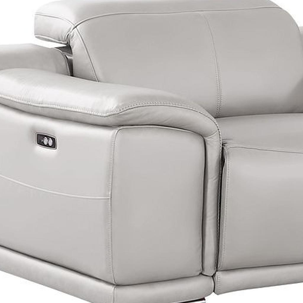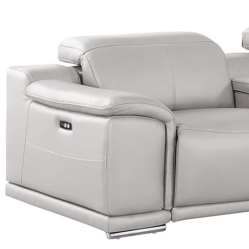 Made of the highest quality, supple leather, this 175-inch light gray top grain leather reclining usb sofa and storage will be the star of your space. The high grade premium leather used makes your lounging luxuriously comfortable and adds an elegant appeal to your space. Solid colors give you lots of decorative options and are easy to work into your decor scheme. Pocket spring construction gives this piece strong support and makes it comfortable to sit even for long periods of time. Round arms offer a comfy place to rest. Silver stainless steel legs effortlessly elevate the room and add a touch of contemporary design. Built to last, this sofa will be a great centerpiece for your room. 31.00-inch h x 175.00-inch w x 41.00-inch d.