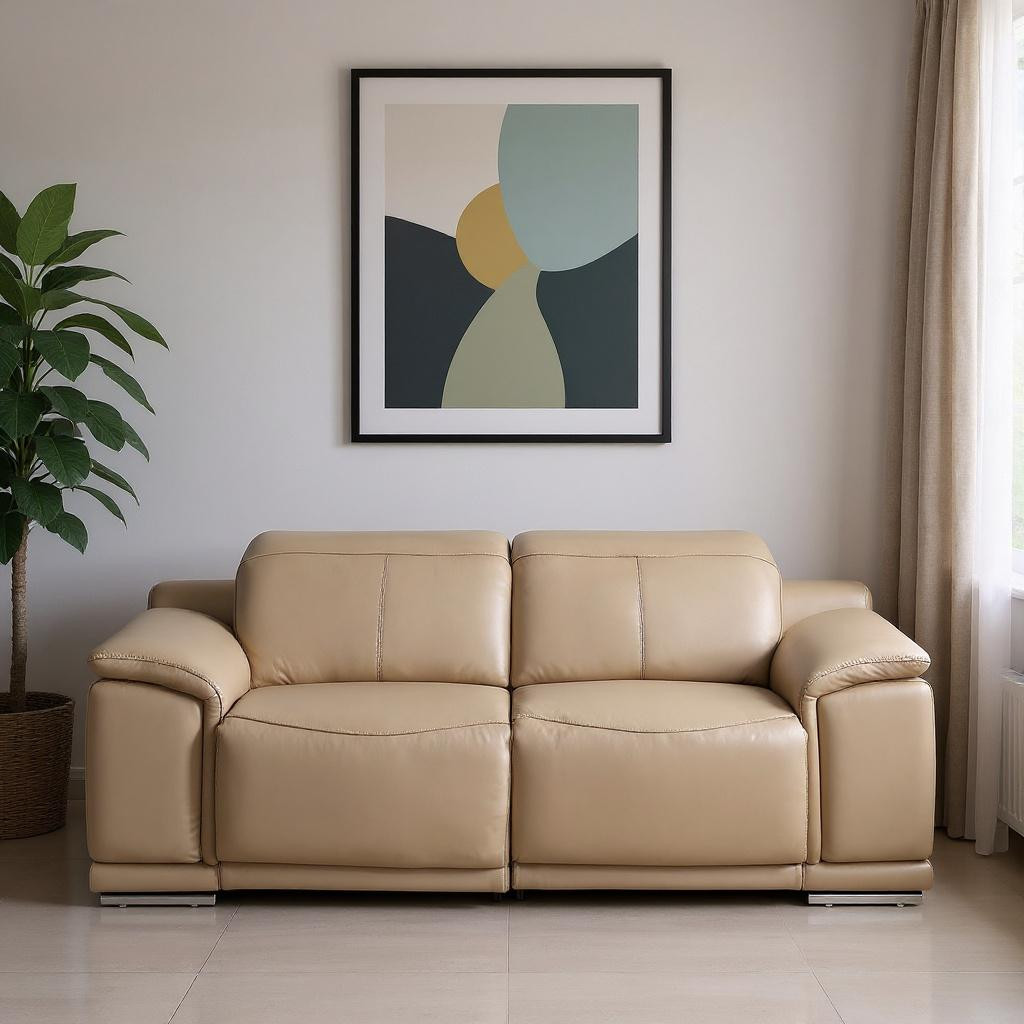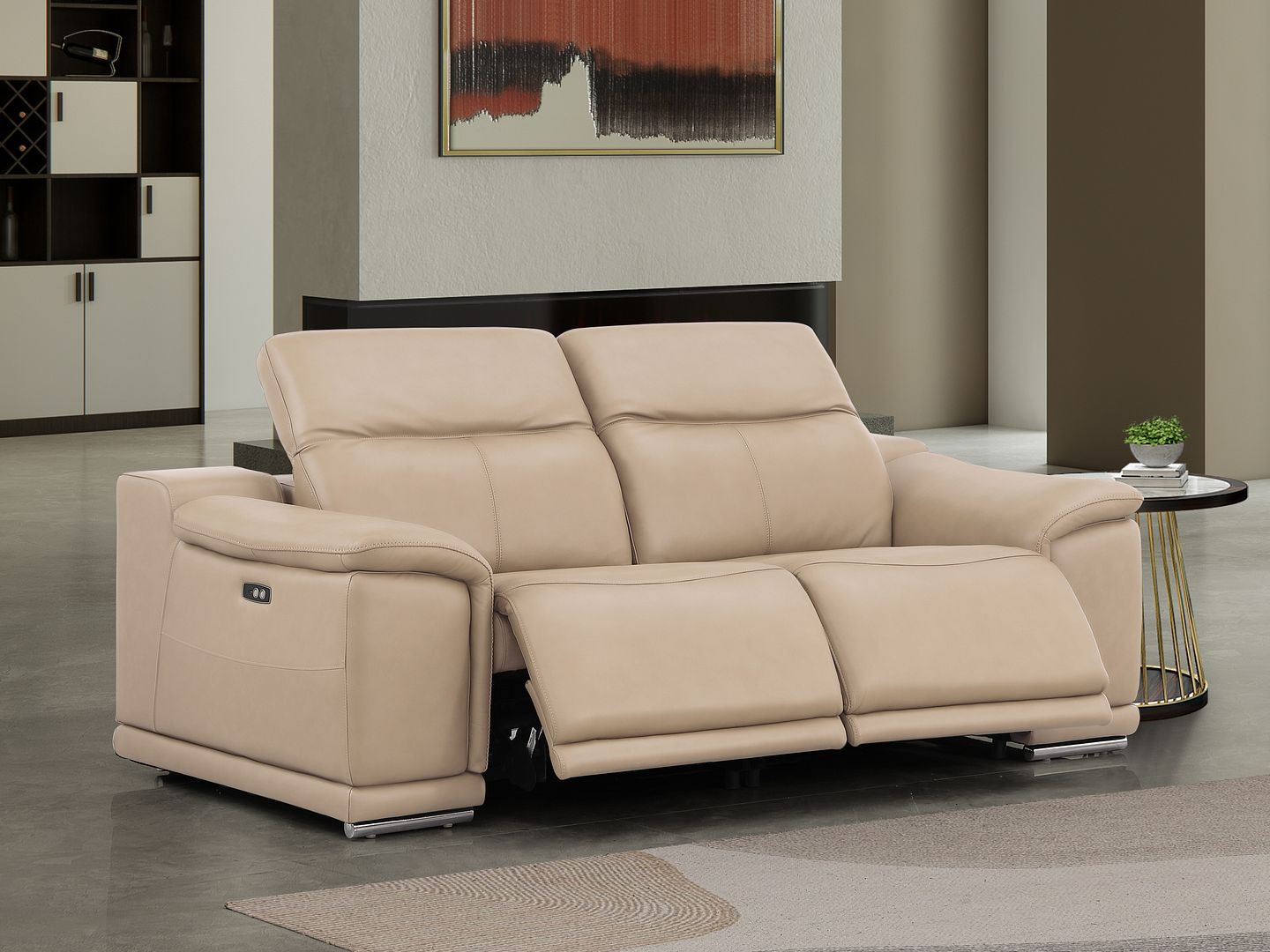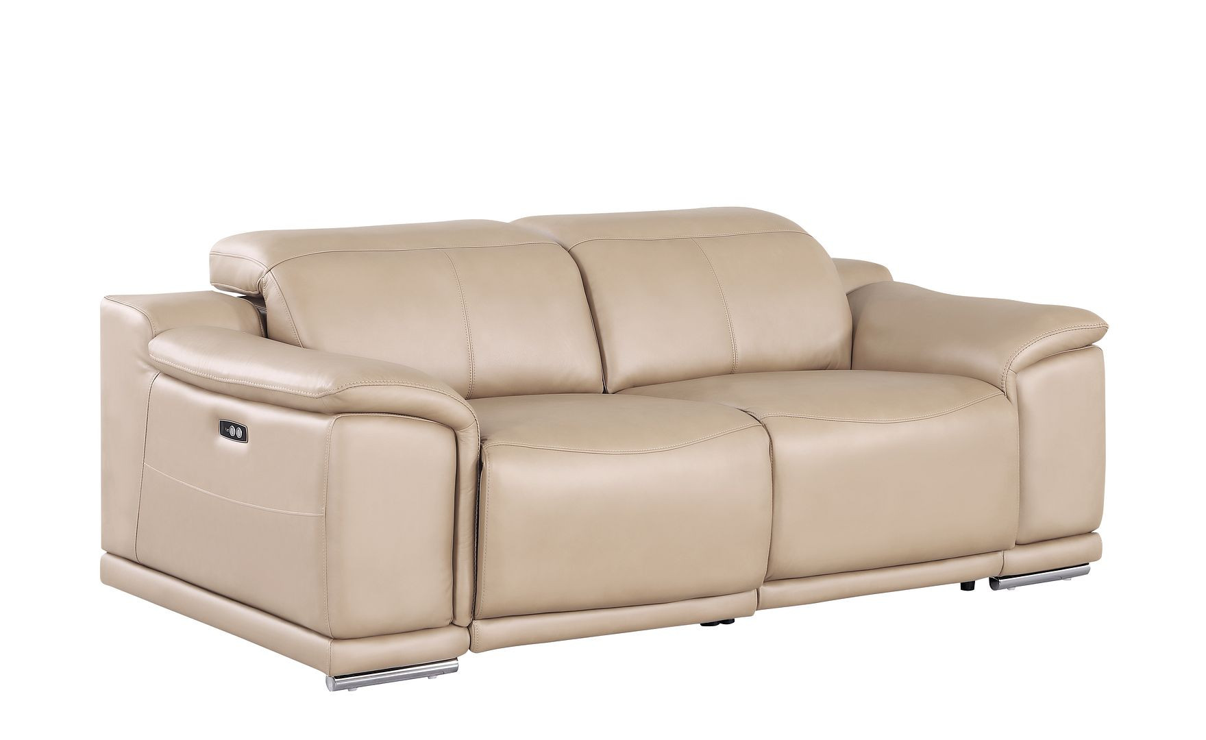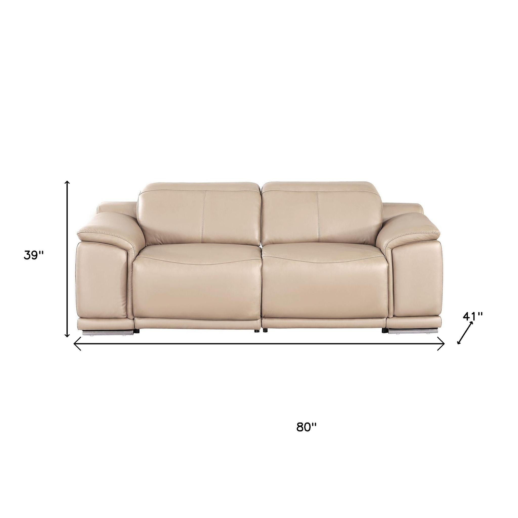 An interior designer's dream, this buttery soft high grade leather 80-inch beige and silver leather power reclining loveseat will bring just the right touch to your space. The high grade premium leather used makes your lounging luxuriously comfortable and adds an elegant appeal to your space. Pillow top arms offer a comfy place to rest and give this piece some interest and shape. Silver steel legs effortlessly elevate the room and add a touch of contemporary design. A great showpiece for your room, this sofa is a must have. 39.00-inch h x 80.00-inch w x 41.00-inch d.