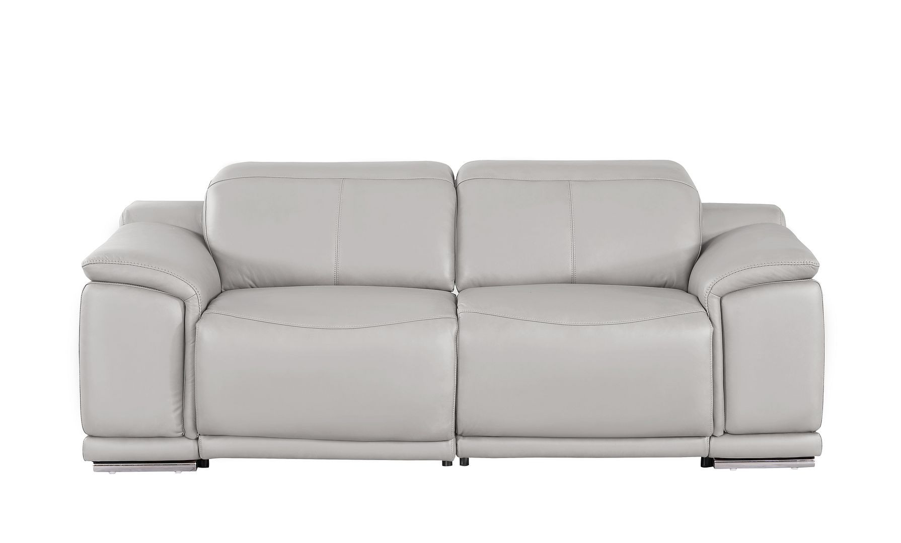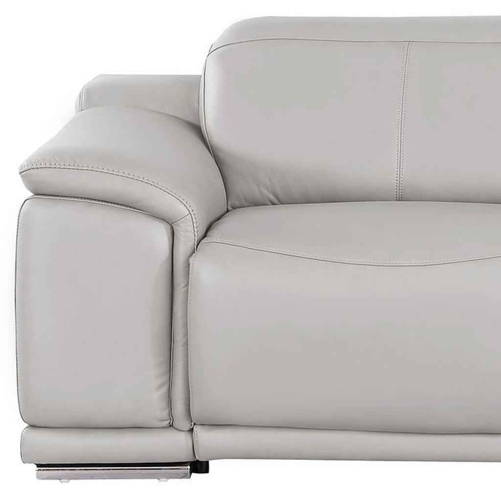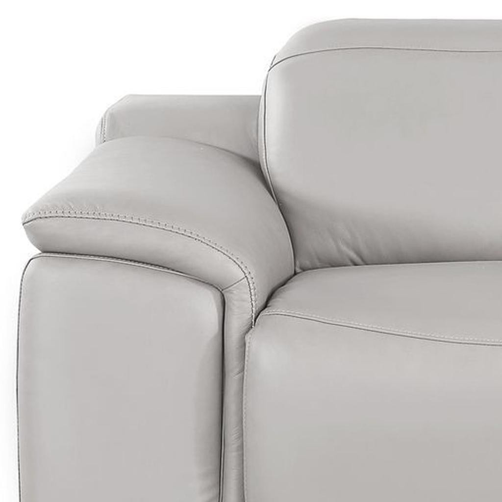 Made of top quality, supple leather, this 80-inch ash gray and silver leather power reclining loveseat will be the star of your space. The high grade premium leather used makes your lounging luxuriously comfortable and adds an elegant appeal to your space. Pillow top arms offer a comfy place to rest and give this piece some interest and shape. Silver steel legs effortlessly elevate the room and add a touch of contemporary design. A great showpiece for your room, this sofa is a must have. 39.00-inch h x 80.00-inch w x 41.00-inch d.