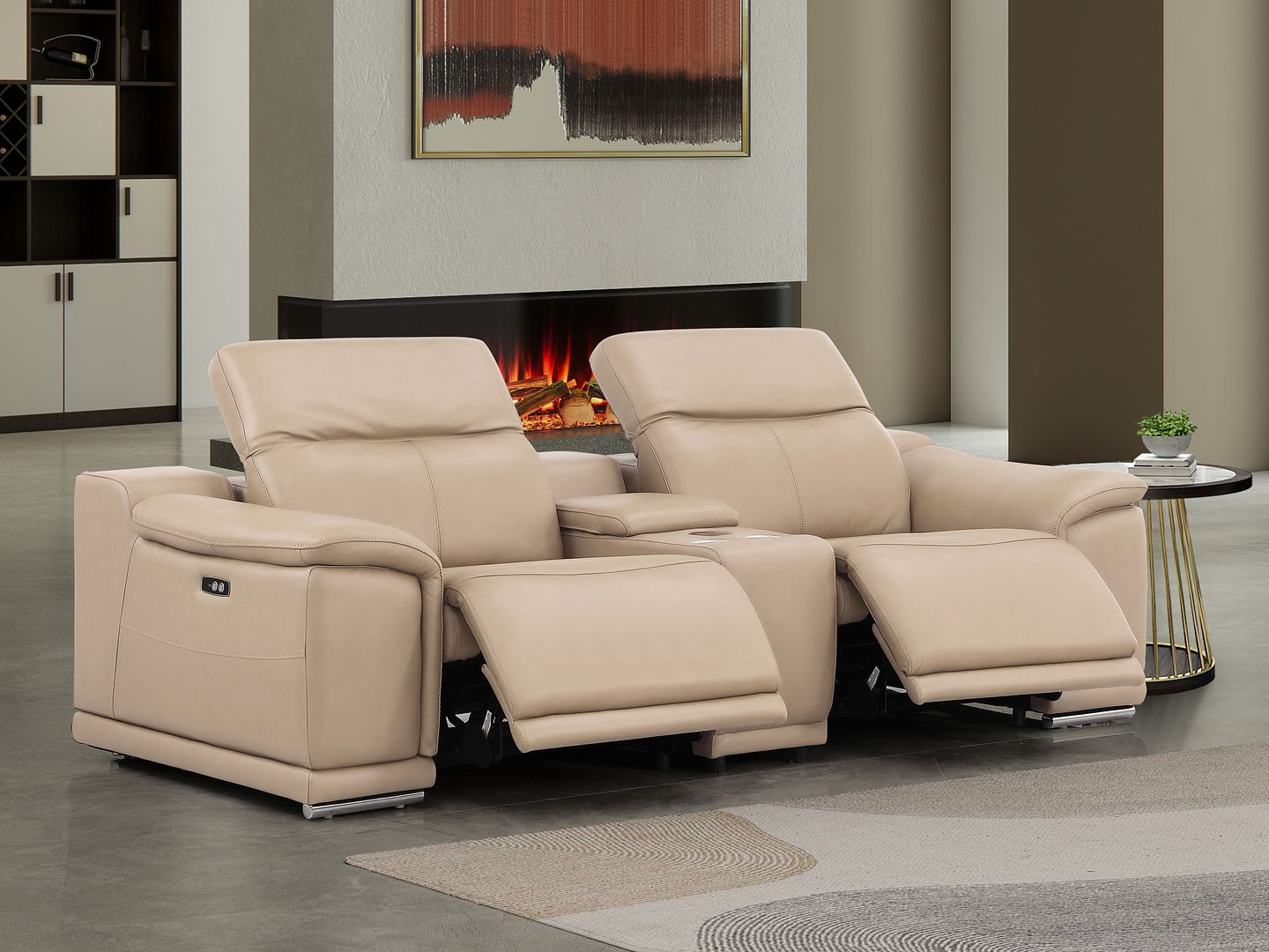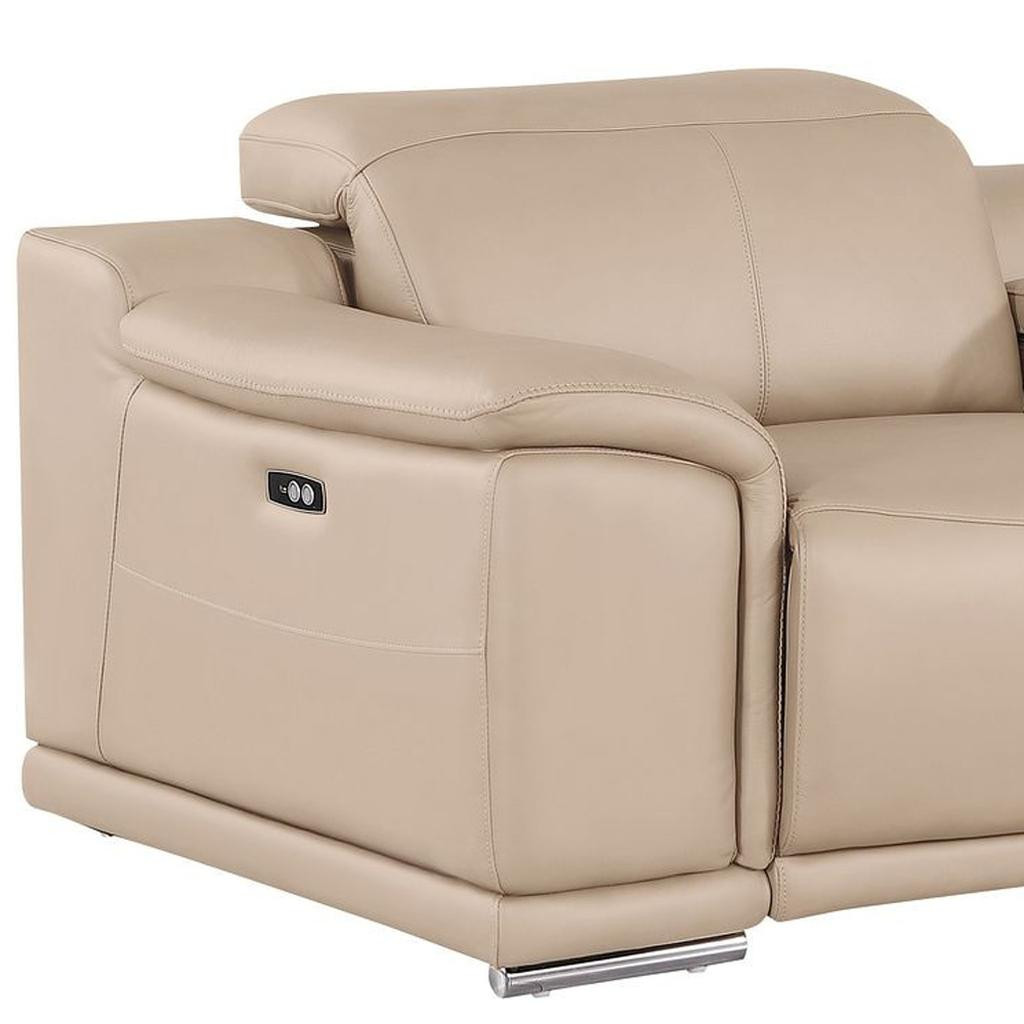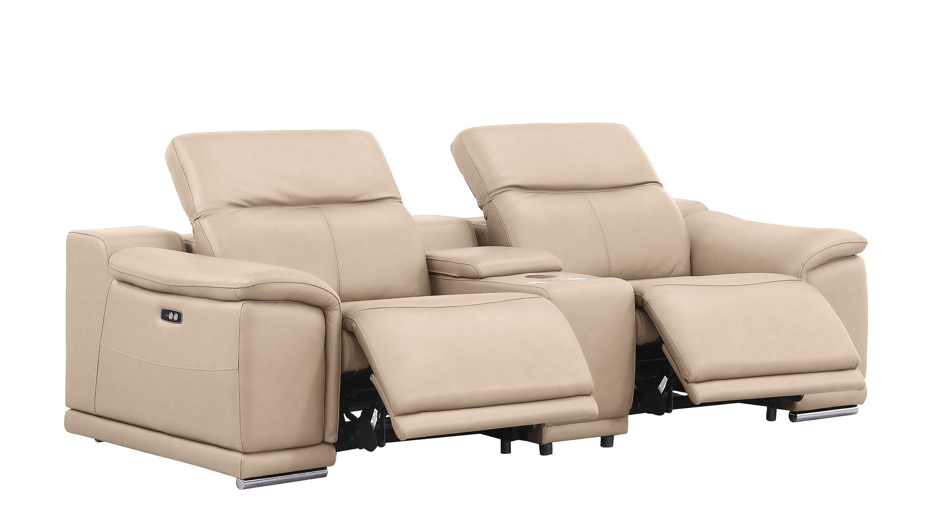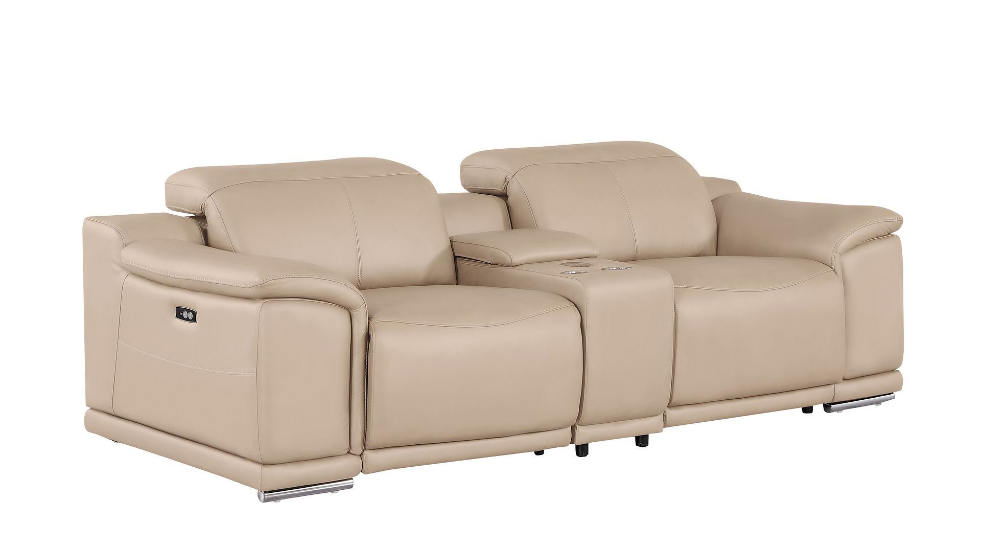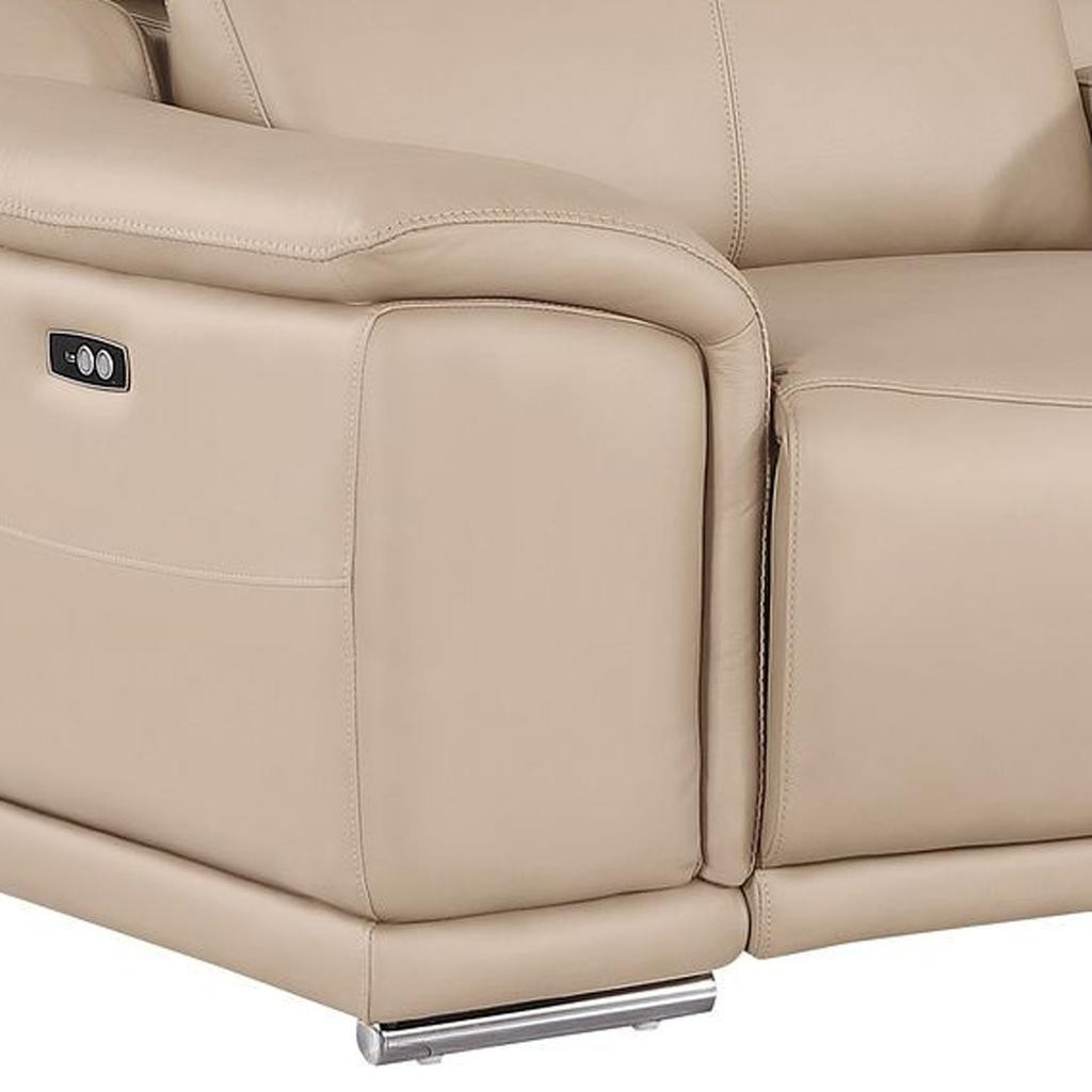 Made of top quality, supple leather, this 93-inch beige and silver leather power reclining loveseat will be the star of your space. The high grade premium leather used makes your lounging luxuriously comfortable and adds an elegant appeal to your space. Pillow top arms offer a comfy place to rest and give this piece some interest and shape. Silver steel legs effortlessly elevate the room and add a touch of contemporary design. A great showpiece for your room, this sofa is a must have. 39.00-inch h x 93.00-inch w x 41.00-inch d.