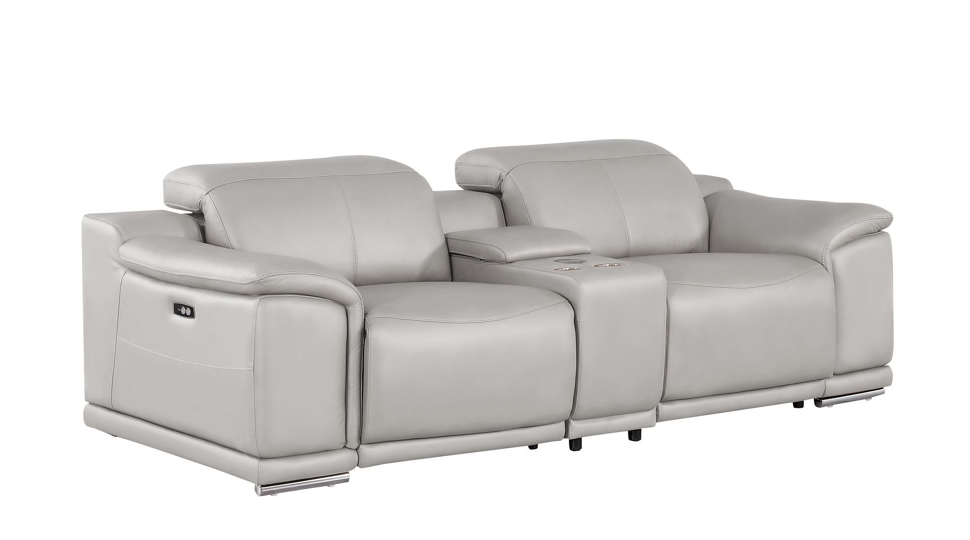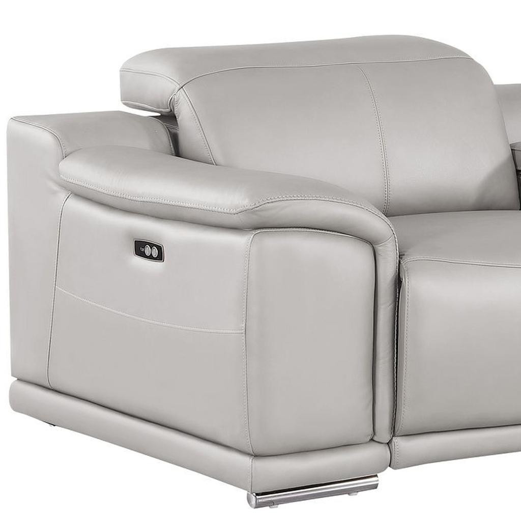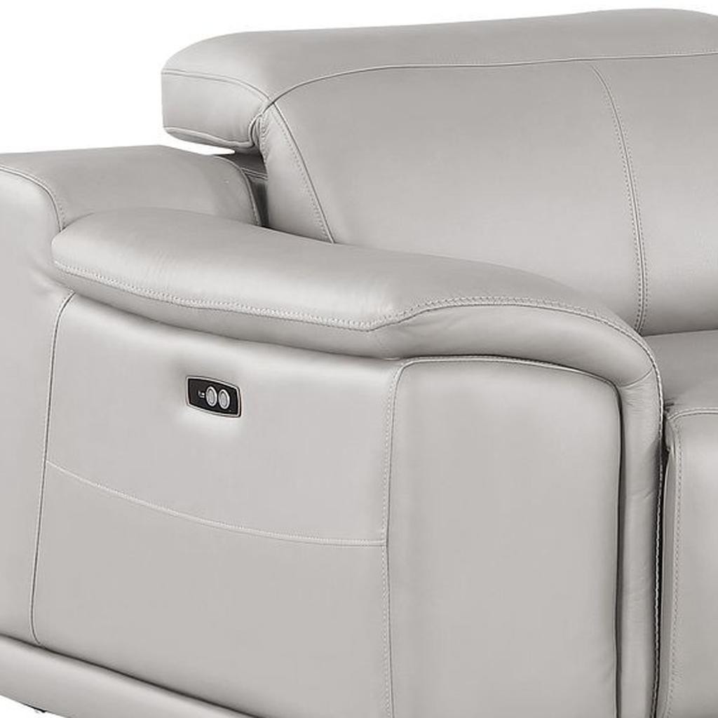 Superior construction from fabulously soft and high grade leather gives this 93-inch ash gray and silver leather power reclining loveseat a leg up on the competition. The high grade premium leather used makes your lounging luxuriously comfortable and adds an elegant appeal to your space. Pillow top arms offer a comfy place to rest and give this piece some interest and shape. Silver steel legs effortlessly elevate the room and add a touch of contemporary design. A great showpiece for your room, this sofa is a must have. 39.00-inch h x 93.00-inch w x 41.00-inch d.