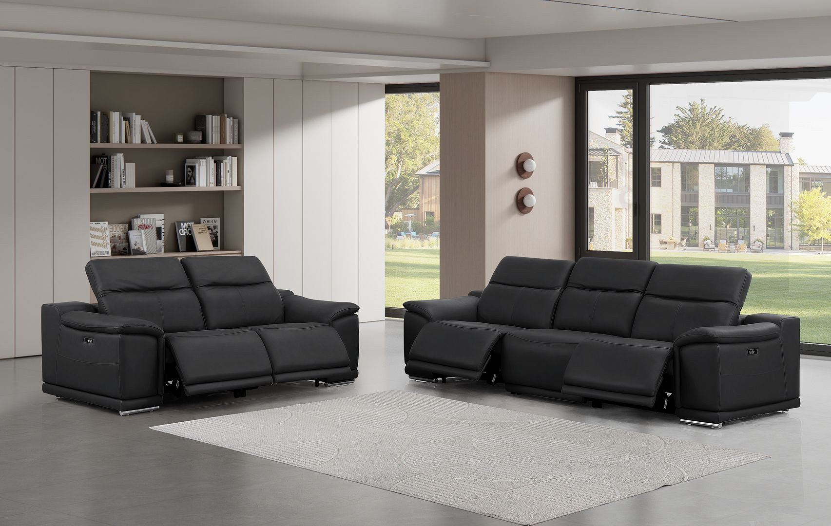 Prepare to amaze even the most discerning critics with our two piece black genuine leather four person seating set. The reclining sofa will transform your space into a cozy haven for leisurely activities, movie nights, or even quick power naps. Upholstered in supple and luxurious genuine leather, this set has a rich and warm appeal. The presence of eight-way hand-tied spring seat construction helps distribute weight evenly, reducing pressure points. The inclusion of a loveseat into your mix allows a fashionable seating option in a compact design. 39.00-inch h x 108.00-inch w x 41.00-inch d.