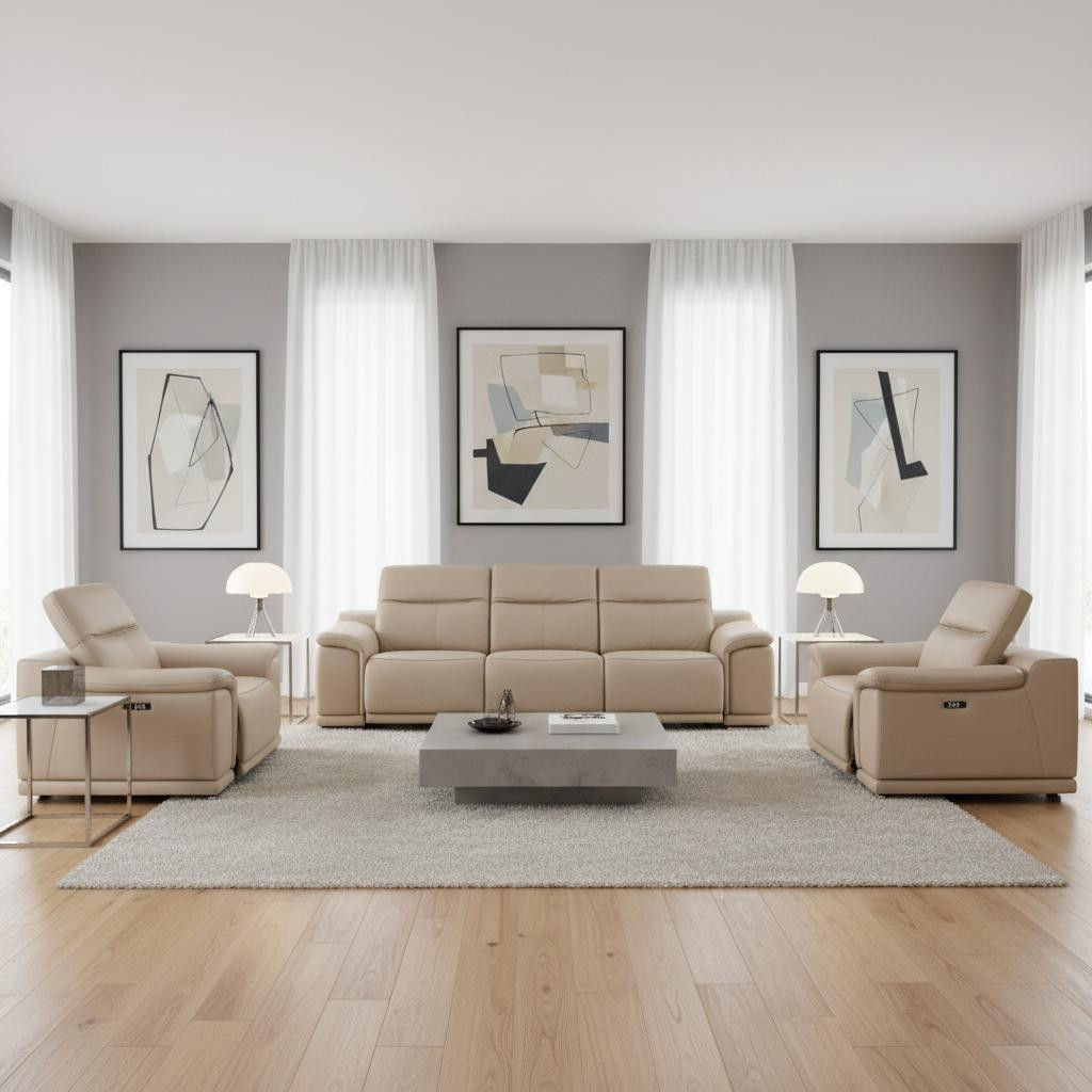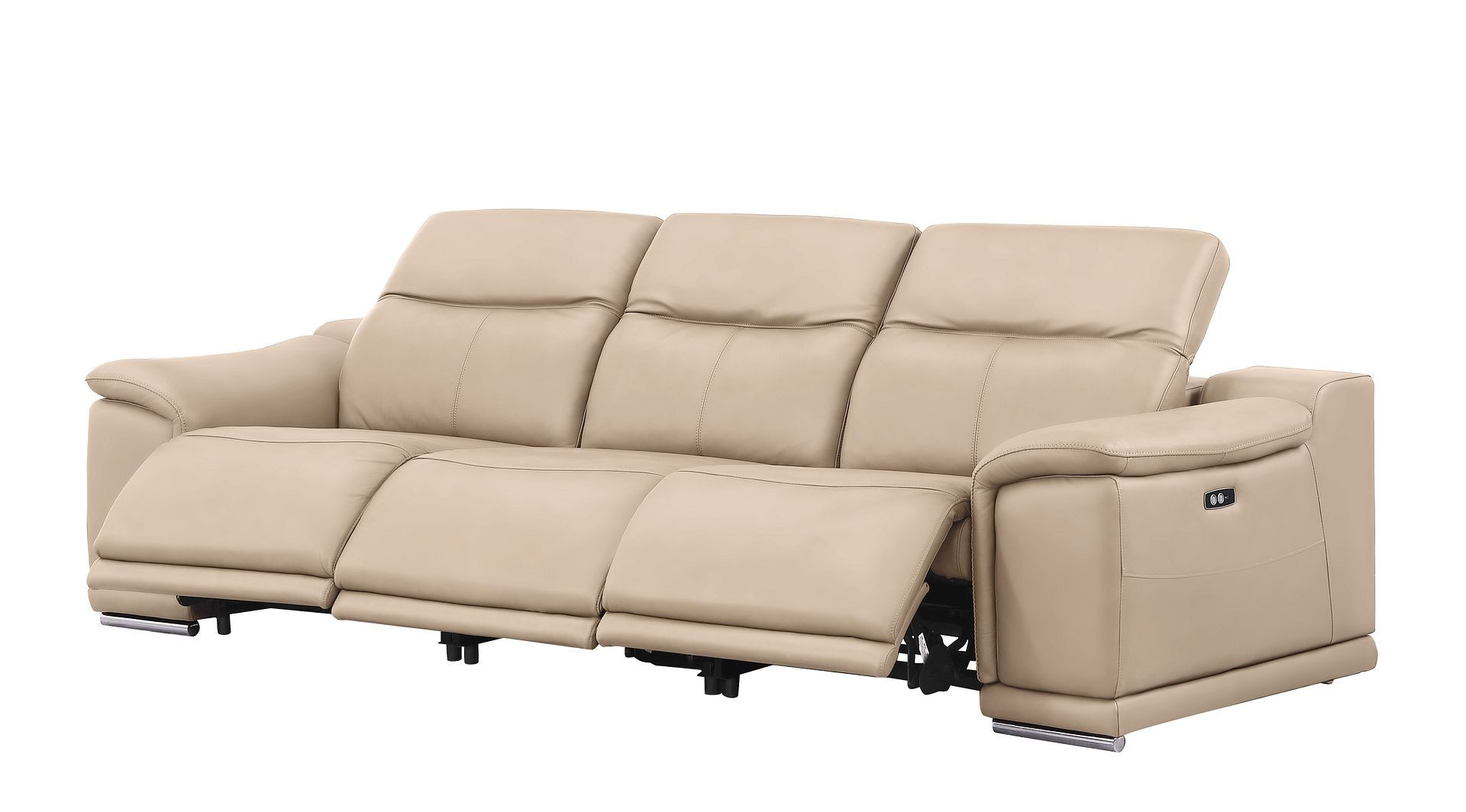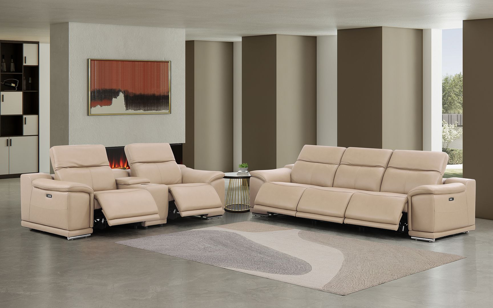 When it comes to indoor seating, this two piece beige genuine leather five person seating set has everything you need to get set and ready to relax. The reclining sofa will transform your space into a cozy haven for leisurely activities, movie nights, or even quick power naps. Upholstered in supple and luxurious genuine leather, this set has a rich and warm appeal. Eight-way hand-tied spring seat construction provides excellent comfort by offering a responsive and supportive seating experience. The inclusion of a loveseat into your mix allows a fashionable seating option in a compact design. 39.00-inch h x 108.00-inch w x 41.00-inch d.