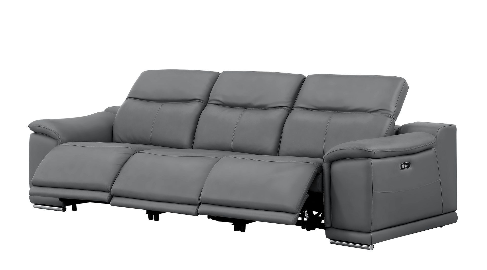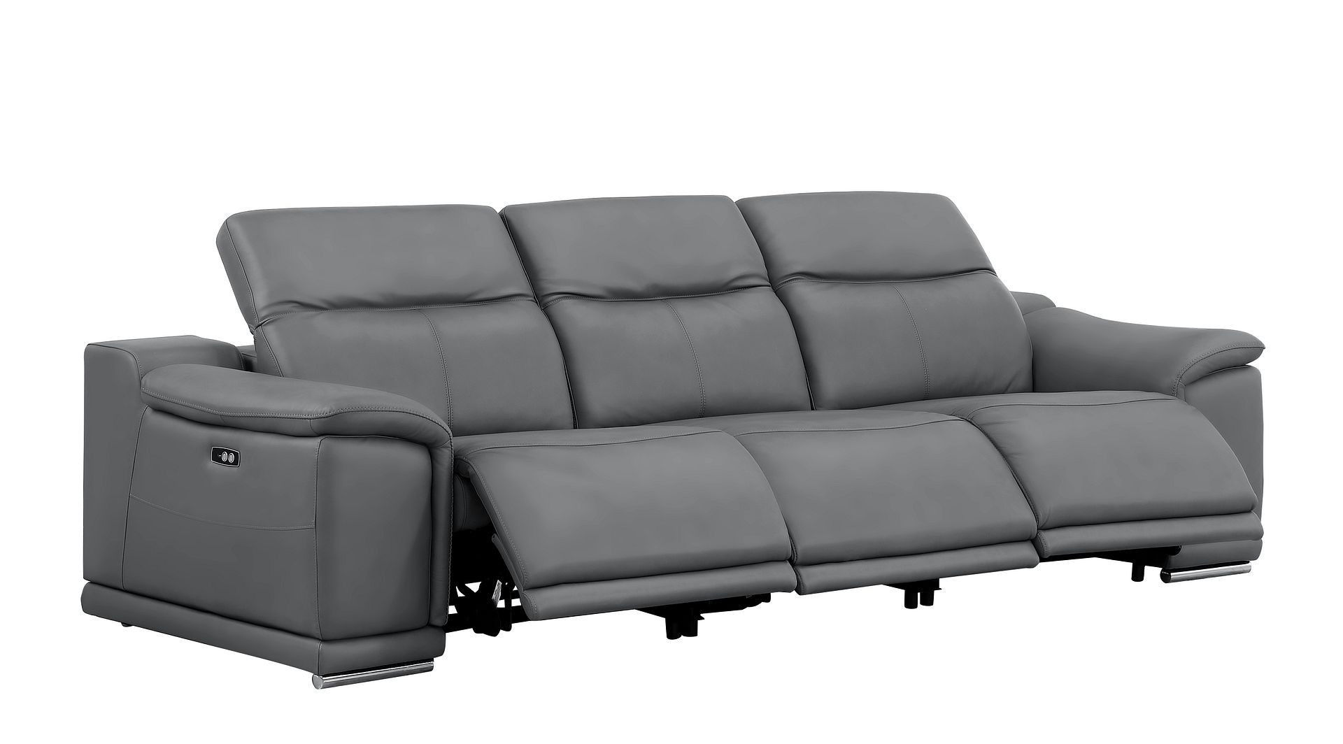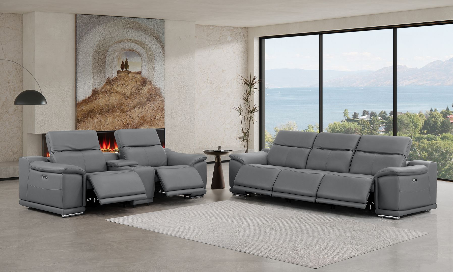 Prepare to amaze even the most discerning critics with our two piece battleship gray genuine leather five person seating set. The reclining sofa will transform your space into a cozy haven for leisurely activities, movie nights, or even quick power naps. Upholstered in supple and luxurious genuine leather, this set has a rich and warm appeal. Eight-way hand-tied spring seat construction provides excellent comfort by offering a responsive and supportive seating experience. The inclusion of a loveseat into your mix allows a fashionable seating option in a compact design. 39.00-inch h x 108.00-inch w x 41.00-inch d.