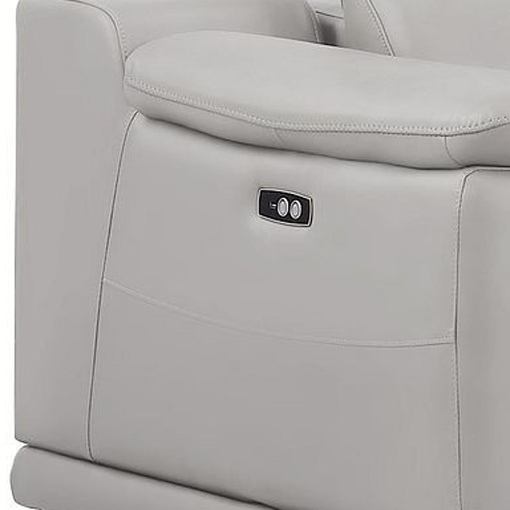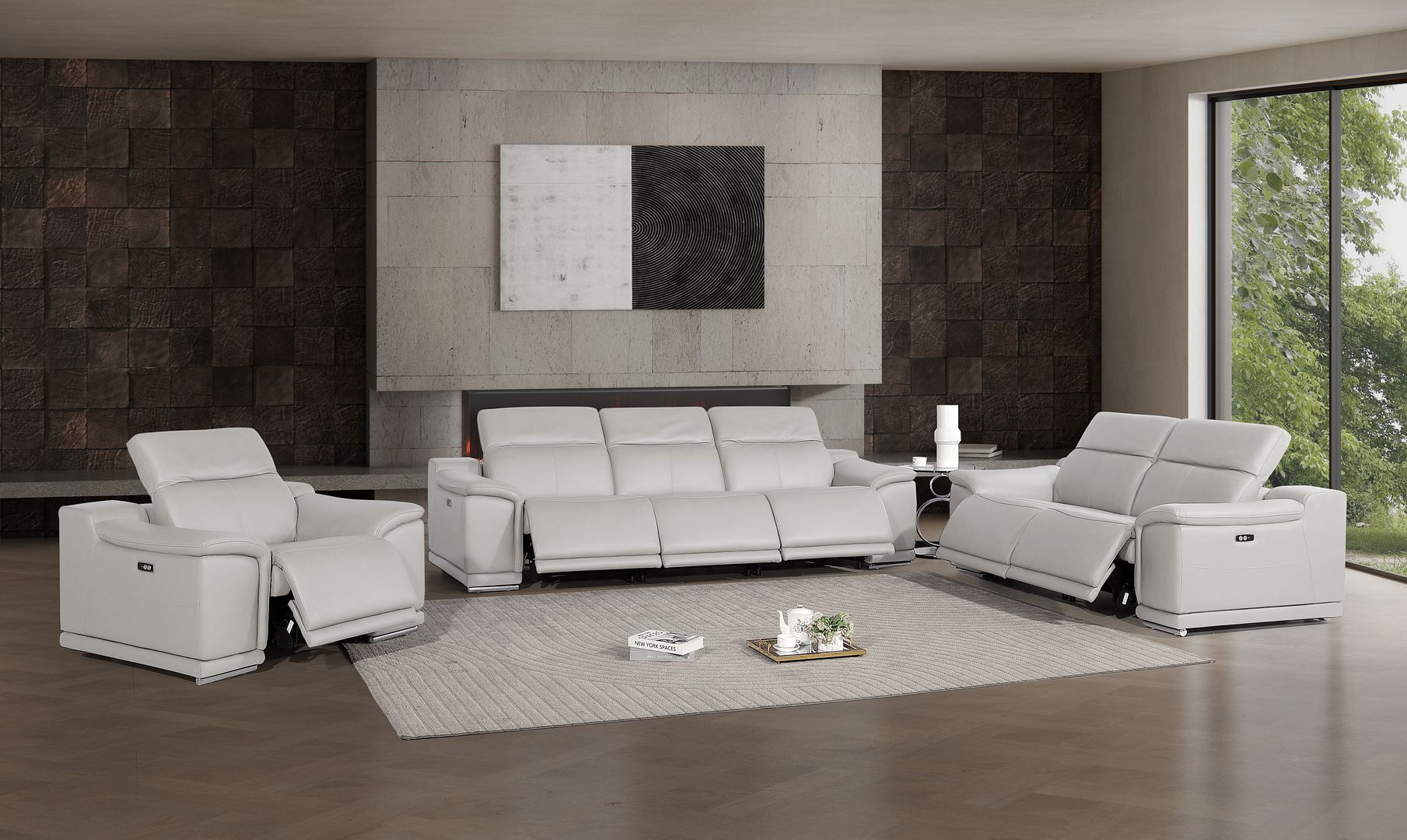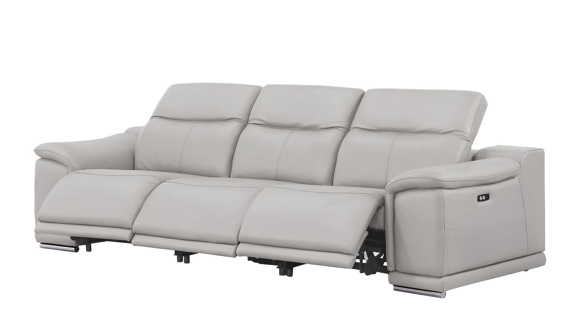Prepare to amaze even the most discerning critics with our three piece ash gray genuine leather six person seating set. Prepare to enter the realm of ultimate relaxation with this reclining sofa that offers unparalleled comfort and luxurious lounging. Upholstered in supple and luxurious genuine leather, this set has a rich and warm appeal. Eight-way hand-tied spring seat construction provides excellent comfort by offering a responsive and supportive seating experience. The inclusion of a loveseat into your mix allows a fashionable seating option in a compact design. 39.00-inch h x 108.00-inch w x 41.00-inch d.