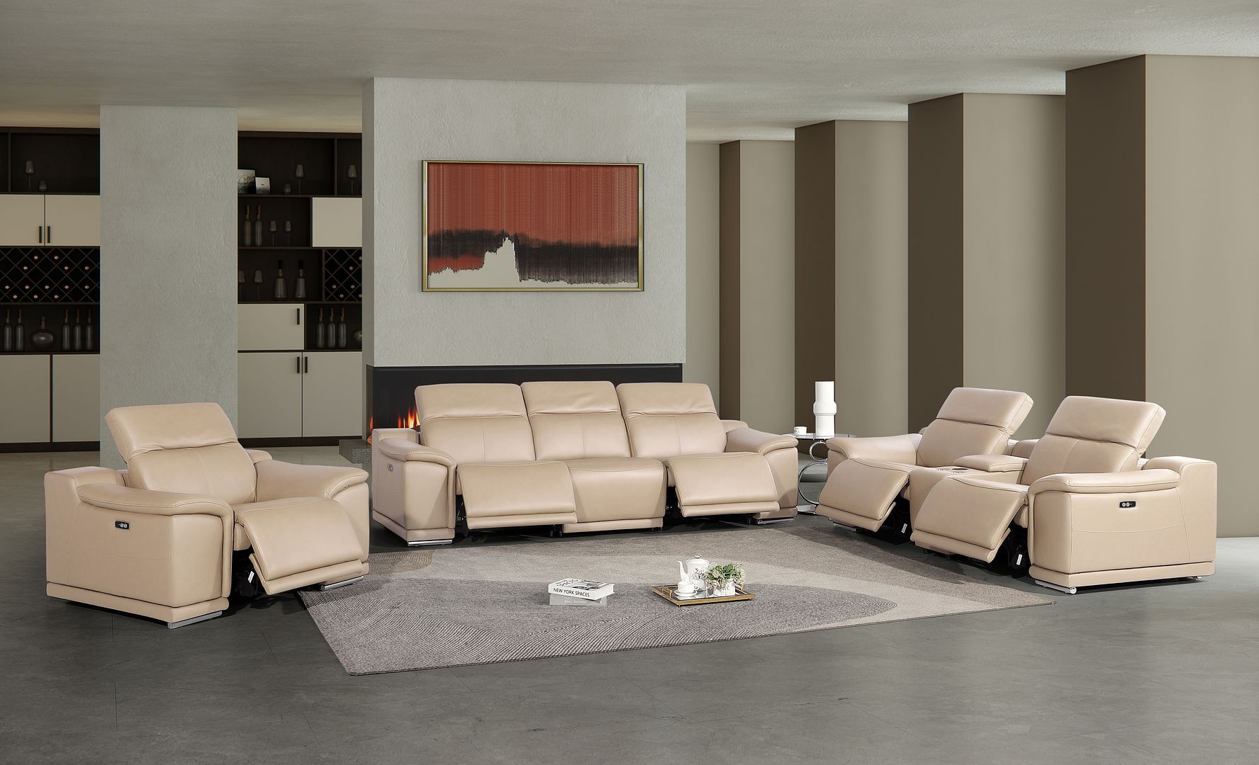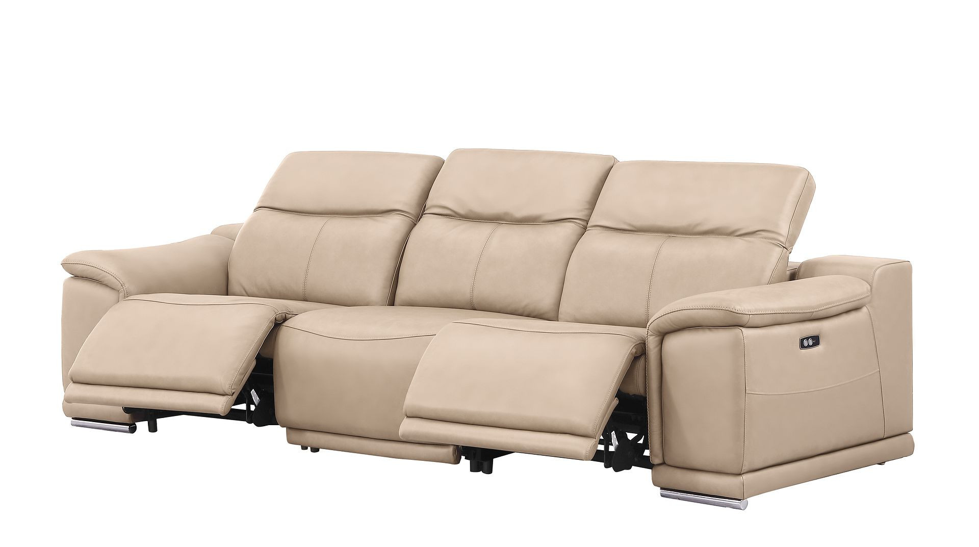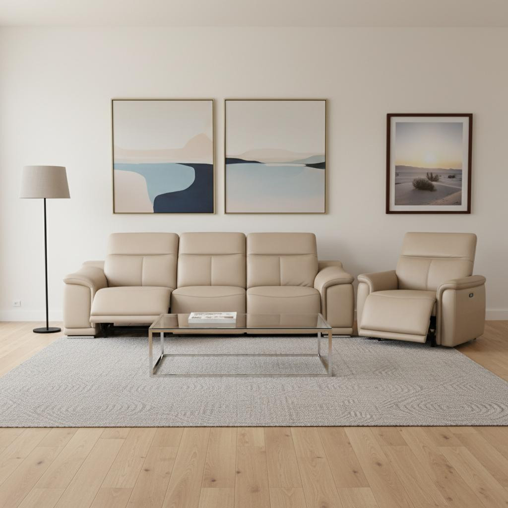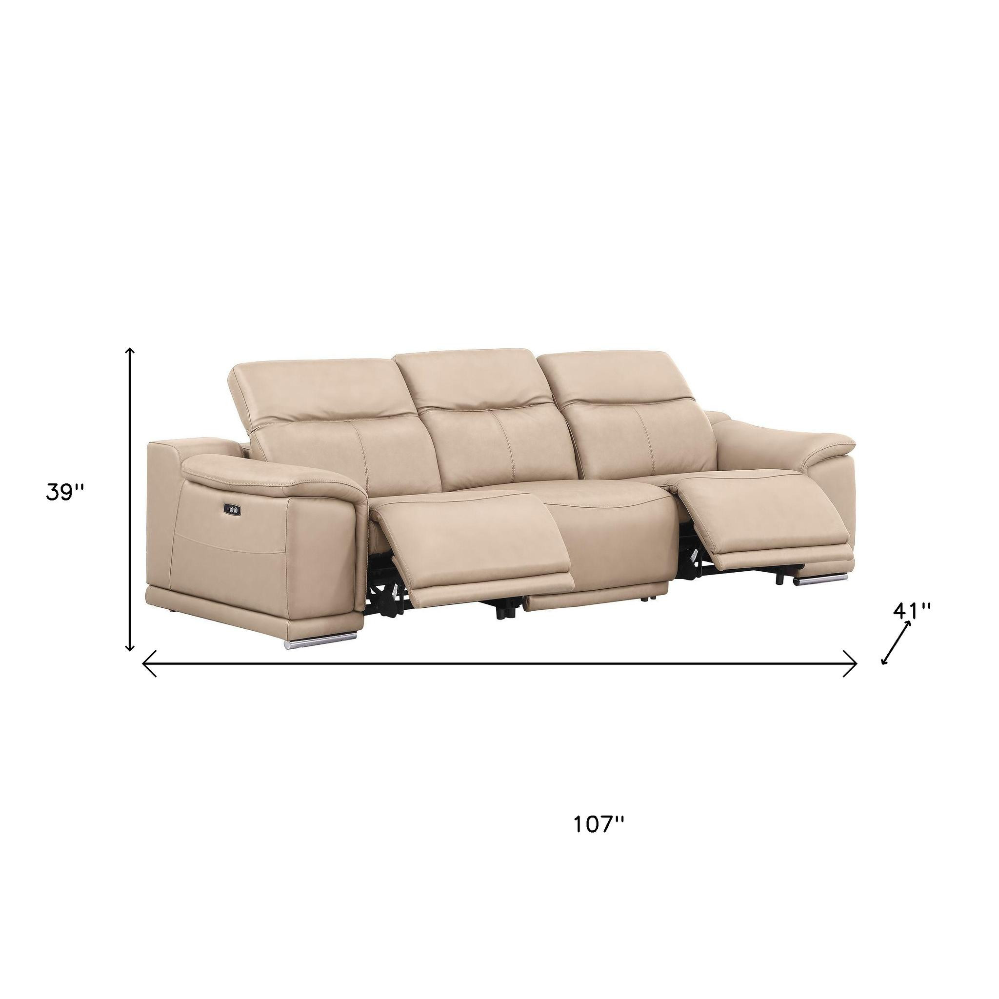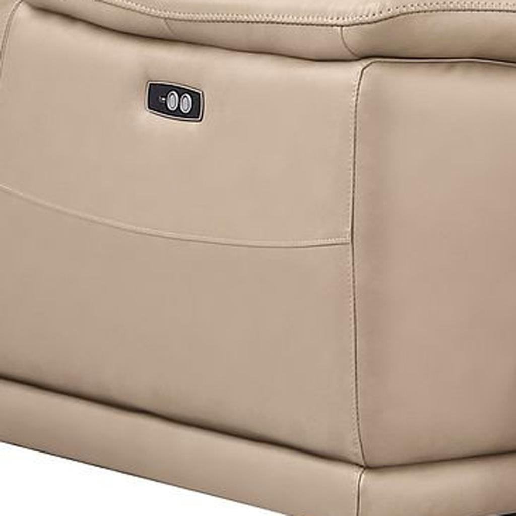 Prepare to amaze even the most discerning critics with our three piece beige genuine leather five person seating set. The reclining sofa will transform your space into a cozy haven for leisurely activities, movie nights, or even quick power naps. Upholstered in supple and luxurious genuine leather, this set has a rich and warm appeal. Eight-way hand-tied spring seat construction provides excellent comfort by offering a responsive and supportive seating experience. The inclusion of a loveseat into your mix allows a fashionable seating option in a compact design. 39.00-inch h x 107.00-inch w x 41.00-inch d.