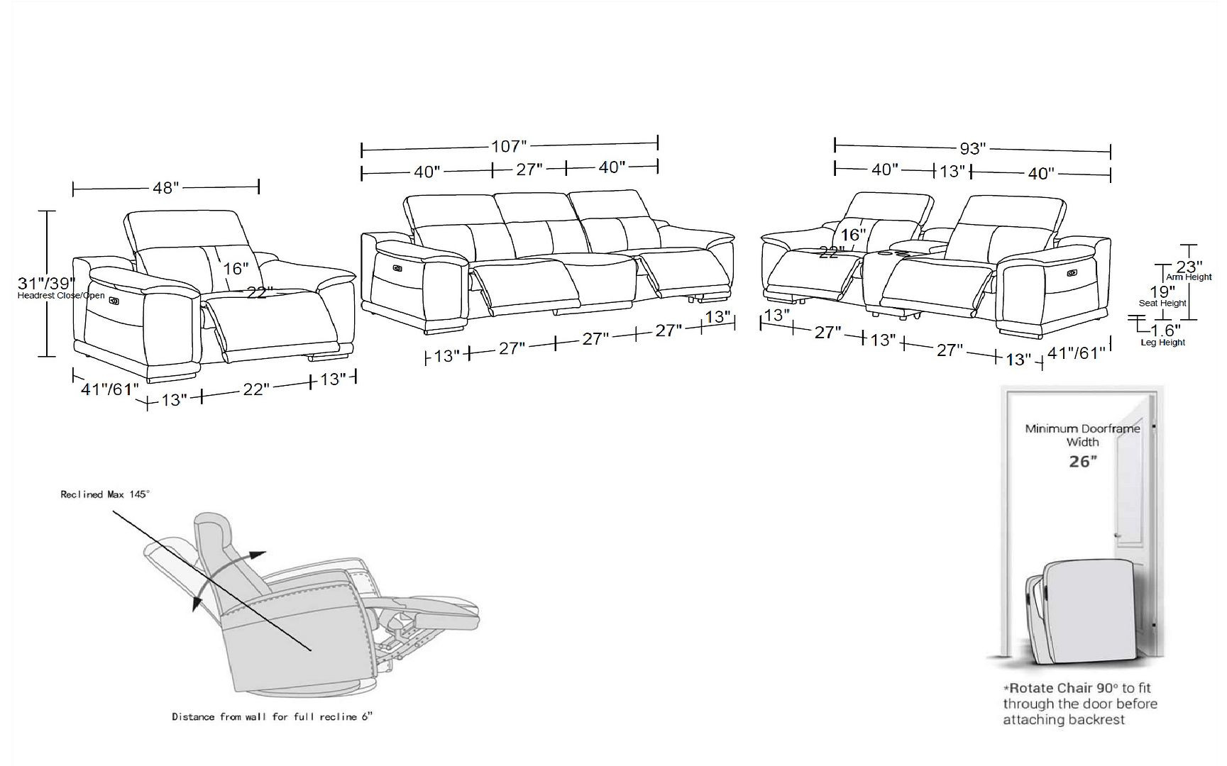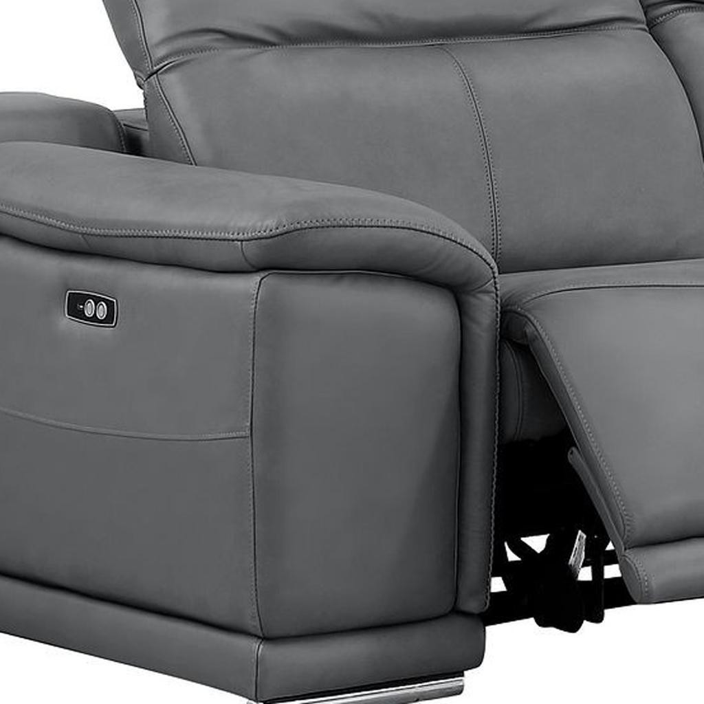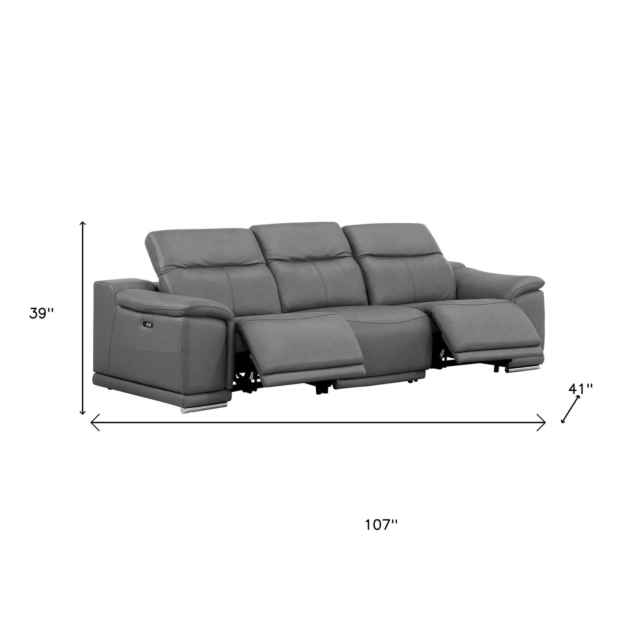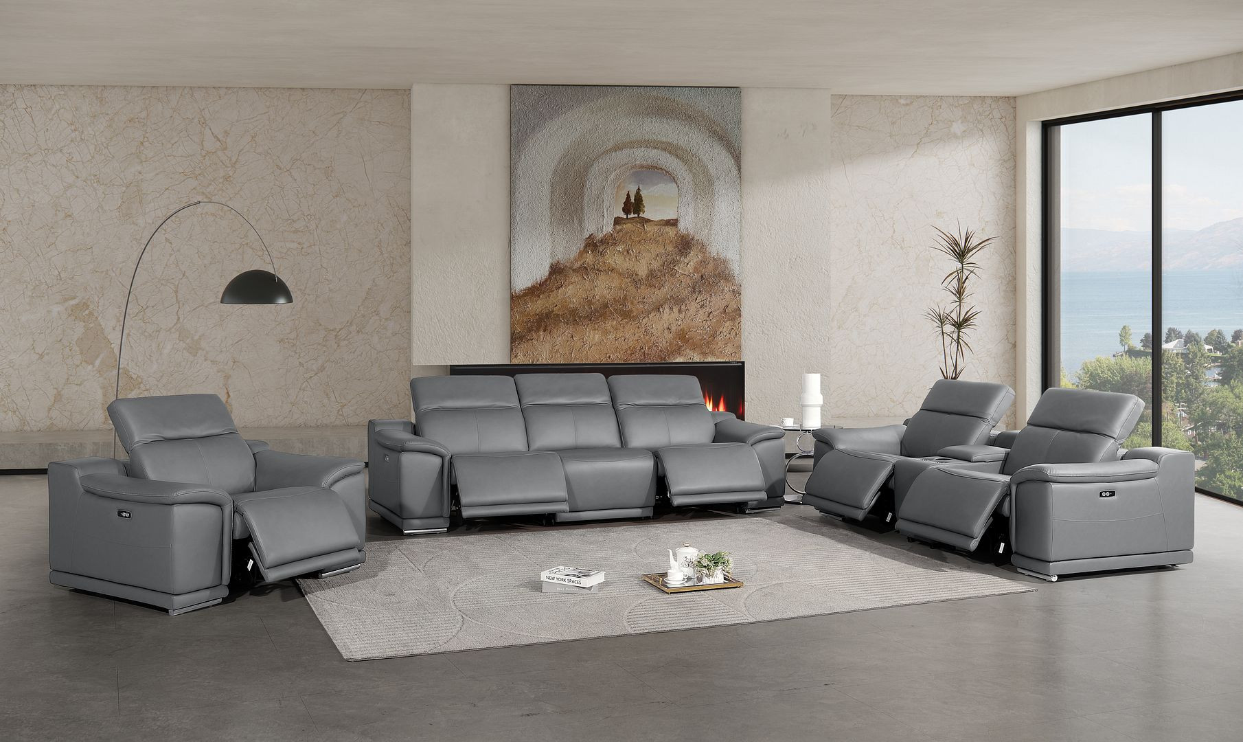 Prepare to amaze even the most discerning critics with our three piece battleship gray genuine leather five person seating set. The reclining sofa will transform your space into a cozy haven for leisurely activities, movie nights, or even quick power naps. Upholstered in supple and luxurious genuine leather, this set has a rich and warm appeal. The presence of eight-way hand-tied spring seat construction helps distribute weight evenly, reducing pressure points. The inclusion of a loveseat into your mix allows a fashionable seating option in a compact design. 39.00-inch h x 107.00-inch w x 41.00-inch d.