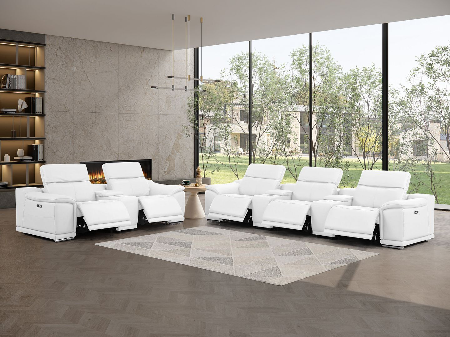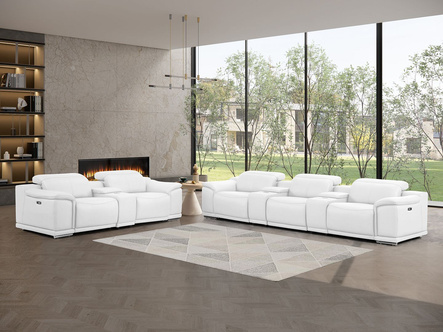 Prepare to amaze even the most discerning critics with our two piece white genuine leather five person seating set. Prepare to enter the realm of ultimate relaxation with this reclining sofa that offers unparalleled comfort and luxurious lounging. Upholstered in supple and luxurious genuine leather, this set has a rich and warm appeal. Eight-way hand-tied spring seat construction provides excellent comfort by offering a responsive and supportive seating experience. The inclusion of a loveseat into your mix allows a fashionable seating option in a compact design. 39.00-inch h x 134.00-inch w x 41.00-inch d.