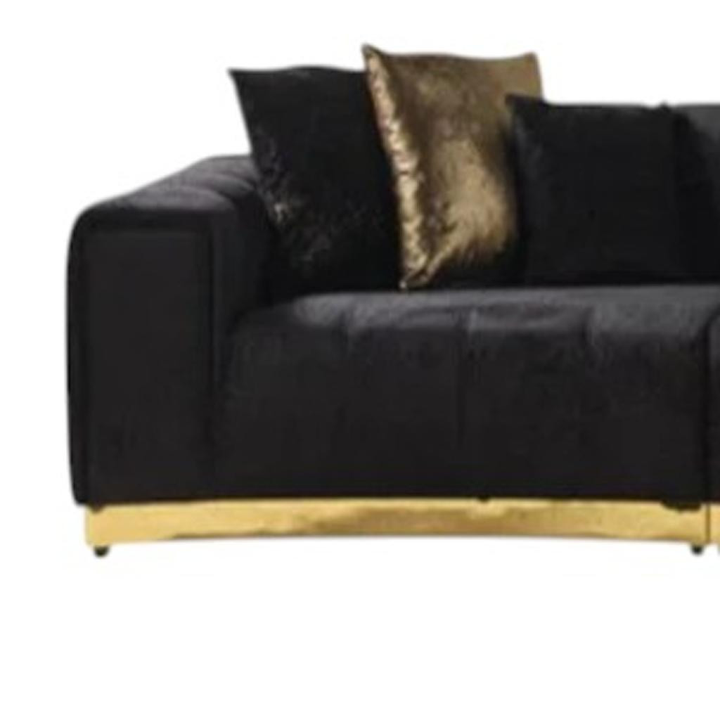 Transform your home's interior with this luxurious black velvet curved three piece sectional with toss pillows. Solid colors give you lots of decorative options and are easy to work into your decor scheme. Recessed arms offer a comfy place to rest. Curved sectionals are a great way to maximize seating space without someone getting stuck in the uncomfortable corner seat. A great showpiece for your room, this sectional is a must have. 28.00-inch h x 165.00-inch w x 49.00-inch d.