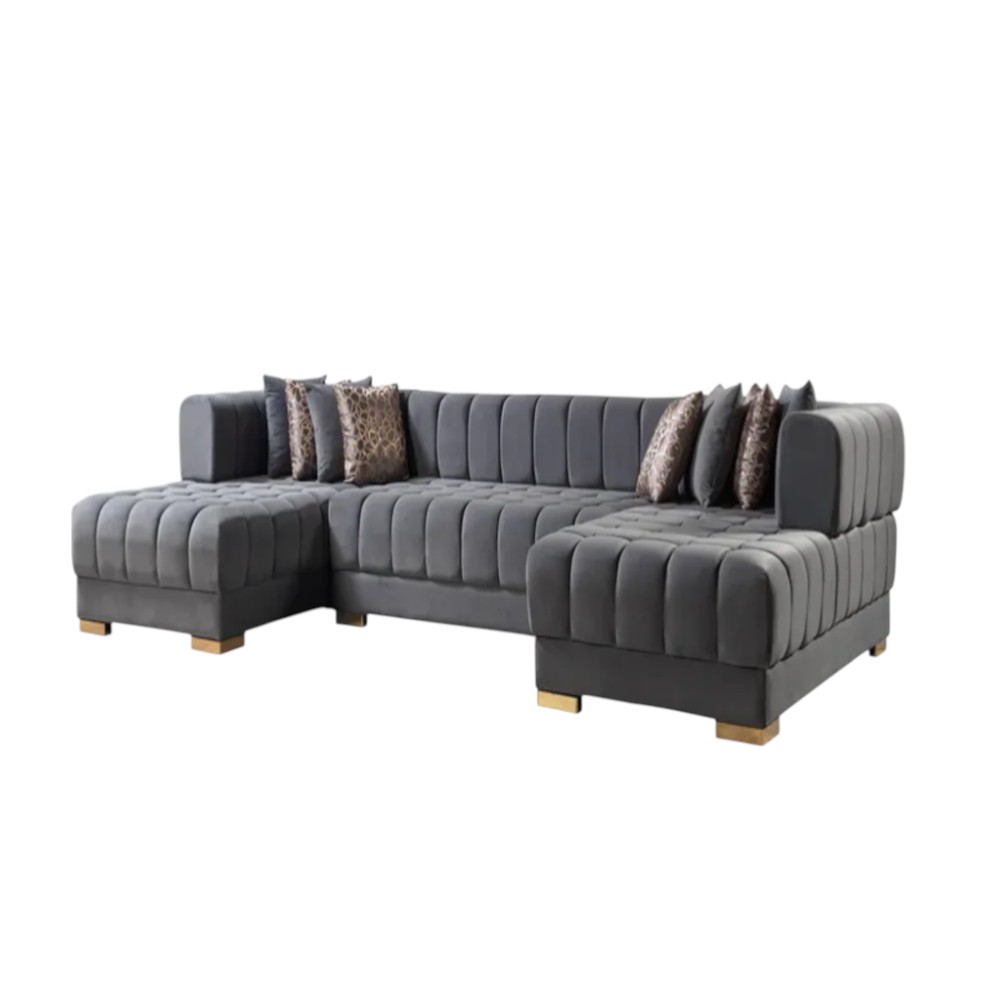 The gray velvet u shaped three piece sofa and chaise sectional with toss pillows is spacious design meticulously crafted with extraordinary cushion comfort and ultimate durability so everyone in your home can have the best seat in the house. Solid colors give you lots of decorative options and are easy to work into your decor scheme. With a u-shape, designed for lounging on both sides, this high quality furniture piece creates a modern, unique, and stylish look for your space. The addition of accent pillows, gold accents, and tufted stitching pattern adds visual interest and fine designer detailing, making this a great option for both everyday lounging and for entertaining. 32.00-inch h x 138.00-inch w x 69.00-inch d.