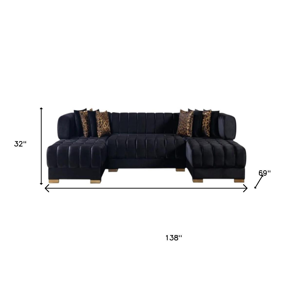 The black velvet u shaped three piece sofa and chaise sectional with toss pillows is spacious design meticulously crafted with extraordinary cushion comfort and ultimate durability so everyone in your home can have the best seat in the house. Solid colors give you lots of decorative options and are easy to work into your decor scheme. The tufted stitching pattern adds visual interest and fine designer detailing. With a u-shape, designed for lounging on both sides, this high quality furniture piece creates a modern, unique, and stylish look for your space. The addition of accent pillows, gold accents, and tufted stitching pattern adds visual interest and fine designer detailing, making this a great option for both everyday lounging and for entertaining. 32.00-inch h x 138.00-inch w x 69.00-inch d.