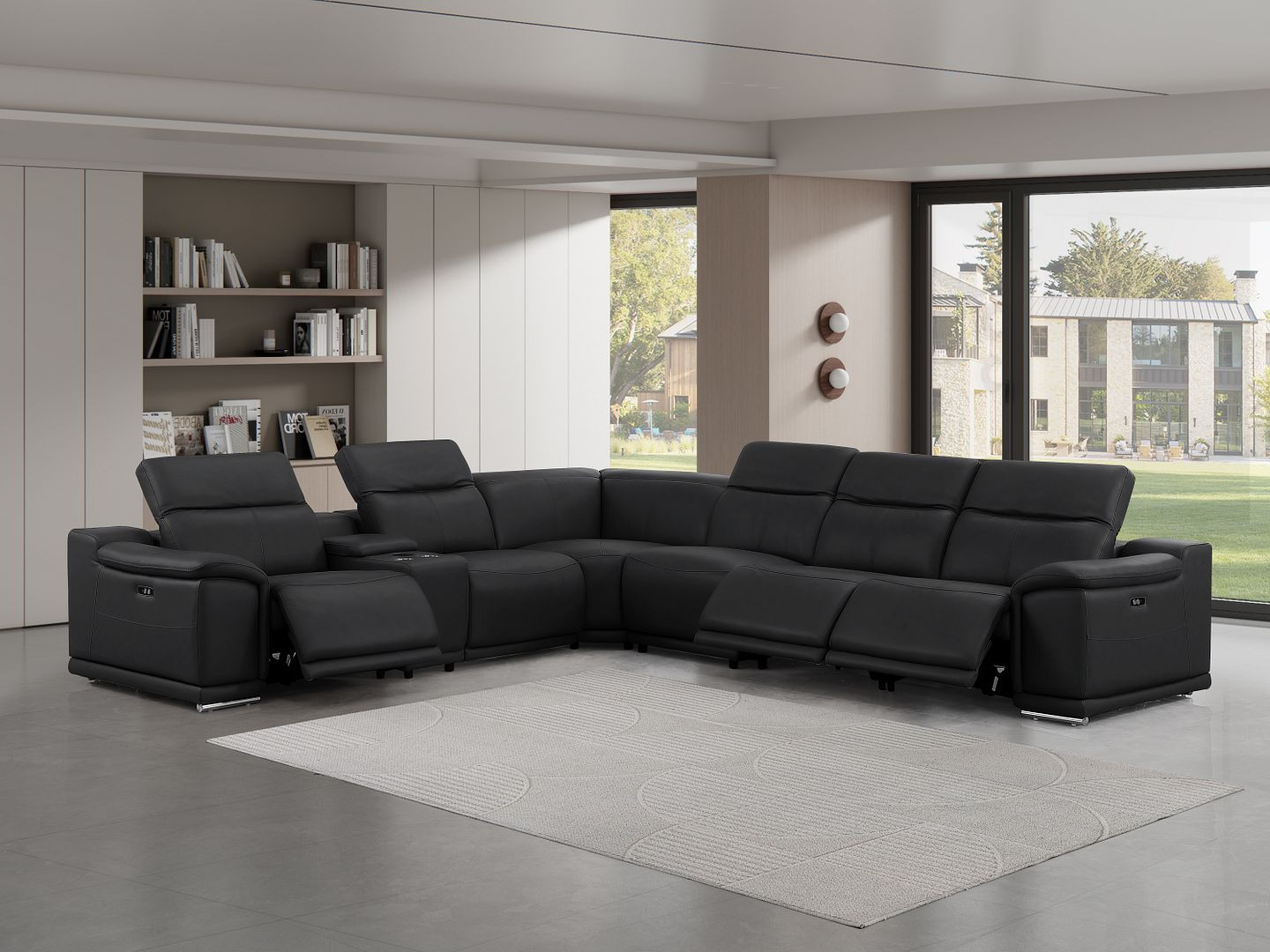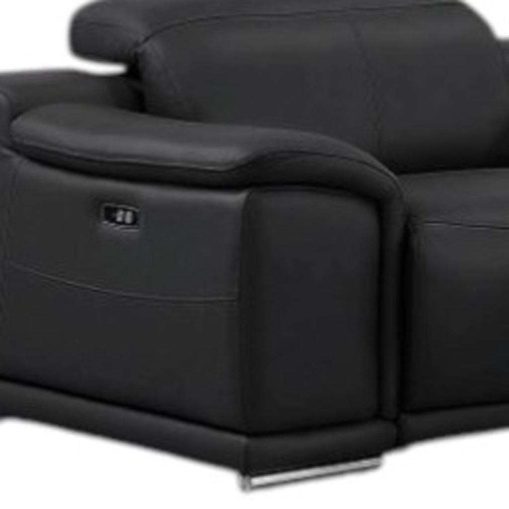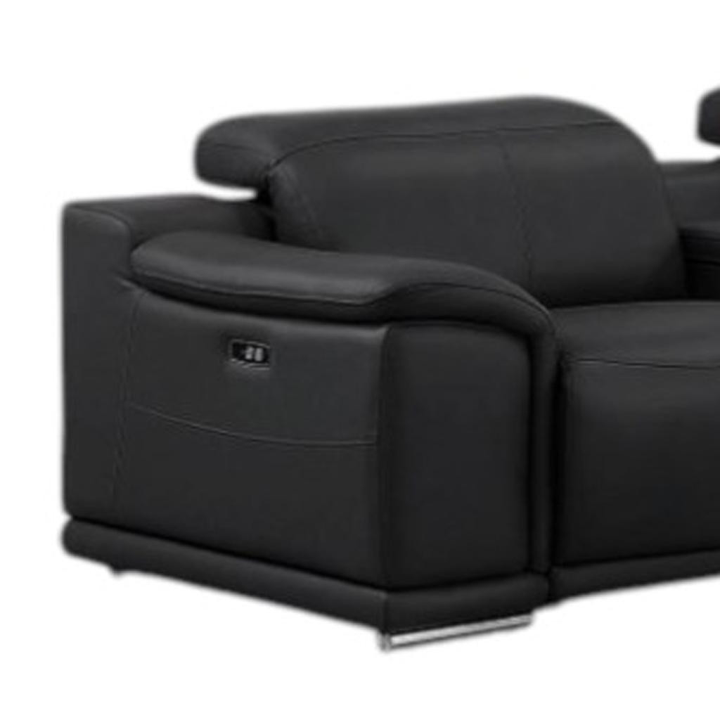 The black leather modular l shaped seven piece corner sectional with console is spacious design meticulously crafted with extraordinary cushion comfort and ultimate durability so everyone in your home can have the best seat in the house. The high-end premium leather used makes your lounging luxuriously comfortable and adds an elegant appeal to your space. Pillow top arms offer a comfy place to rest. Power - push button recline allows you to truly rest, lounge and even sleep comfortably. Silver metal legs effortlessly elevate the room and add a touch of contemporary design. Great for everyday lounging and for entertaining, sectionals are an ideal way to seat multiple people. 39.00-inch h x 138.00-inch w x 41.00-inch d.