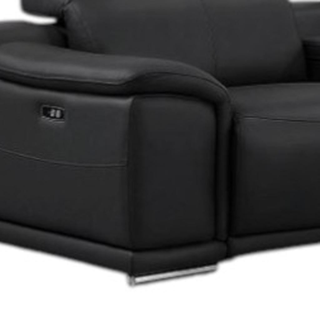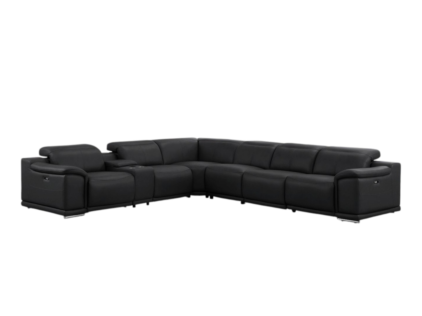 Made of the highest quality, supple leather, this black leather modular l shaped seven piece corner sectional with console will be the star of your space. The high-grade premium leather used makes your lounging luxuriously comfortable and adds an elegant appeal to your space. Pillow top arms offer a comfy place to rest. For the ultimate in relaxation, this sectional includes power - push button recline that turns it into a comfy lounge for sleeping or resting. Silver metal legs effortlessly elevate the room and add a touch of contemporary design. Great for everyday lounging and for entertaining, sectionals are an ideal way to seat multiple people. 39.00-inch h x 138.00-inch w x 41.00-inch d.