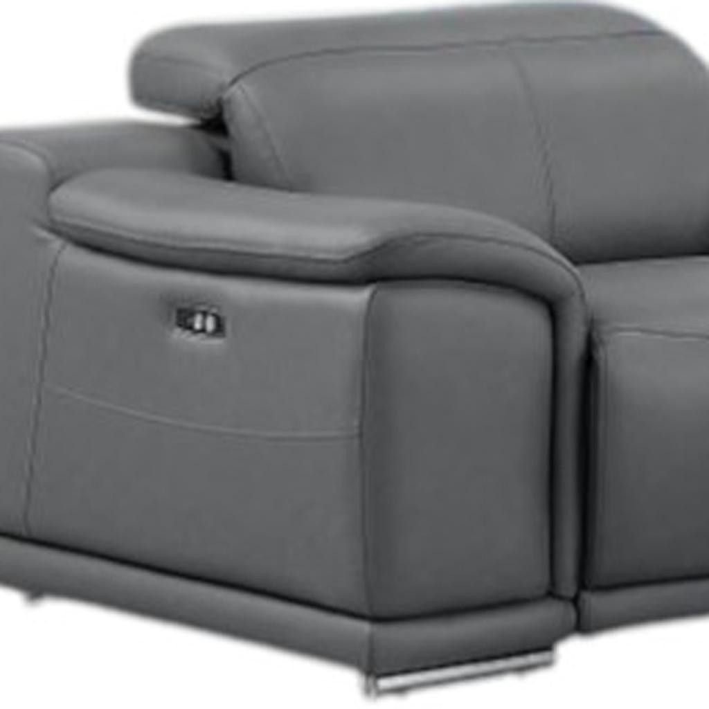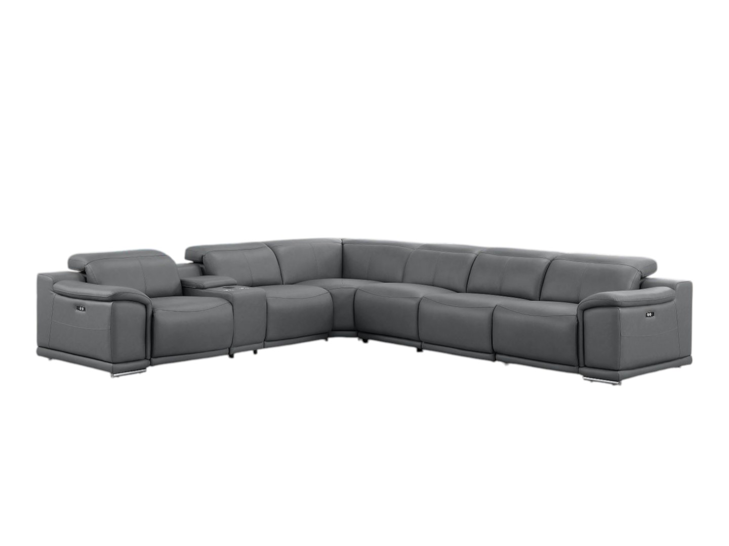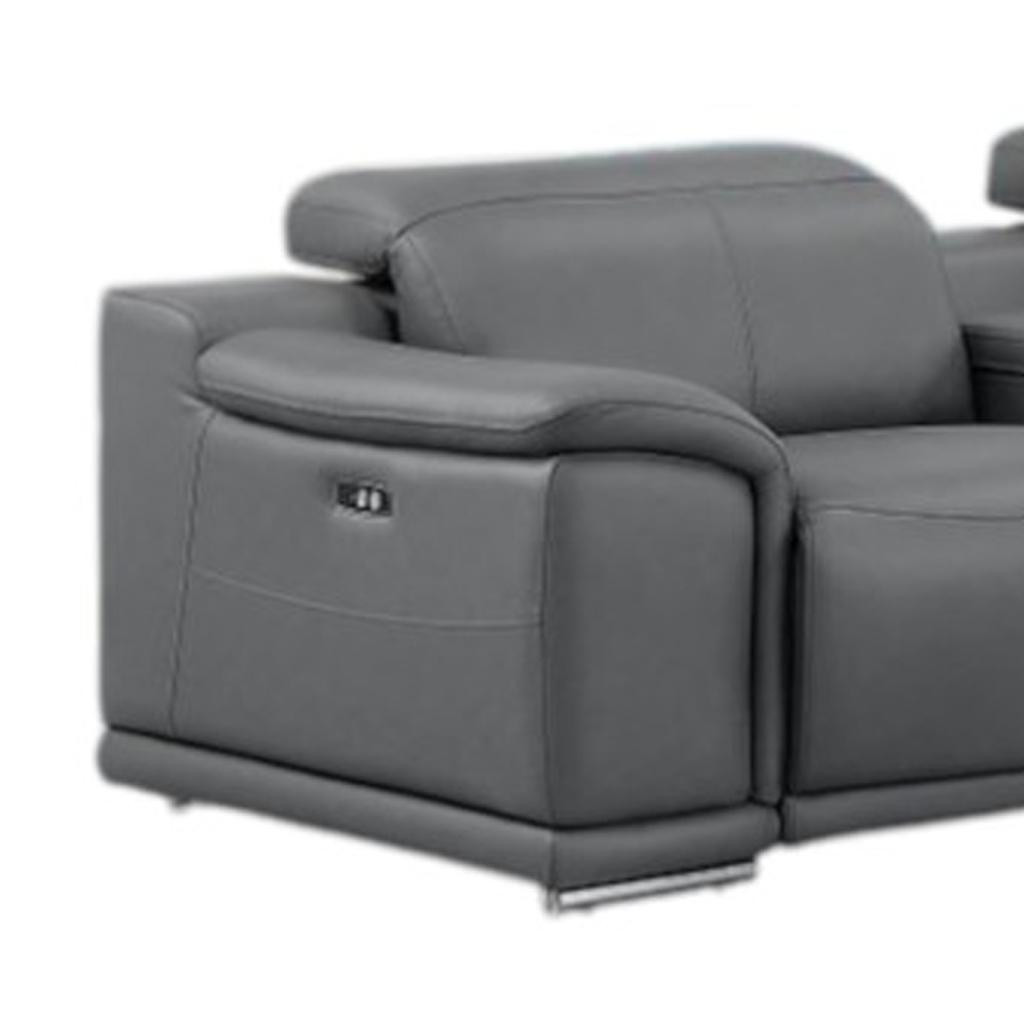 Superior construction from fabulously soft and high-grade leather gives this battleship gray leather modular l shaped seven piece corner sectional with console a leg up on the competition. The premium leather used makes your lounging luxuriously comfortable and adds an elegant appeal to your space. Pillow top arms offer a comfy place to rest. Power - push button recline allows you to truly rest, lounge and even sleep comfortably. Silver metal legs effortlessly elevate the room and add a touch of contemporary design. A great showpiece for your room, this sectional is a must have. 39.00-inch h x 138.00-inch w x 41.00-inch d.