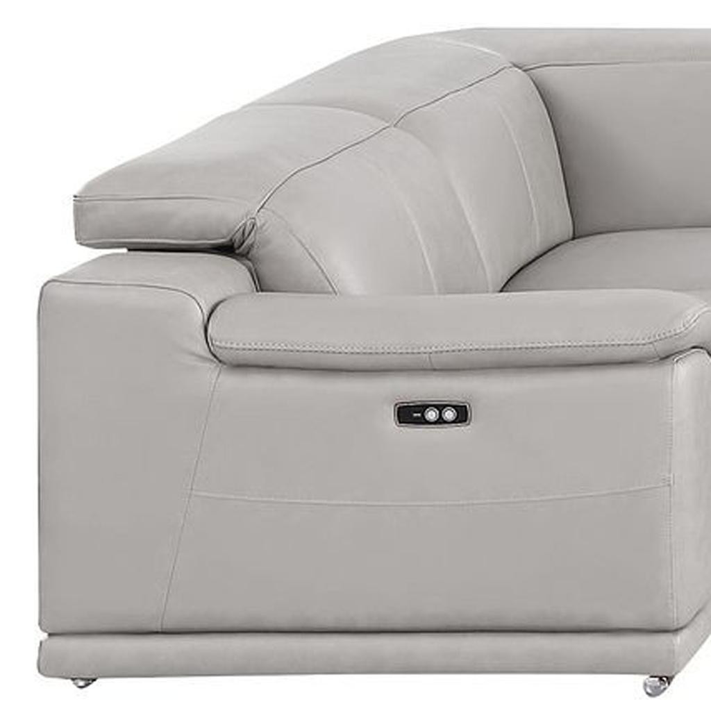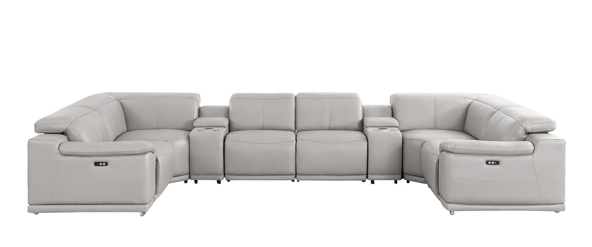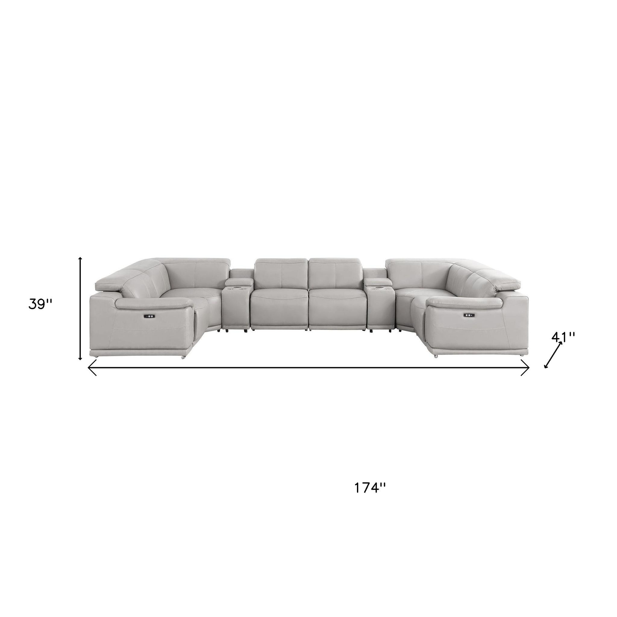 The ash gray leather modular u shaped eight piece corner sectional with console is spacious design meticulously crafted with extraordinary cushion comfort and ultimate durability so everyone in your home can have the best seat in the house. The high-end premium leather used makes your lounging luxuriously comfortable and adds an elegant appeal to your space. Pillow top arms offer a comfy place to rest. For the ultimate in relaxation, this sectional includes power - push button recline that turns it into a comfy lounge for sleeping or resting. Silver metal legs effortlessly elevate the room and add a touch of contemporary design. A great showpiece for your room, this sectional is a must have. 39.00-inch h x 174.00-inch w x 41.00-inch d.