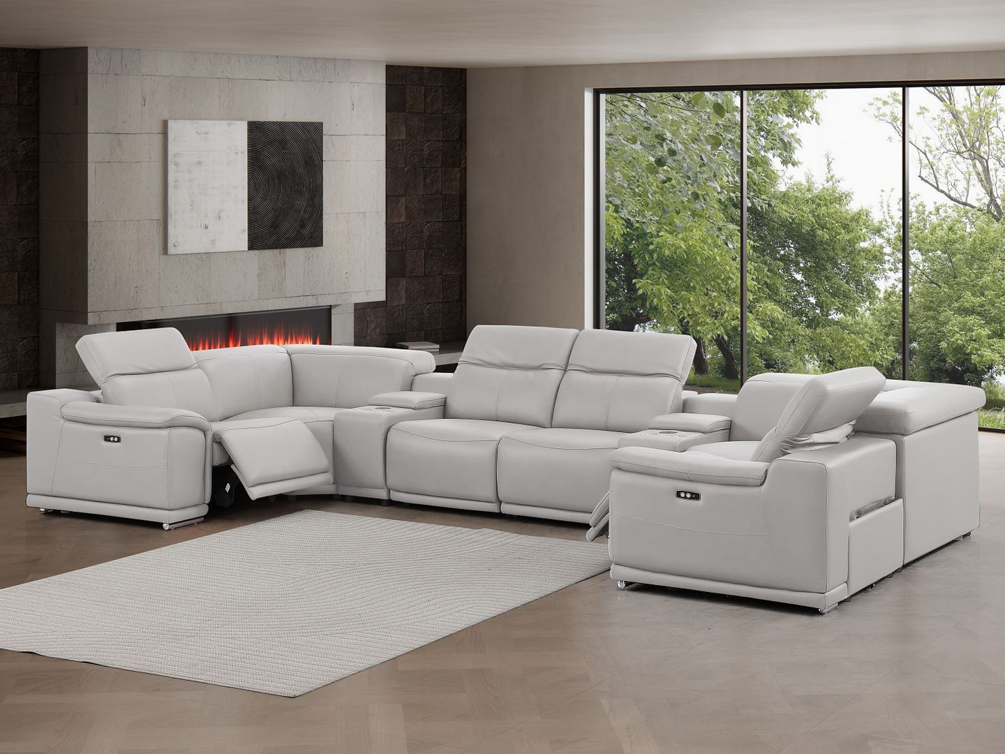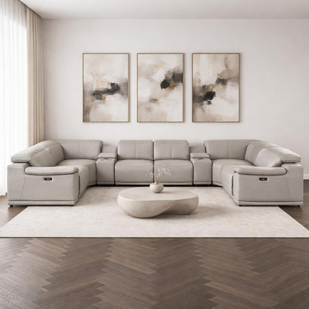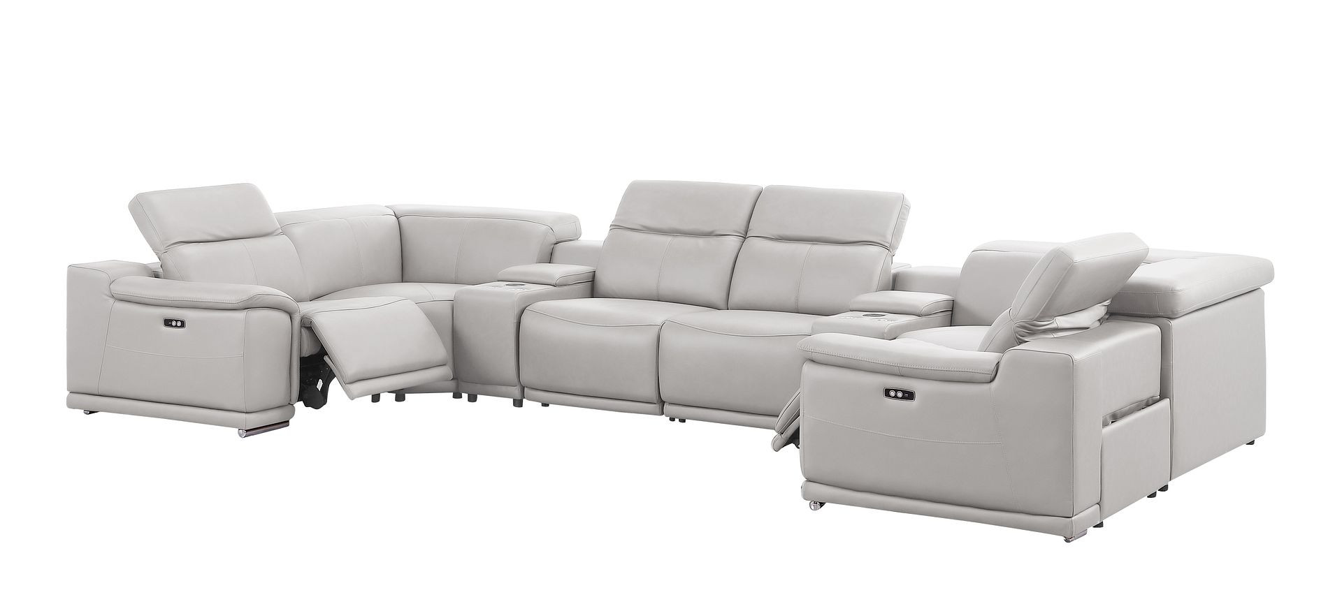 The ash gray leather modular u shaped eight piece corner sectional with console is spacious design meticulously crafted with extraordinary cushion comfort and ultimate durability so everyone in your home can have the best seat in the house. The high-end premium leather used makes your lounging luxuriously comfortable and adds an elegant appeal to your space. Pillow top arms offer a comfy place to rest. For the ultimate in relaxation, this sectional includes power - push button recline that turns it into a comfy lounge for sleeping or resting. Silver metal legs effortlessly elevate the room and add a touch of contemporary design. A great showpiece for your room, this sectional is a must have. 39.00-inch h x 174.00-inch w x 41.00-inch d.